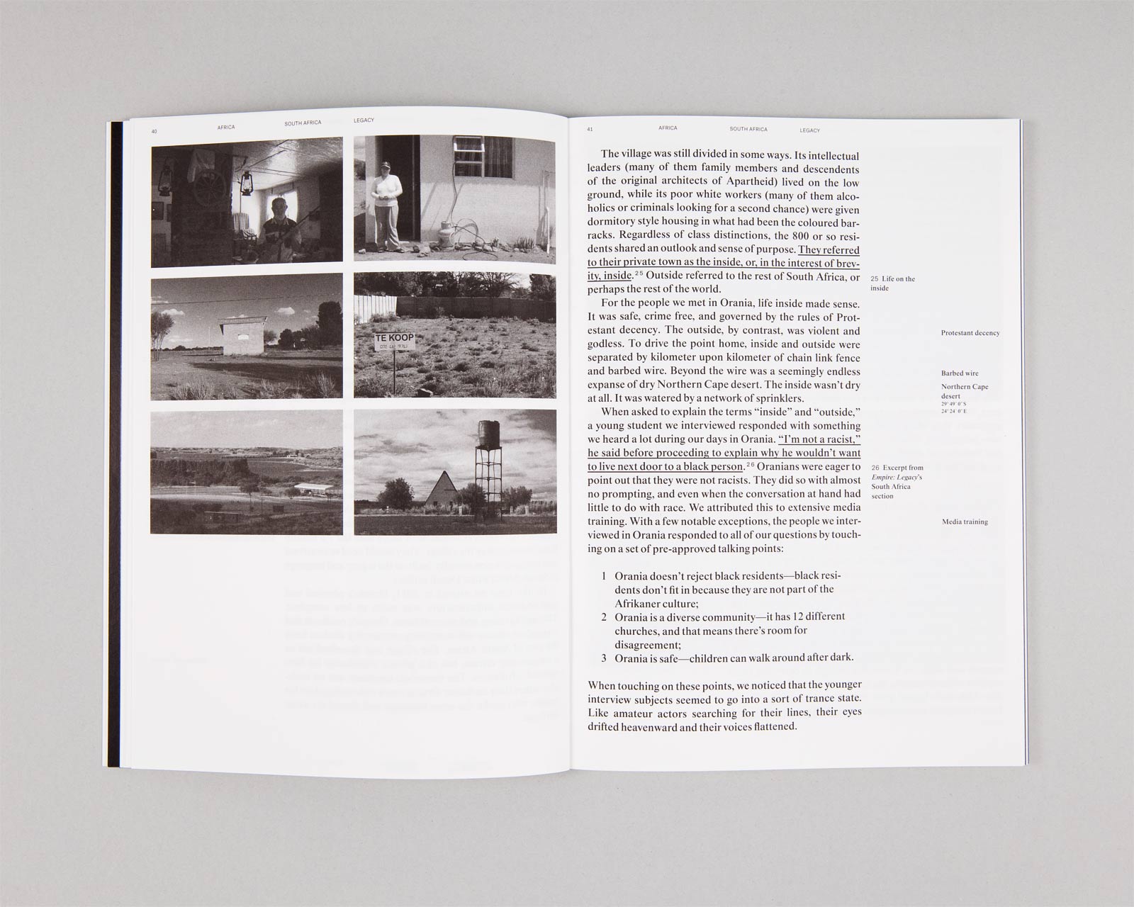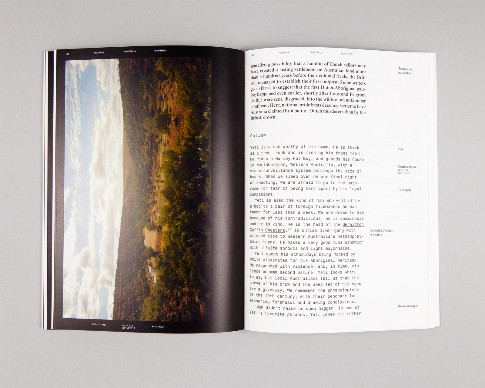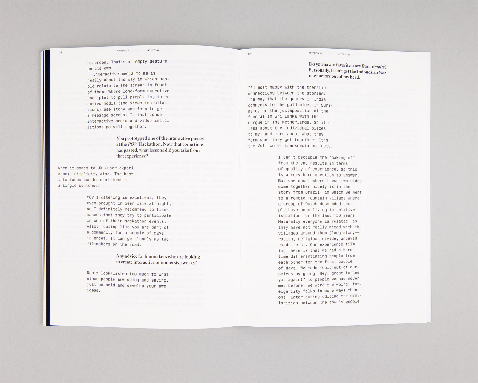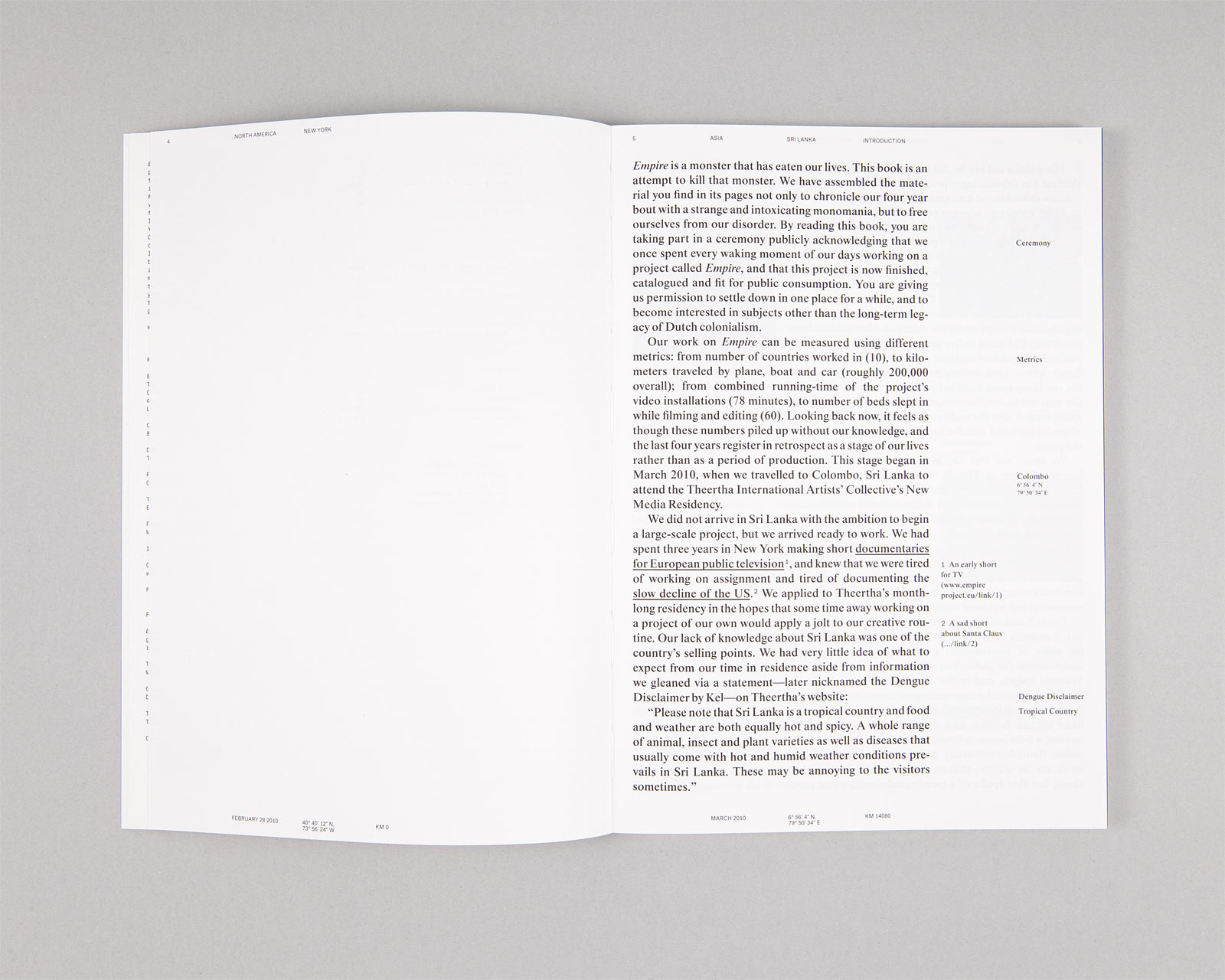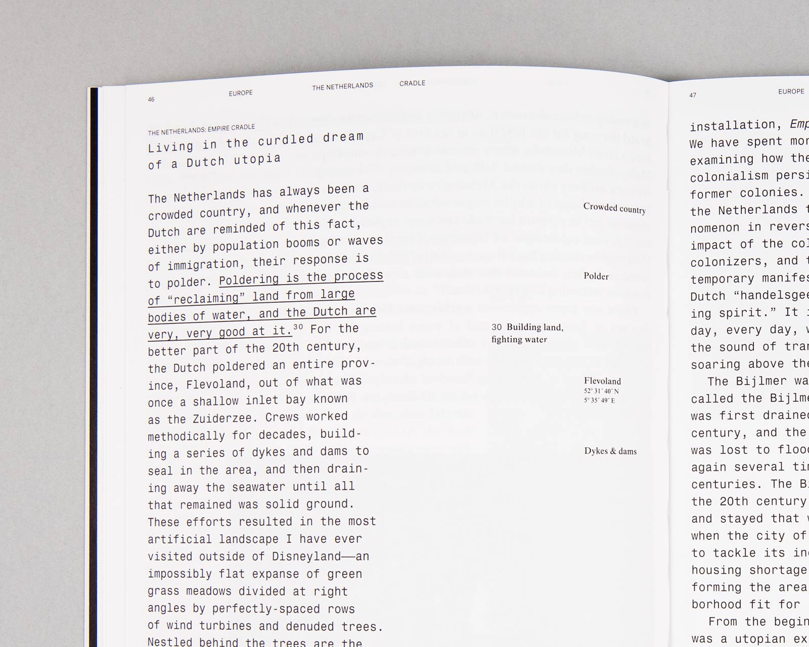 Headers and footers on every page give the reader orientation about the place, time and project that every text belongs to. Call-outs in the margins of the text work as exit cues: Further explanations in the form of web links that we asked Eline and Kel to compile specifically for this publication.
