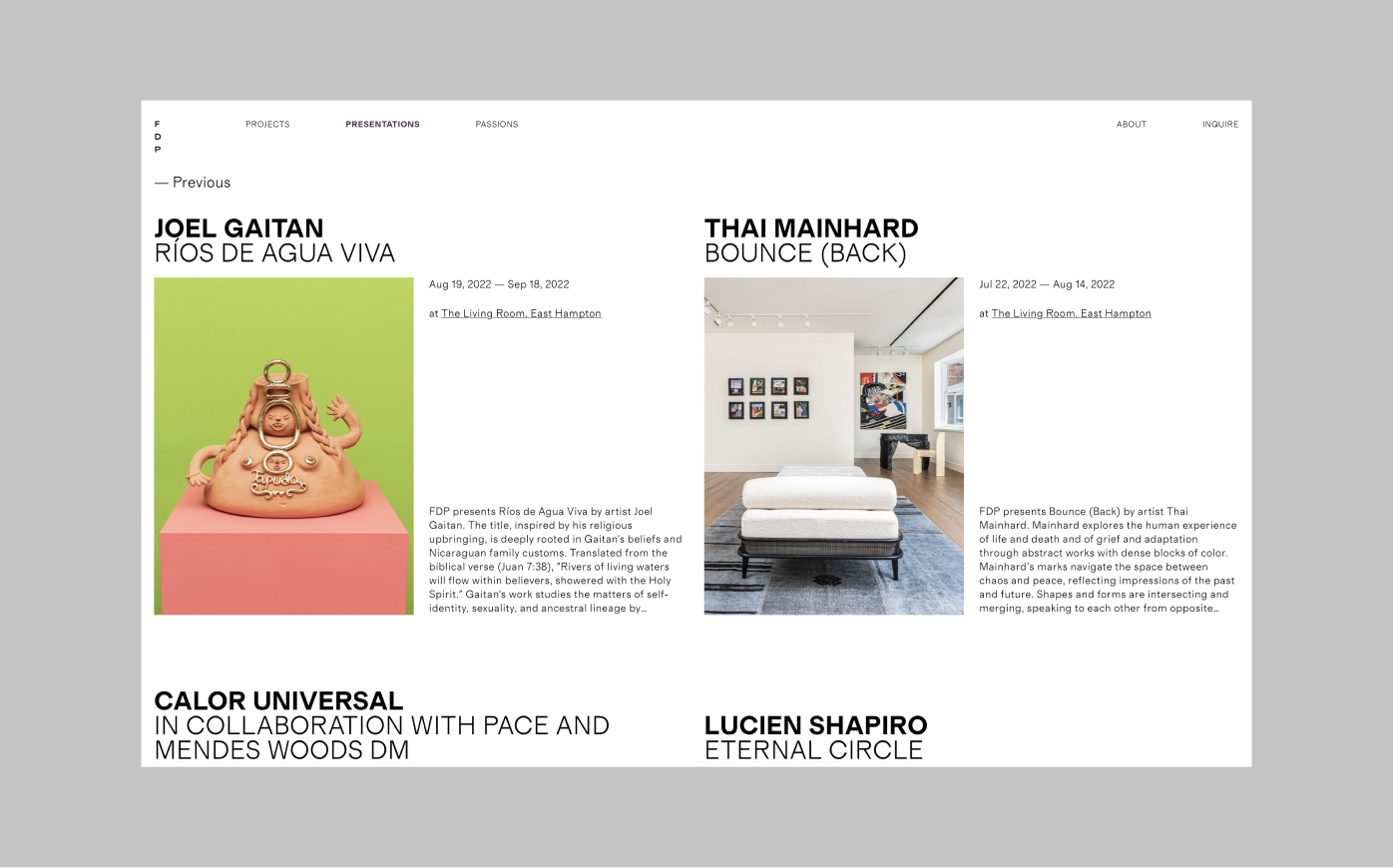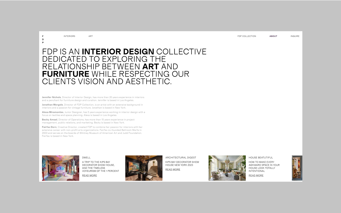 Fairfax Dorn Projects is an interior design collective that explores the intricate relationship between art and furniture. With a vision to create a dynamic exhibition space in East Hampton, they approached us to design a website that would seamlessly reflect their design ethos.