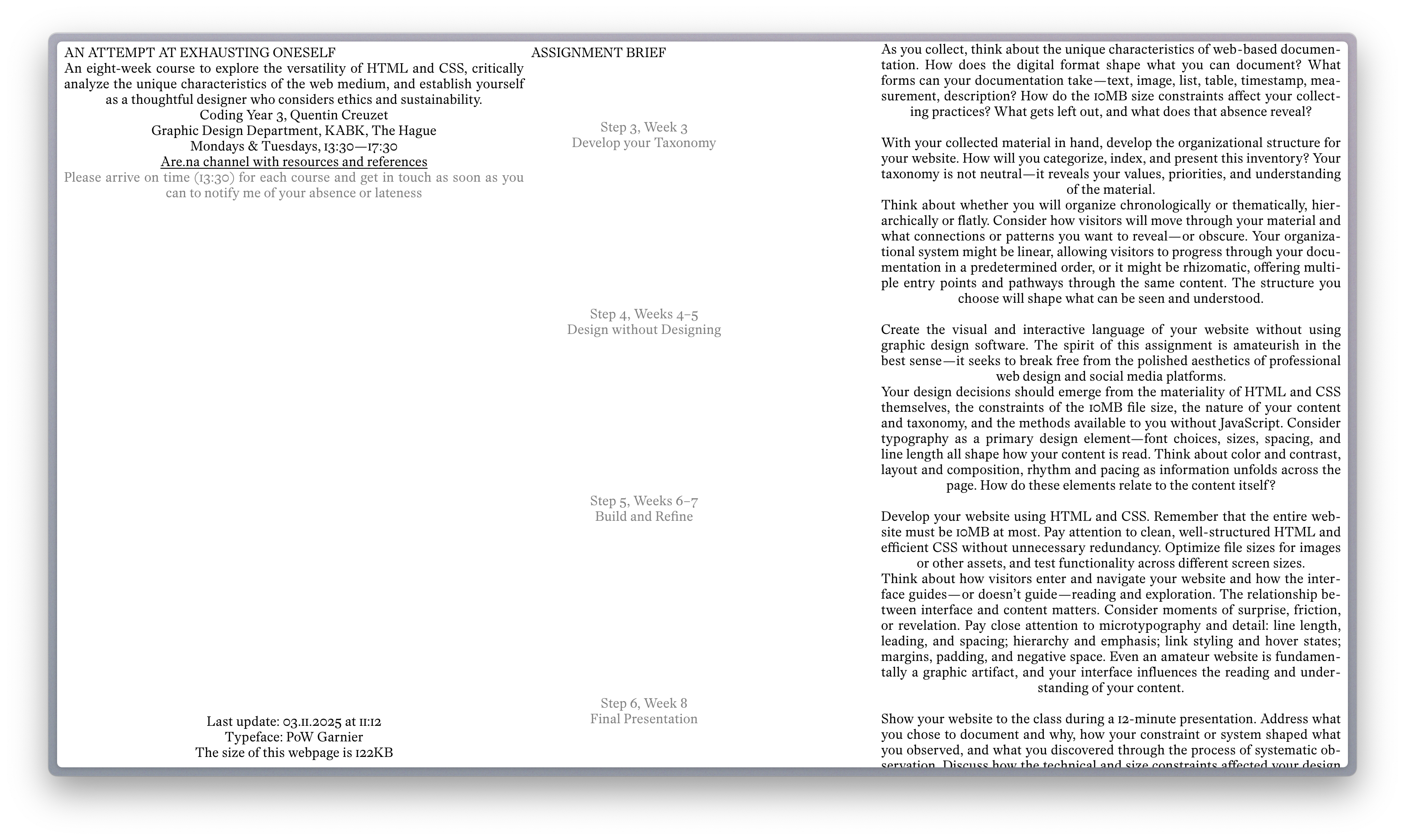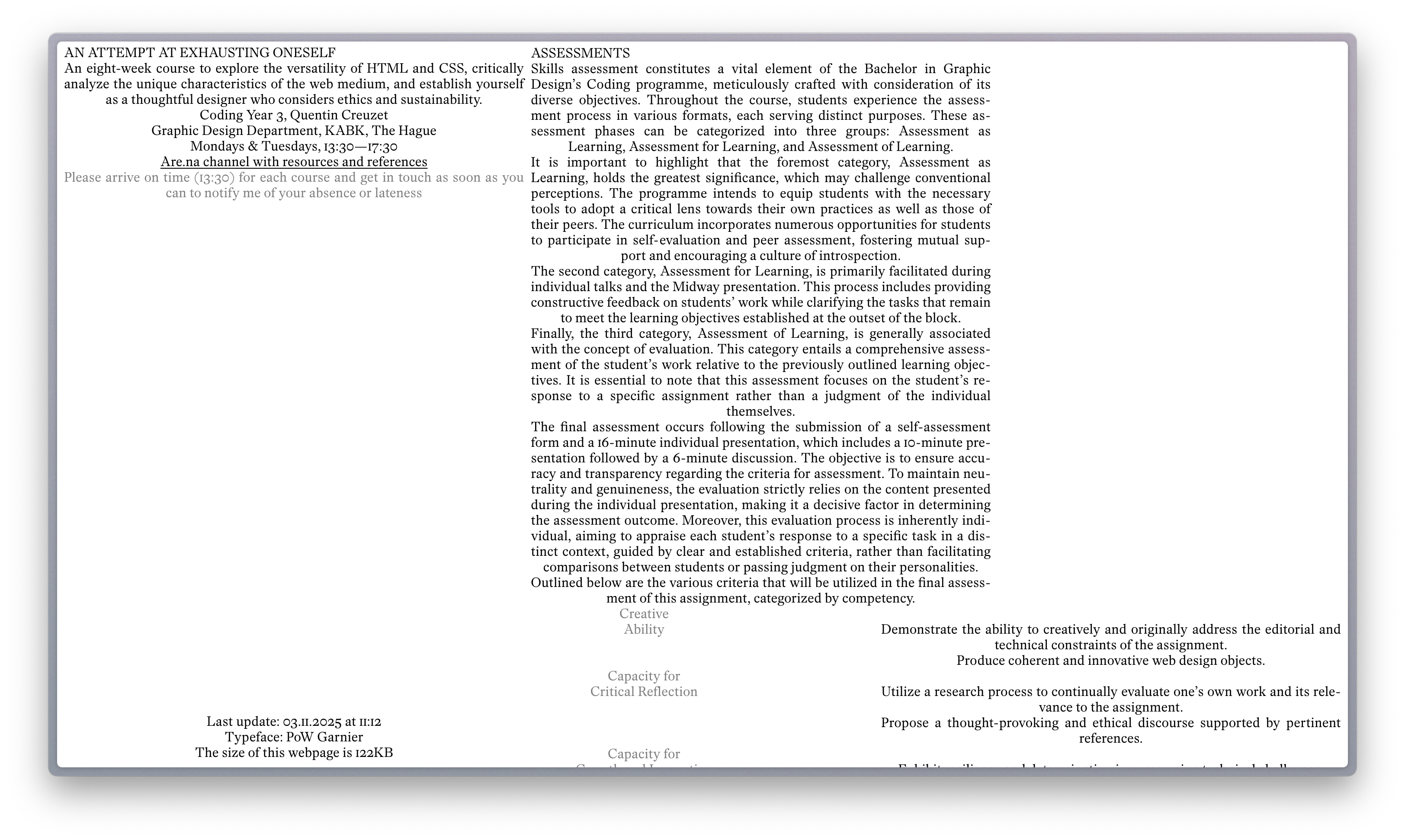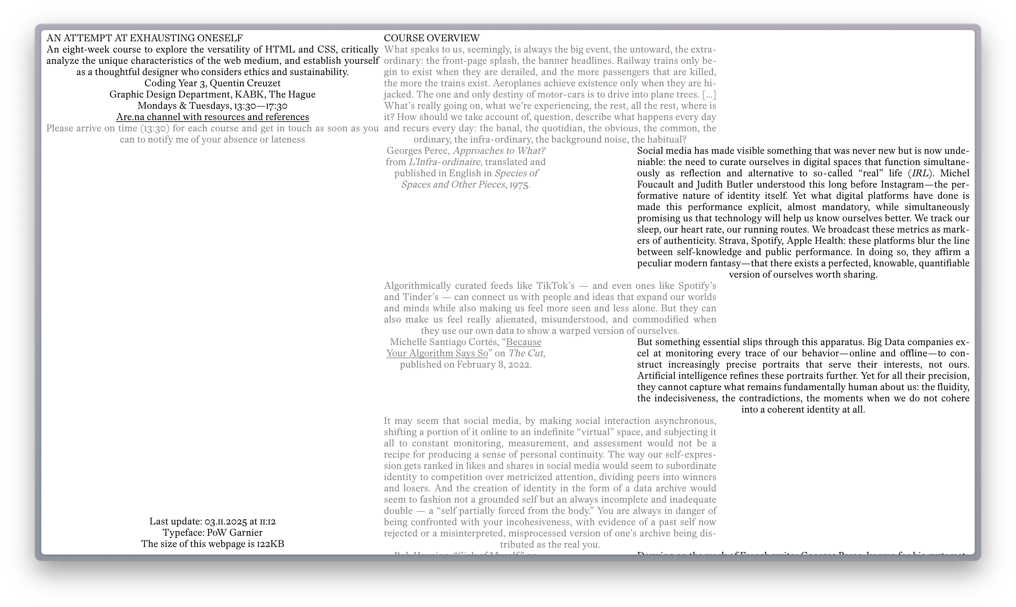 Every year, for his coding class course at KABK, professor and designer Quentin Creuzet programs a website presenting the project topic to his students. This year, the theme revolves around the infra-ordinary. This mini-website summarises the theme and specifies the schedule of the course. It also points out the learning goals.