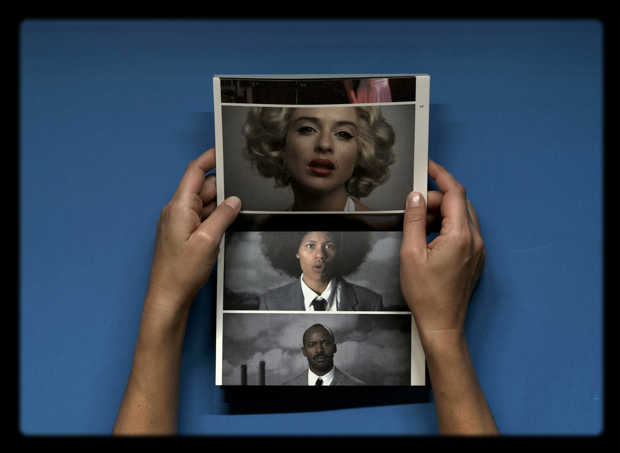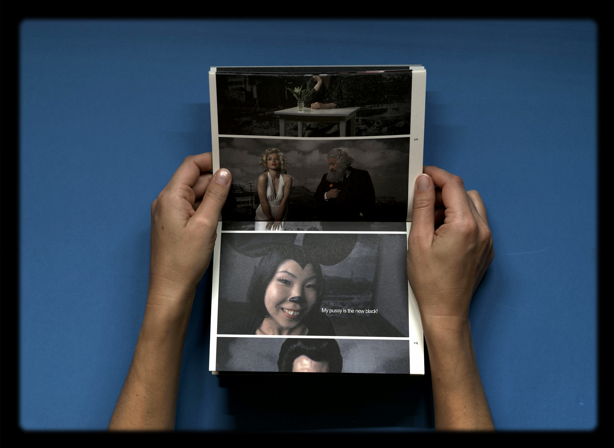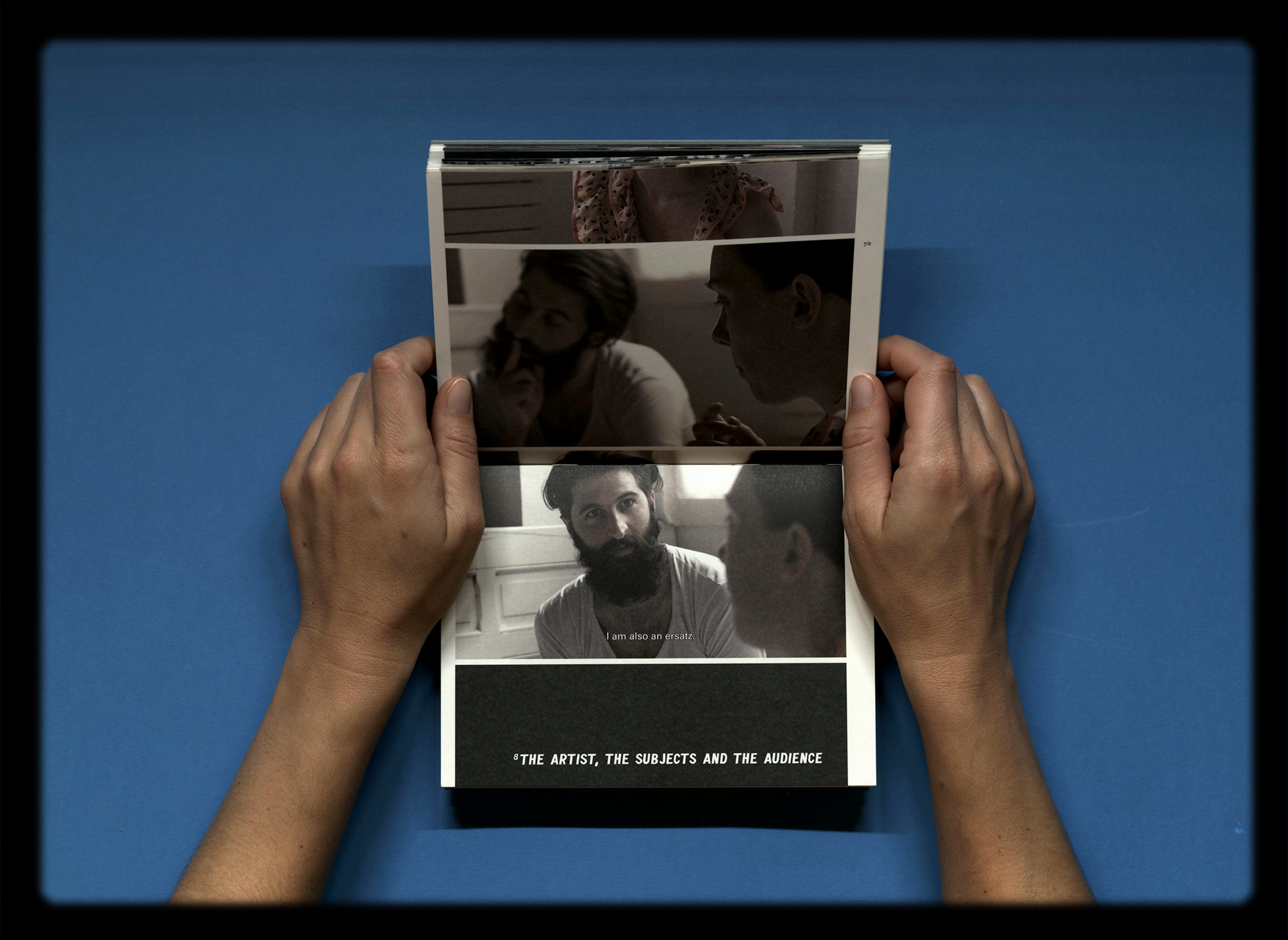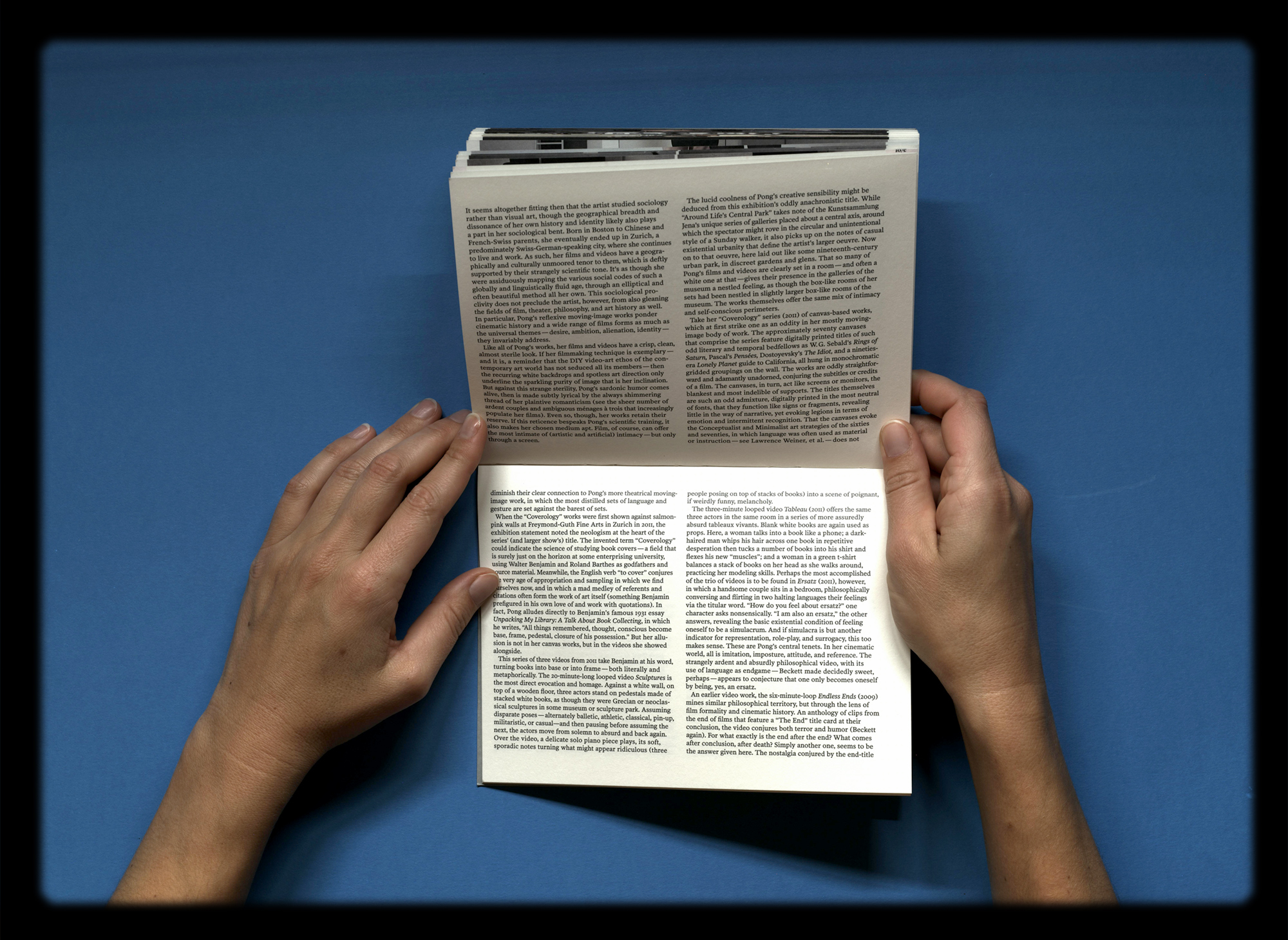 Reflecting the 16:9 and 4:3 formats of Pong’s video pieces, the selected film stills weave through the publication as a continuous visual current. Extending beyond the confines of the page, they are punctuated only by title cards that evoke the silent interruptions of early cinema.