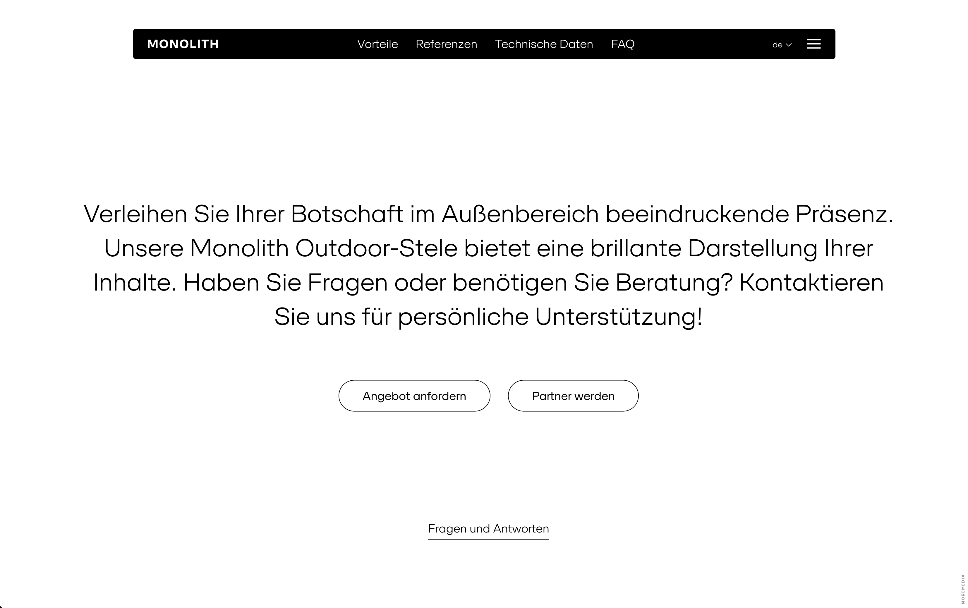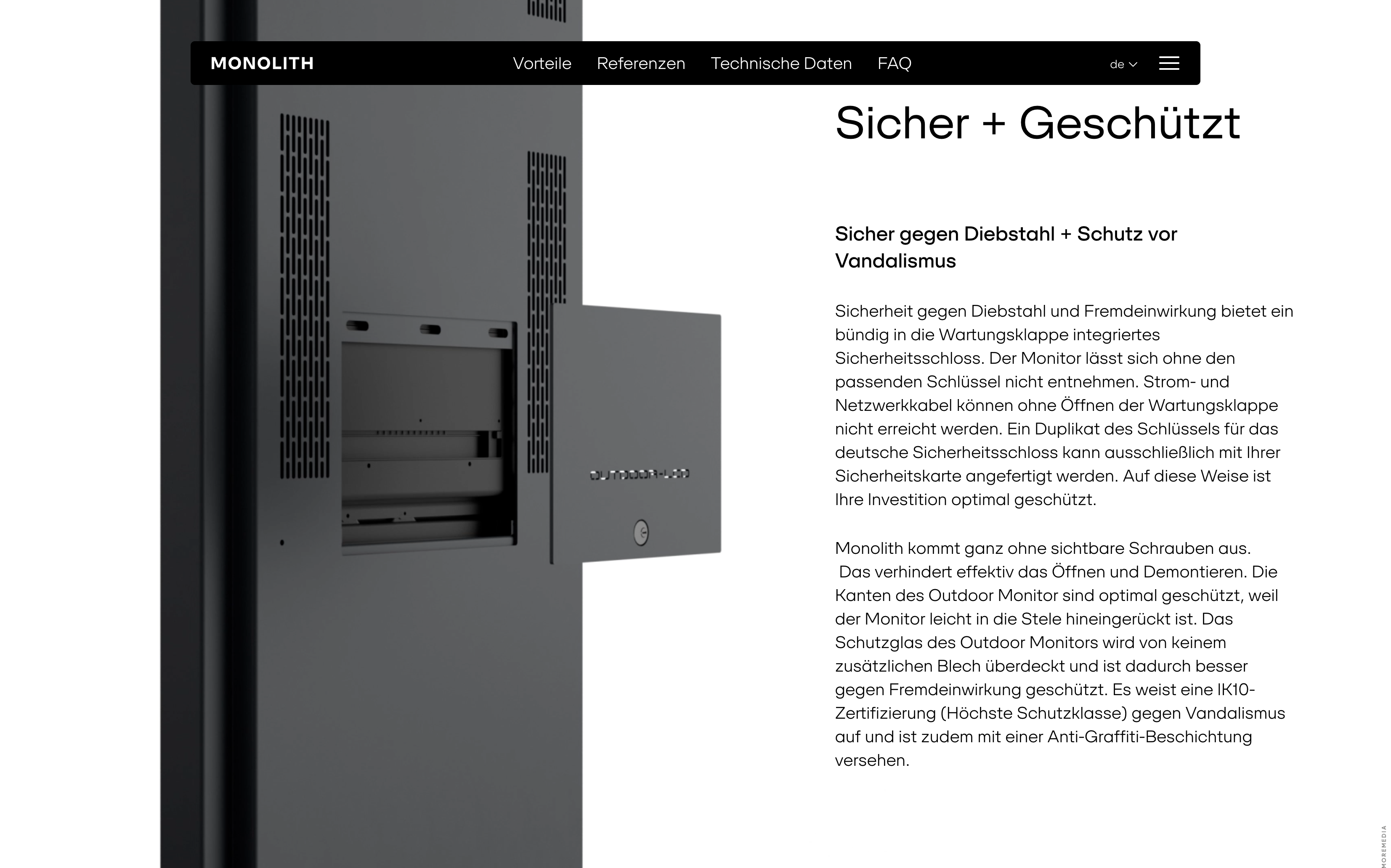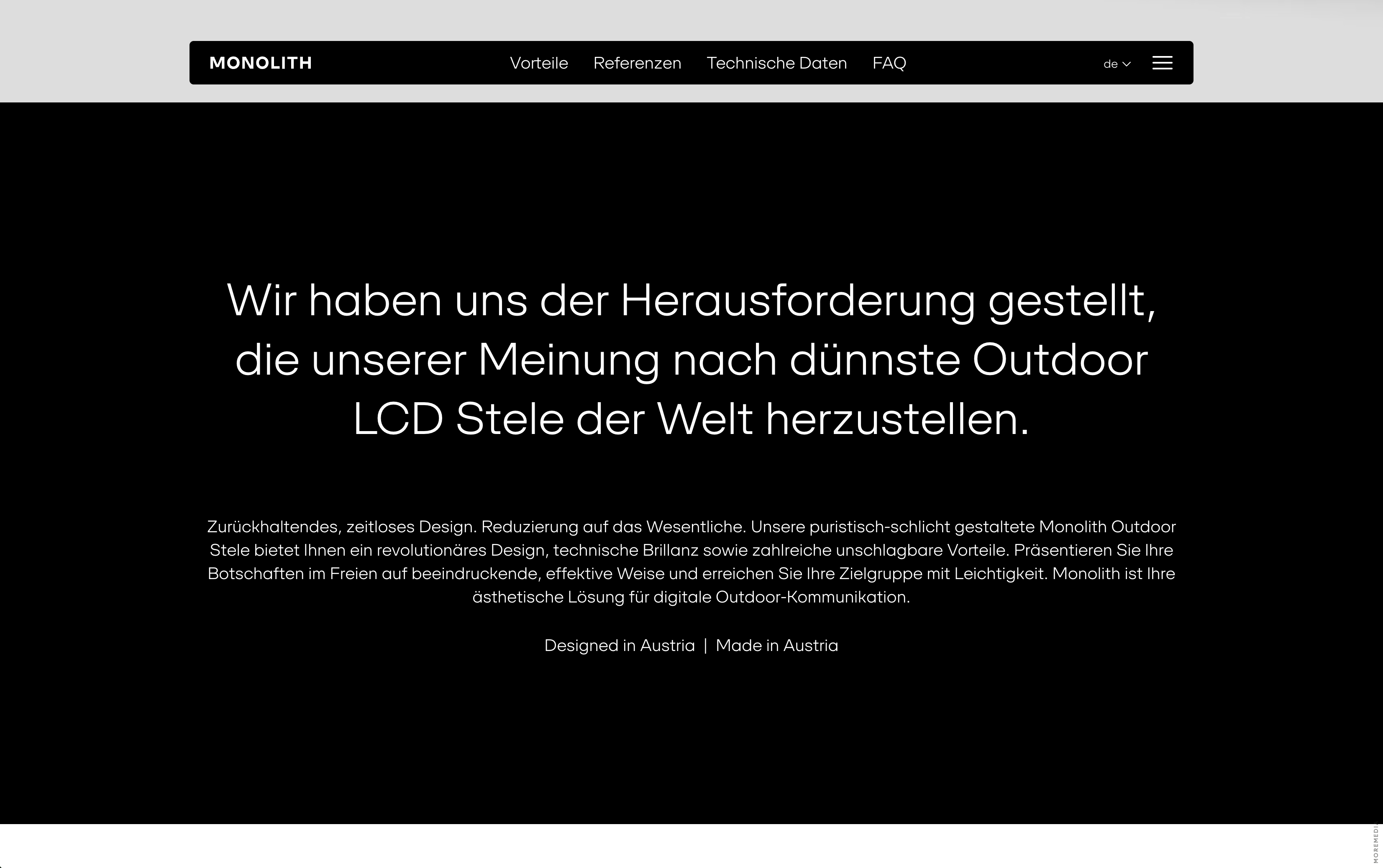 Monolith is a line of ultra-thin outdoor LCD totems designed and manufactured in Austria. The product and its website emphasize engineering precision through clean lines, modular form, and a focus on real-world advantages such as weather resistance, vandal protection, and energy efficiency.