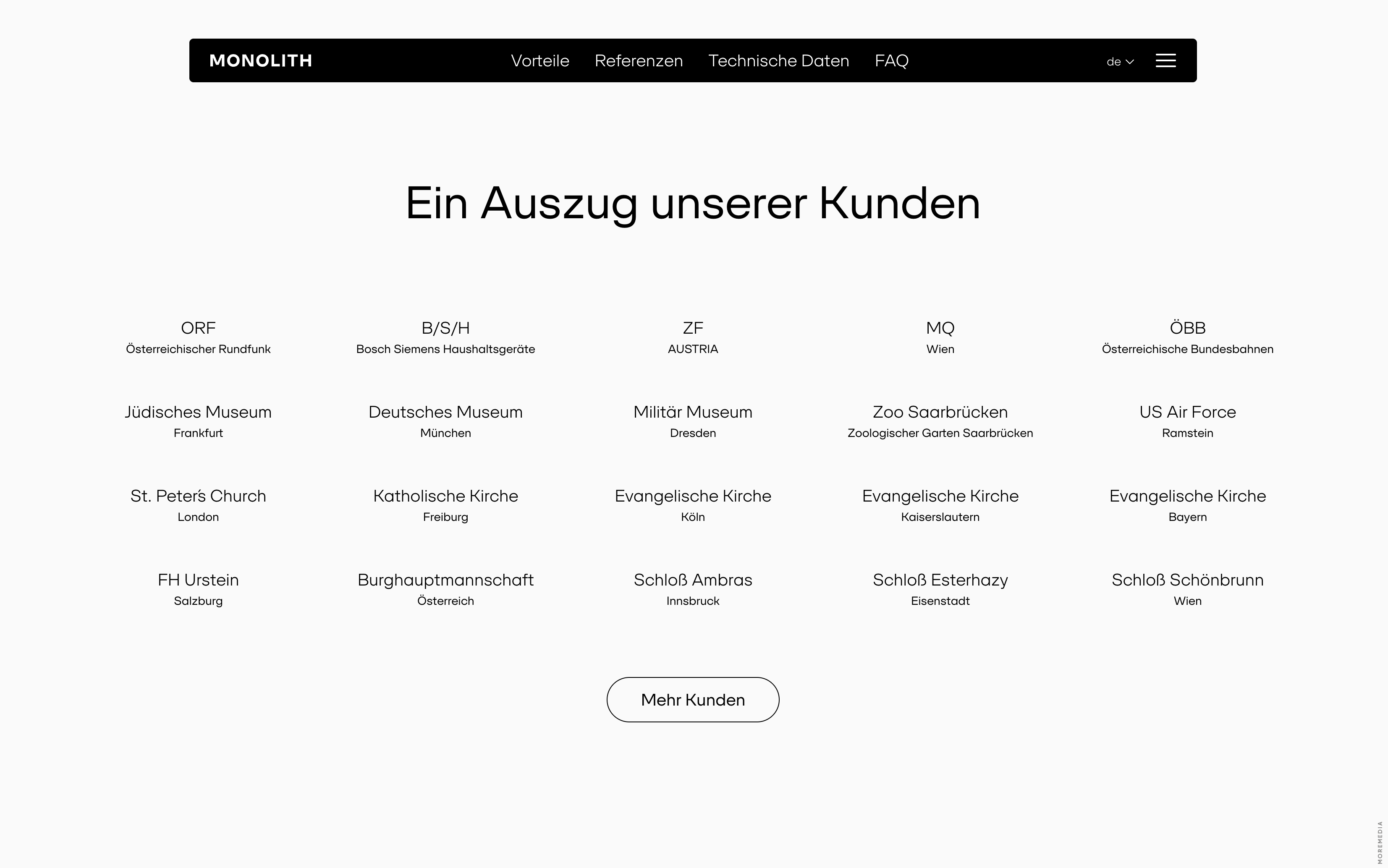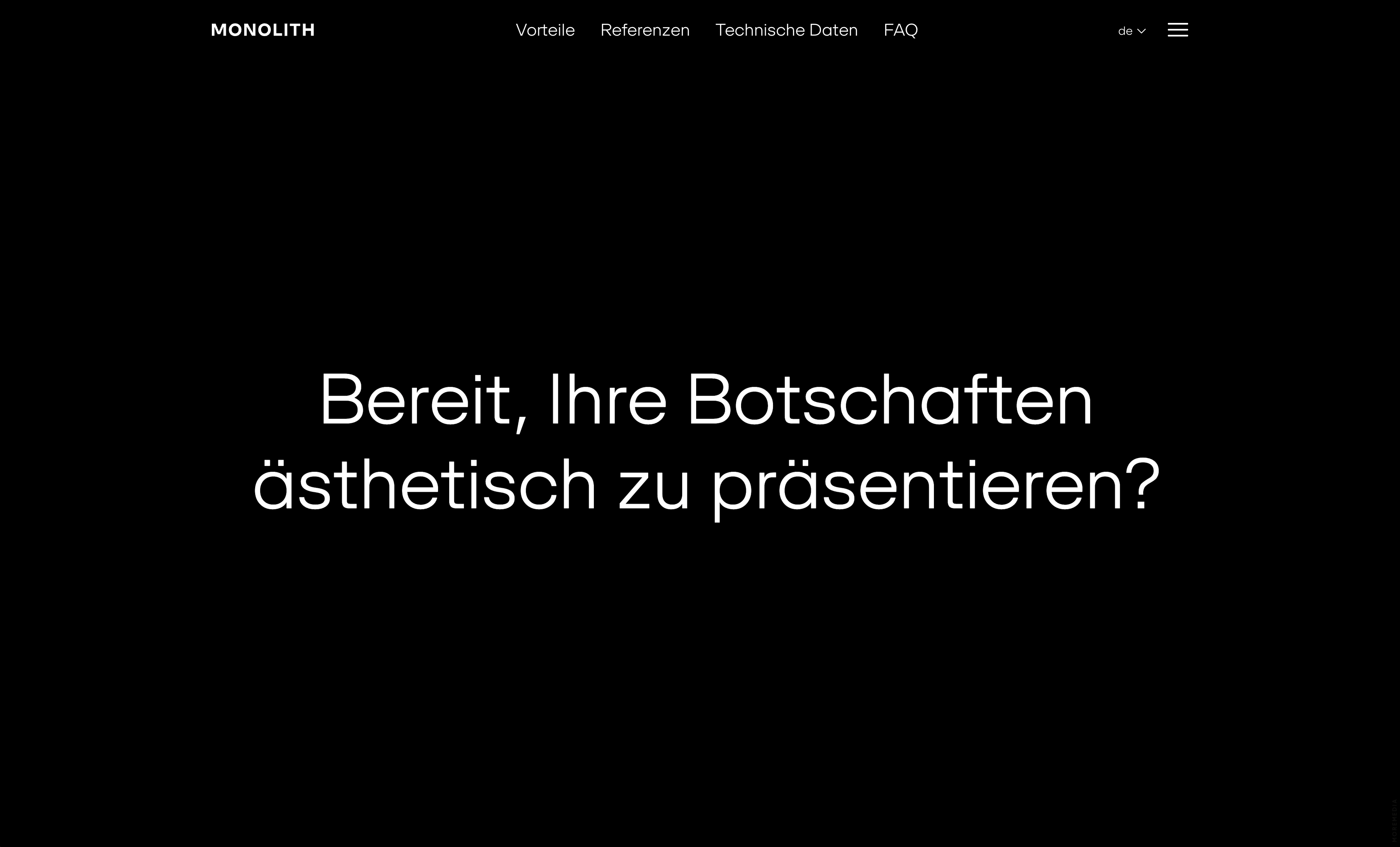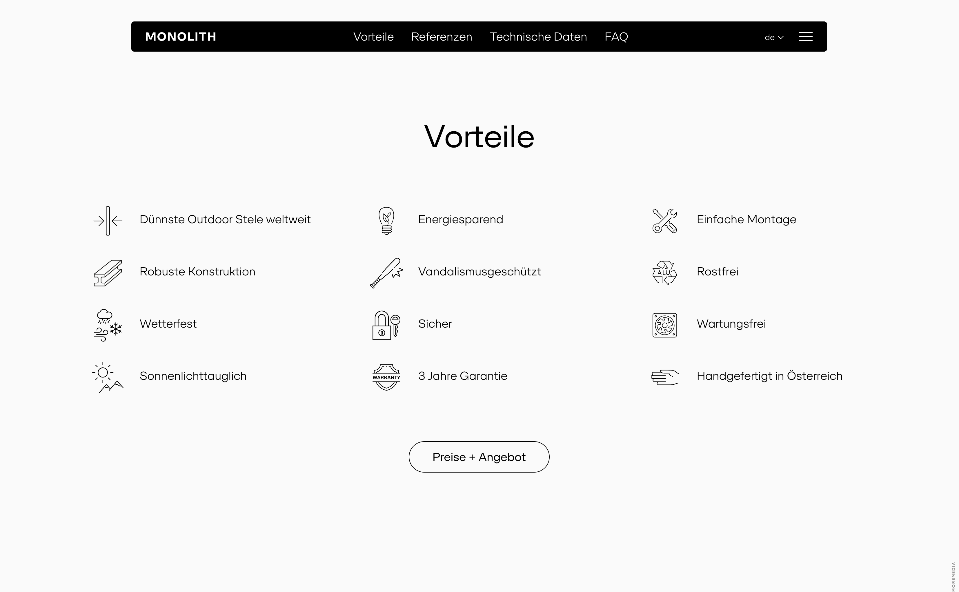 Monolith is a line of ultra-thin outdoor LCD totems designed and manufactured in Austria. The product and its website emphasize engineering precision through clean lines, modular form, and a focus on real-world advantages such as weather resistance, vandal protection, and energy efficiency.