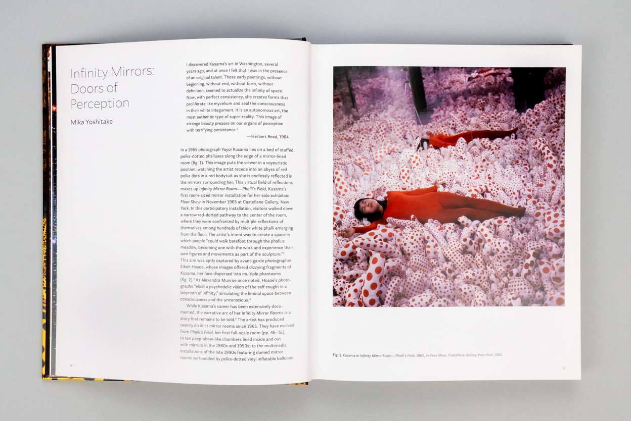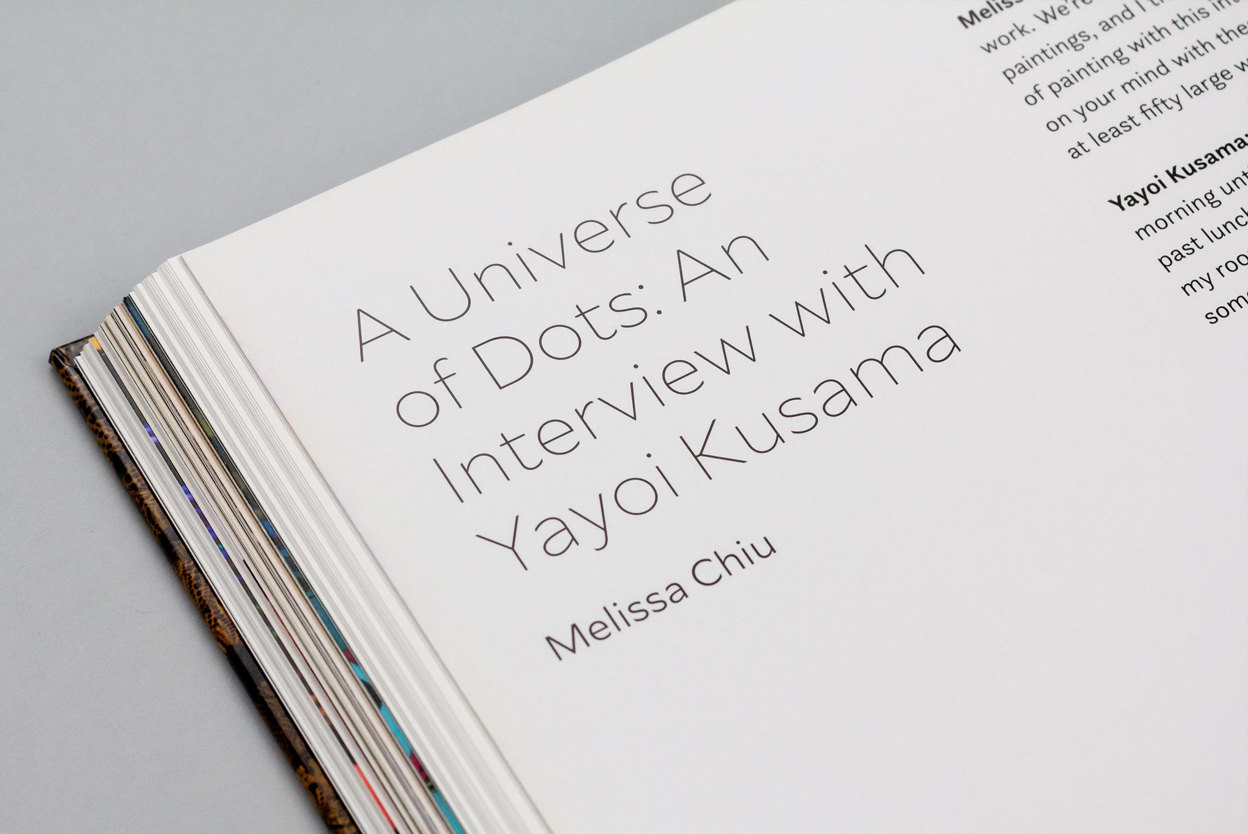 Mallory by Frere-Jones Type is the typeface used for Yayoi Kusama: Infinity Mirrors, designed by Miko McGinty. Published by the Smithsonian’s Hirshhorn Museum and Sculpture Garden and DelMonico Books, this is the first publication to focus on Yayoi Kusama’s Infinity Mirror Rooms.