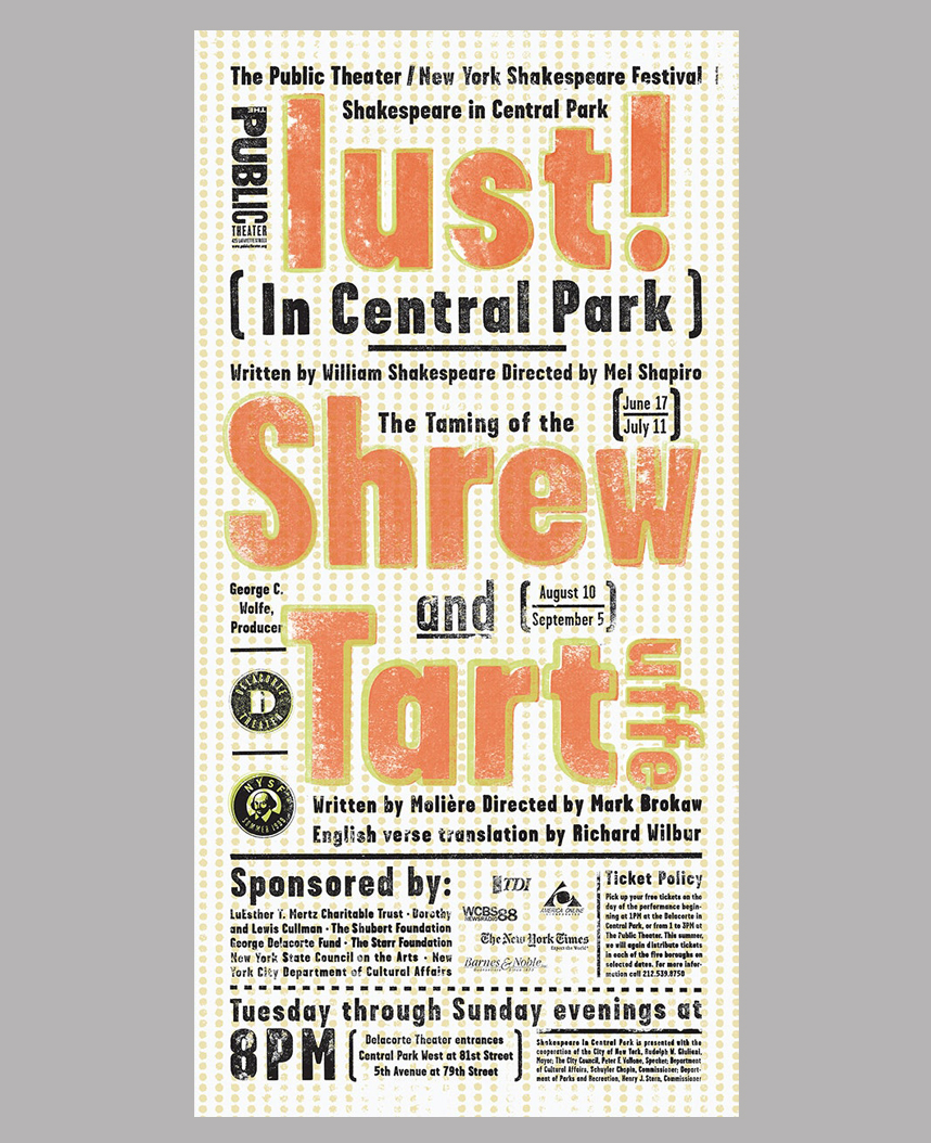 Shakespeare’s Taming of the Shrew was presented by the New York Shakespeare Festival/Public Theater at the Delacorte Theater in Central Park from August 10th through September 5th, 1999, together with Molière’s Tartuffe.