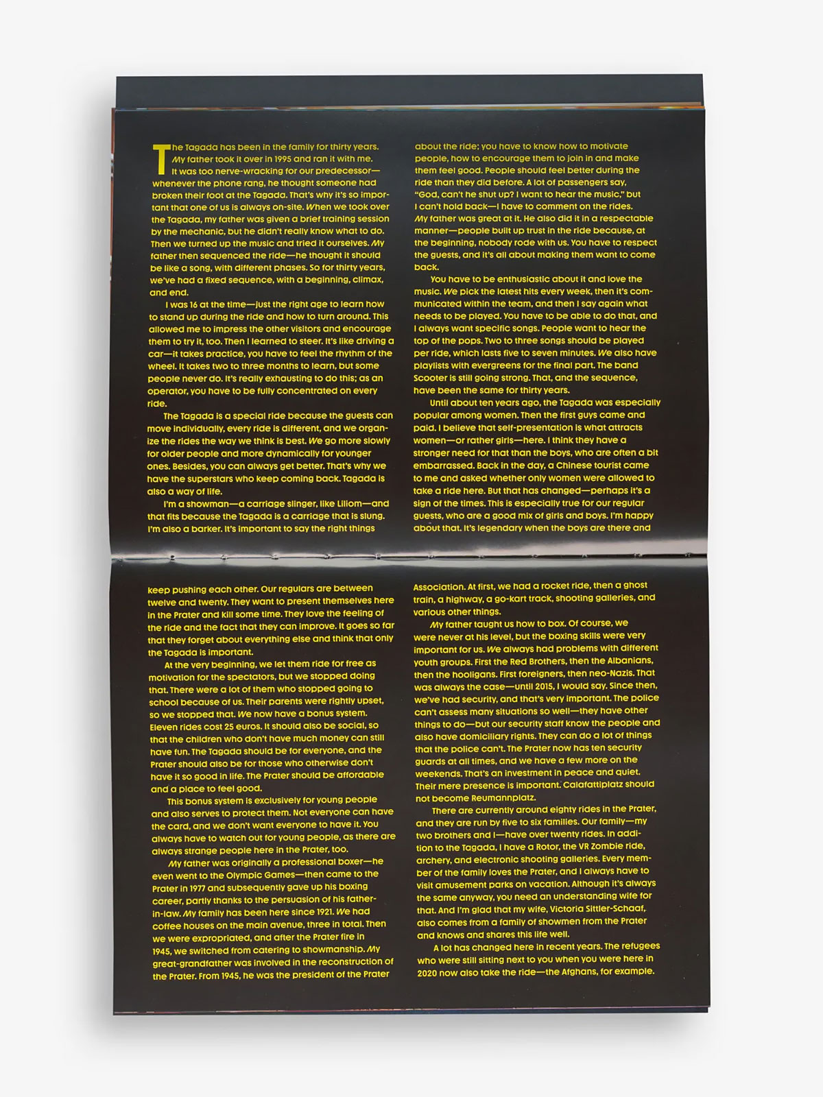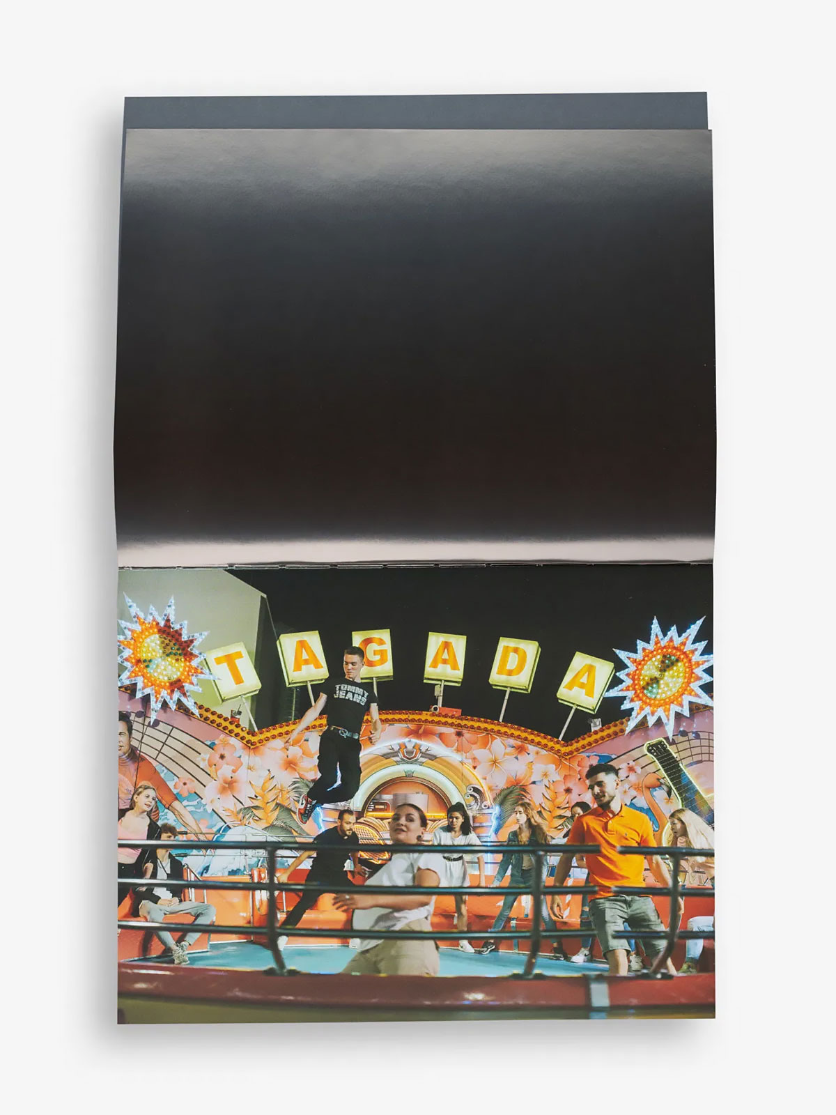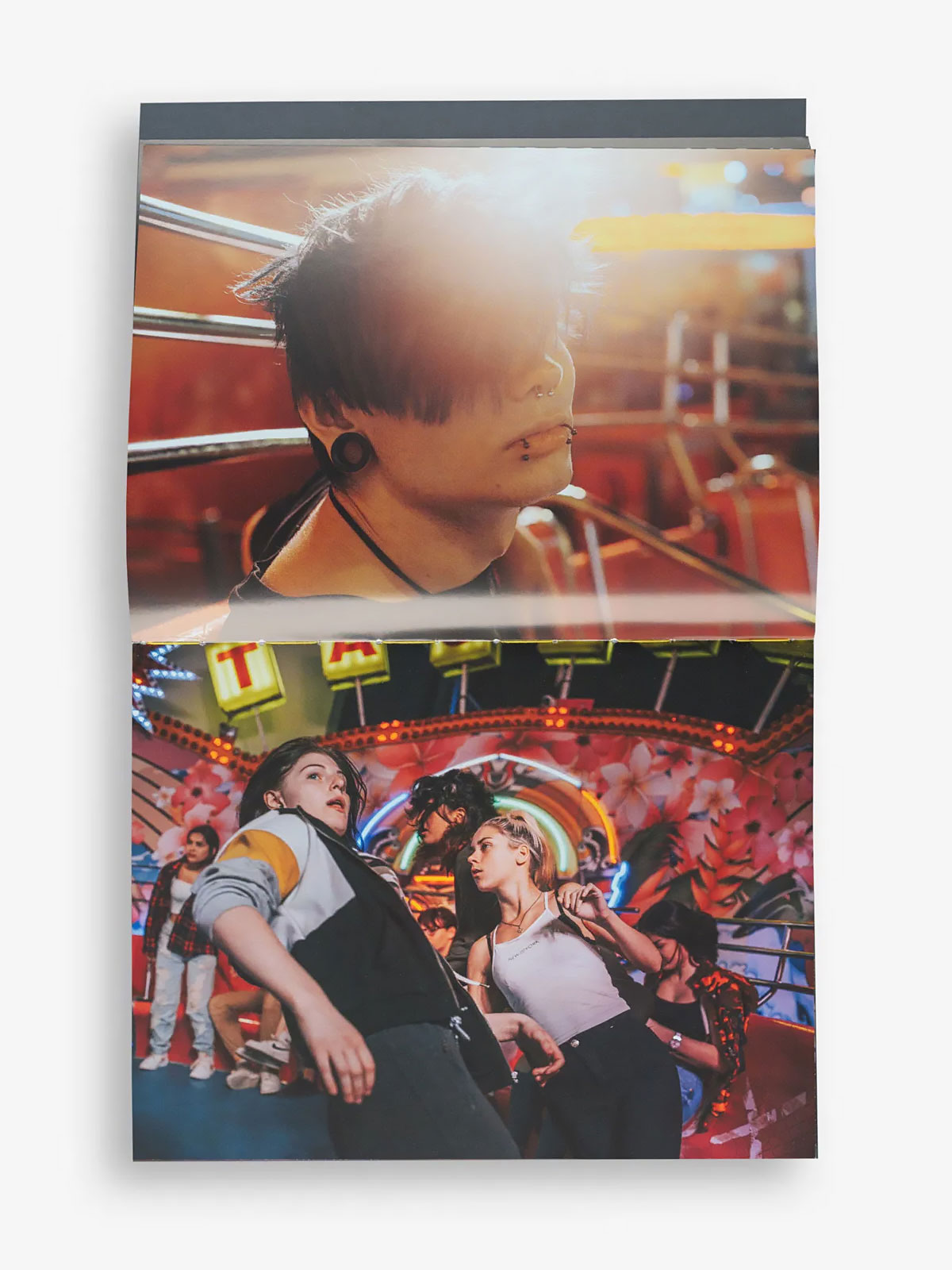 The title uses a modified FF DIN Round, inspired by the neon lettering on TAGADA’s ticket booth. Body and ancillary text are set in AC Youth from AllCaps, whose late-’80s energy we felt was ideal for the project’s funpark vibe.