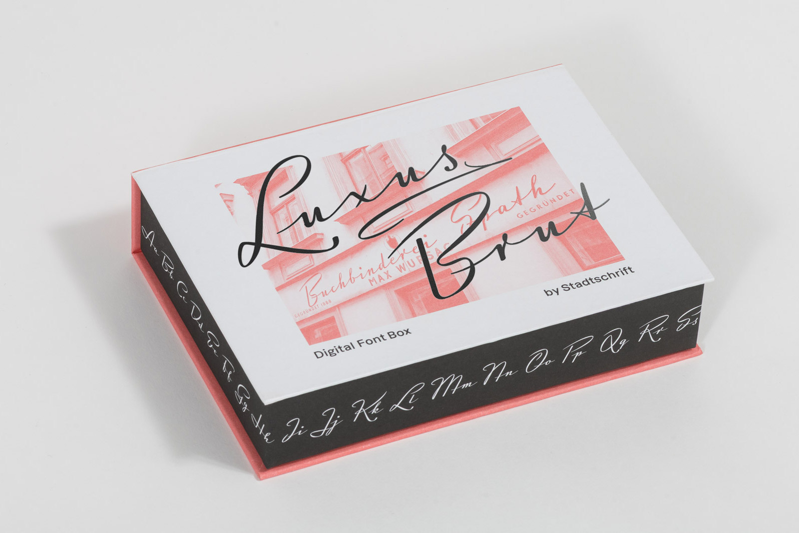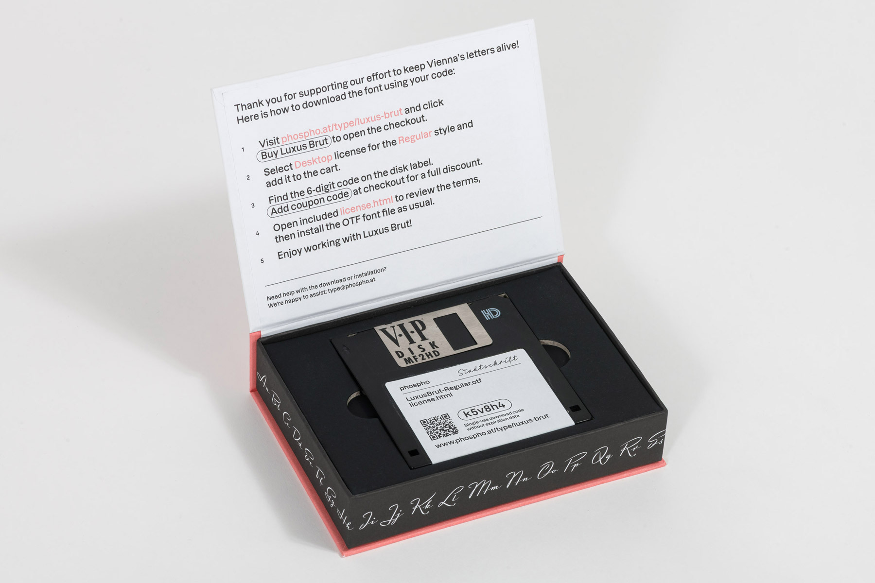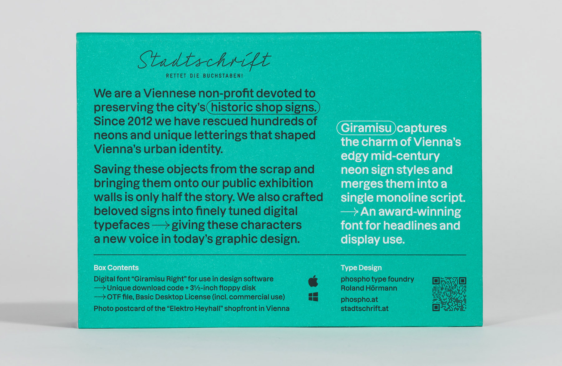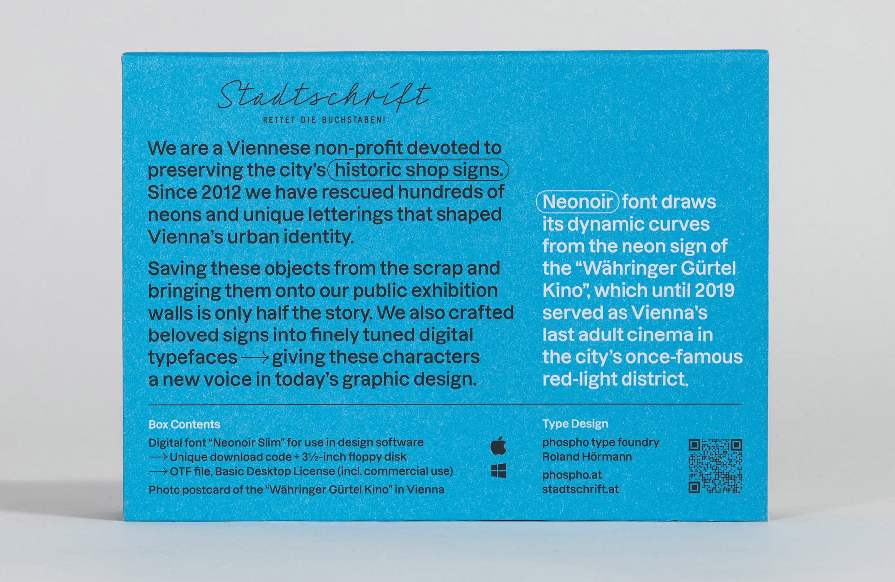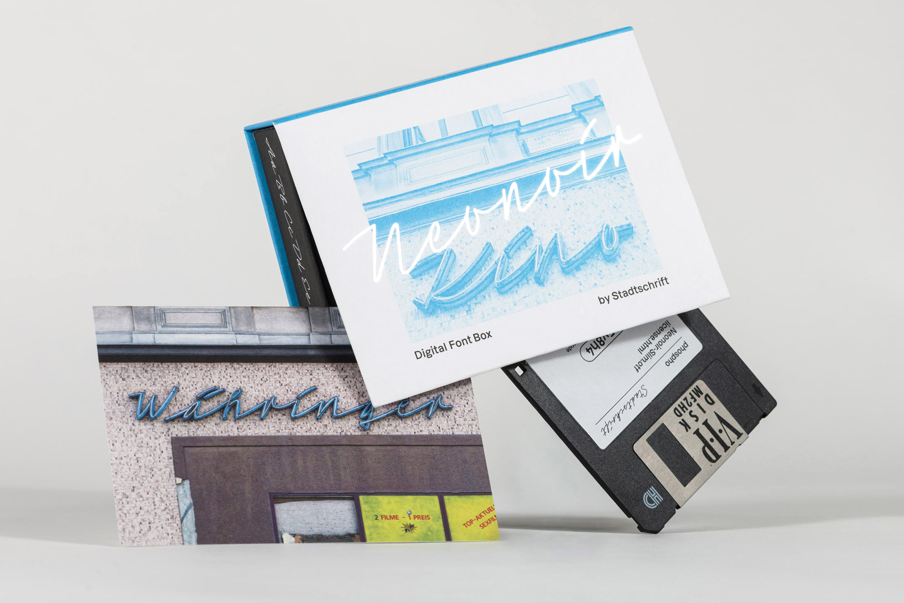 In collaboration with Stadtschrift – Vienna’s association dedicated to preserving urban lettering – these typefaces appear in a small-edition series: each box contains a unique download code together with a postcard showing the respective façade, neatly packaged as a collectible object, with the boxes themselves typeset in Dazzed. The 3.5″ floppy disk is a playful nod to how fonts were sold before the rise of the internet. The font boxes are intended to be discovered in museum shops and concept stores in Vienna.
