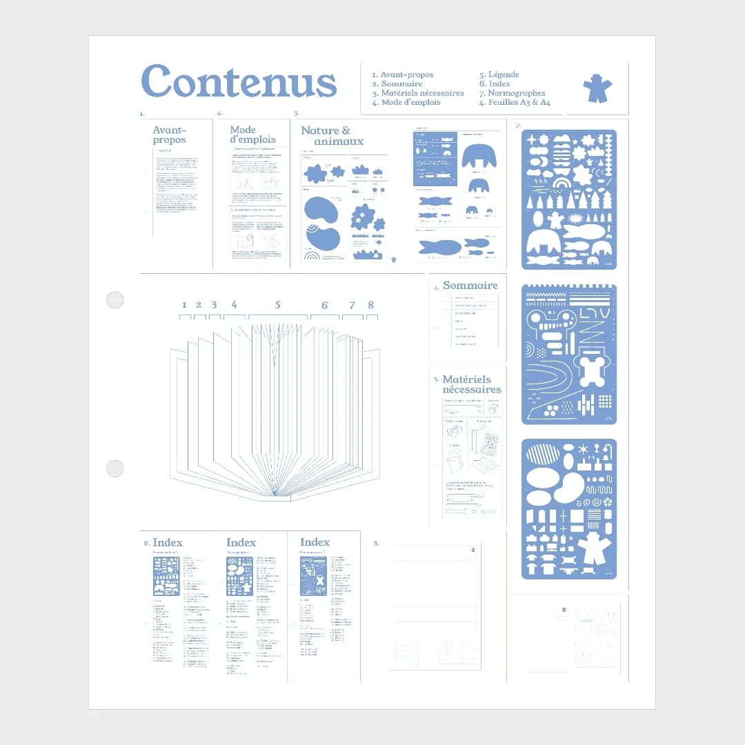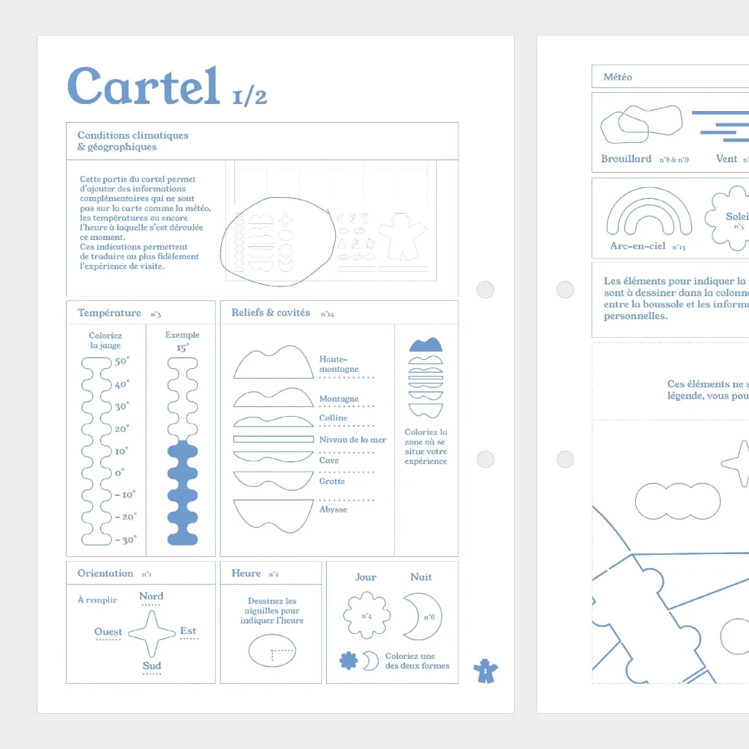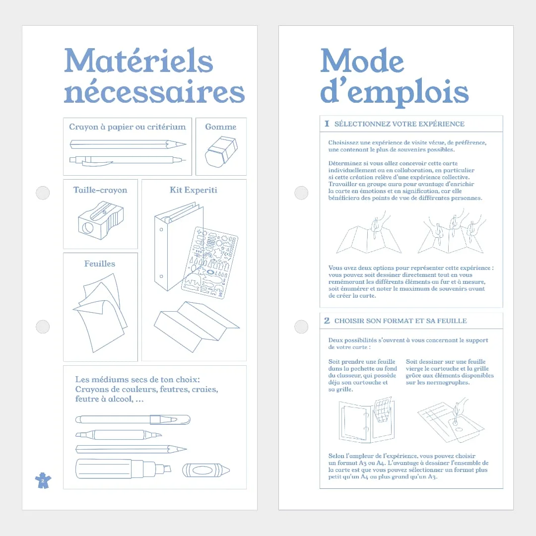 Experiti was made as a student project at École Estienne, Paris. It’s a kit composed of a binder and a set of three drawing templates, designed to map any kind of visiting experience: museum visits, forest walks, visits to a family member’s home, and more. The binder notably includes an instruction manual and a detailed legend, providing users with precise guidelines to help them create their own maps. The kit also contains various sheets for drawing, as well as a label to be filled in.