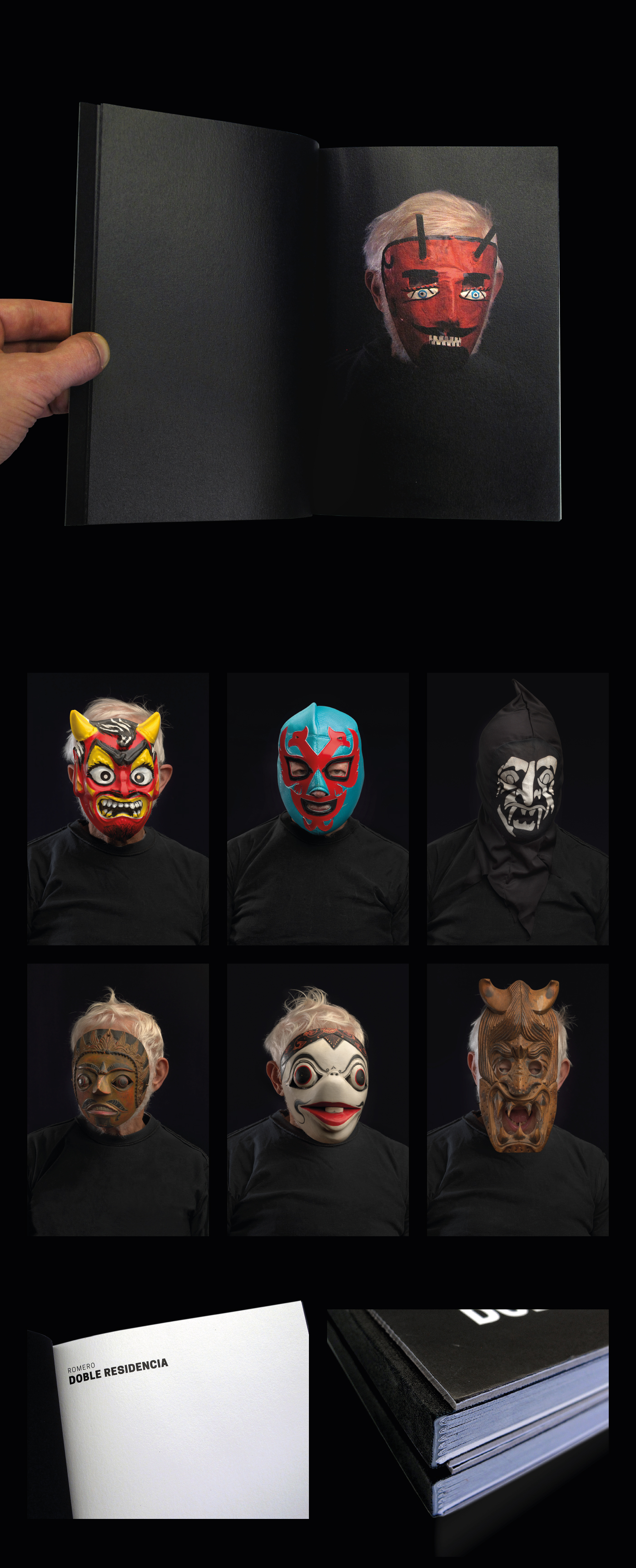 Doble Residencia (“Dual Residence“) is a striking book of images. It is a reflection on the human face and the duality conferred by the mask or, ultimately, on the duality shown by the mirror looking the face with or without the mask.