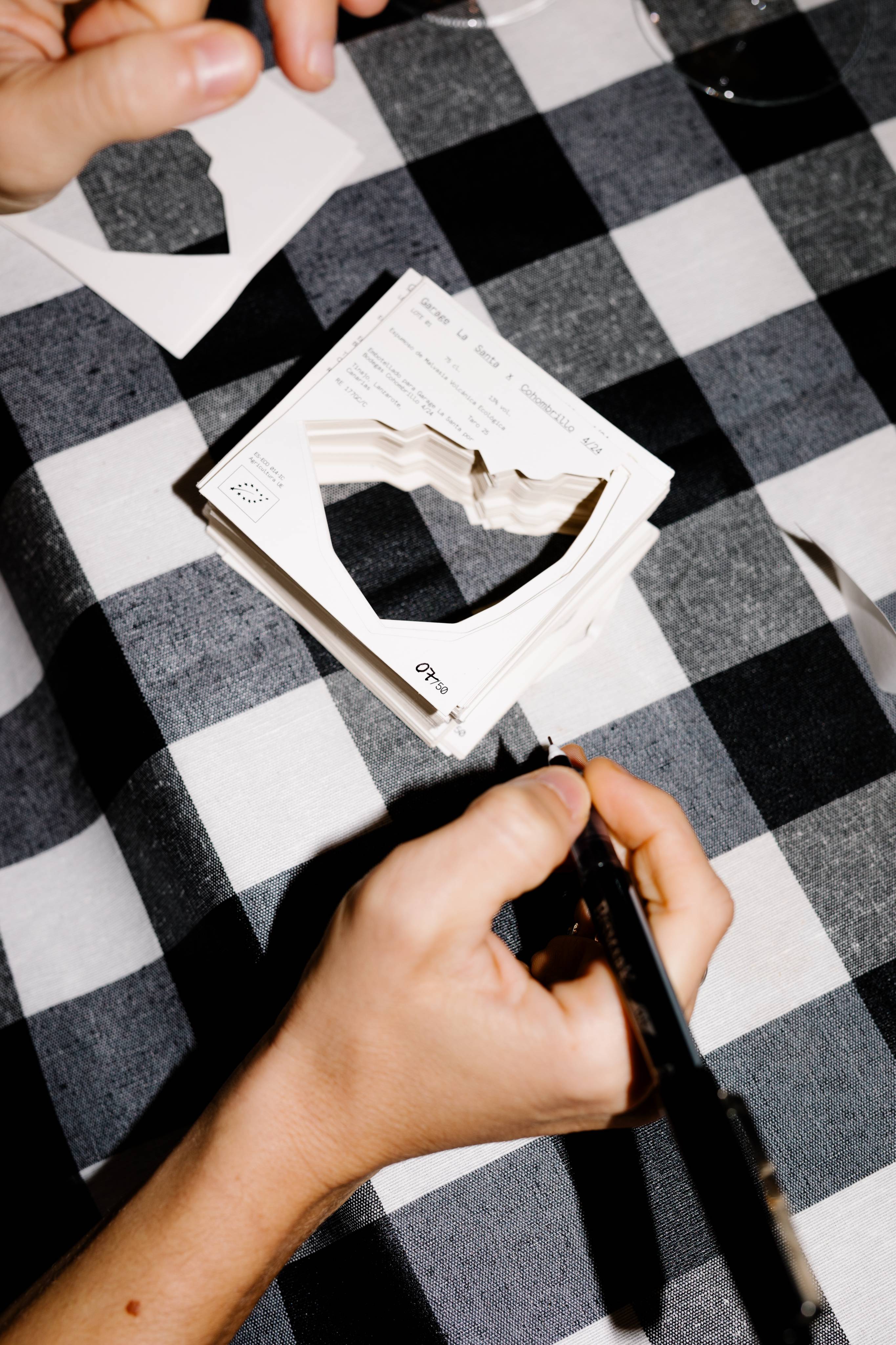 The multi-varietal wine was made mainly from Malvasía Volcánica grapes grown on two-hundred year old vines from La Geria-Lanzarote. The labels were printed on Fedrigoni Nature Touch Class 193 g/m², and the text is set in La Santa’s brand typeface Aperçu Mono.