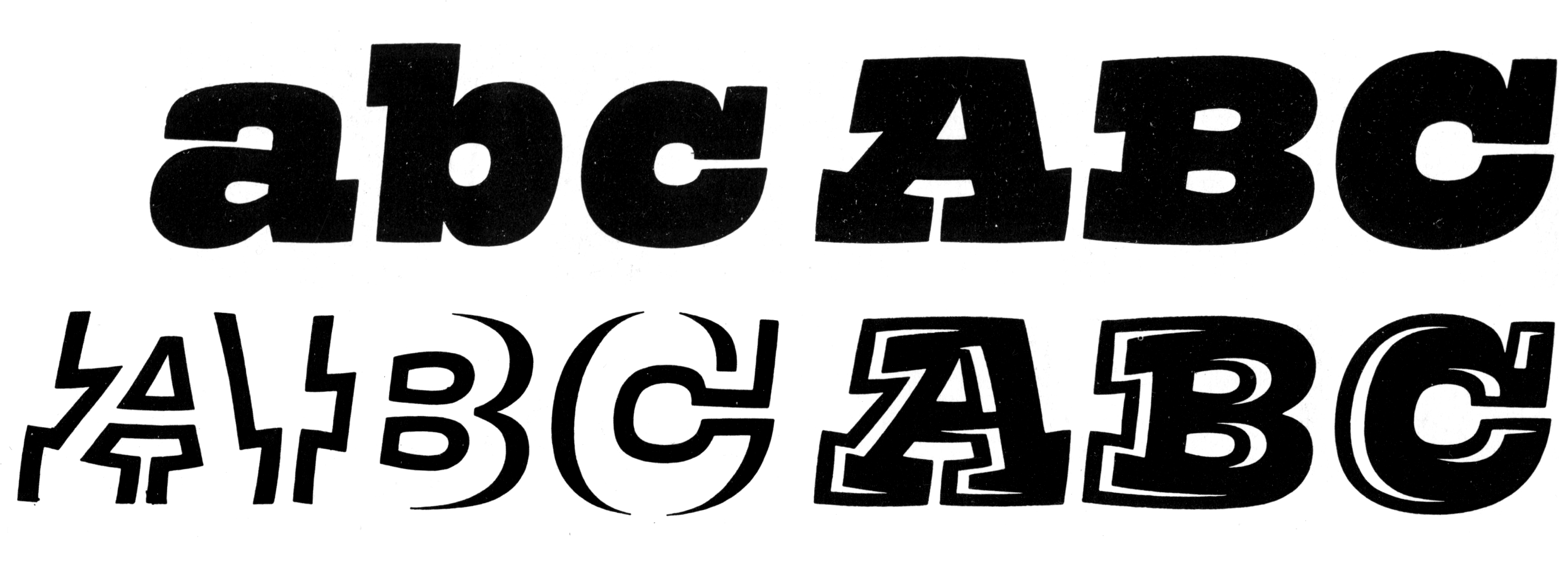 Composite image showing letters from the “alphabet in the style of an italic Egyptienne” (top row) and two sets of decorative capitals derived from it (bottom row) by Volker Küster, 1966, from Hildegard Korger’s Schrift und Schreiben, VEB Fachbuchverlag Leipzig, 1972 (5th edition: 1982)