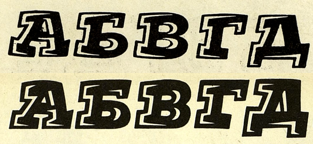 Details from two Cyrillic adaptations of Küster’s all-caps highlight style, reproduced in Шрифт from 1975 (top) and Декоративные шрифты from 1987 (bottom). The latter is credited to Oleh Snarsky.