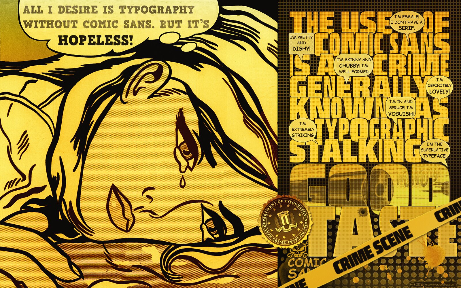 The speech bubble on the sad woman’s image – a riff on Roy Lichtenstein’s Hopeless painting from 1963, which in turn is derived from a panel drawn by Tony Abruzzo for the story “Run For Love!” in Secret Hearts no. 83 (November 1962) – uses HVD Comic Serif (HvD Fonts). Text on the right side is in Bumper, the extra-heavy-duty industrial sans serif also made by HvD Fonts, while smaller speech bubbles on the right side of it are using Comic Sans.