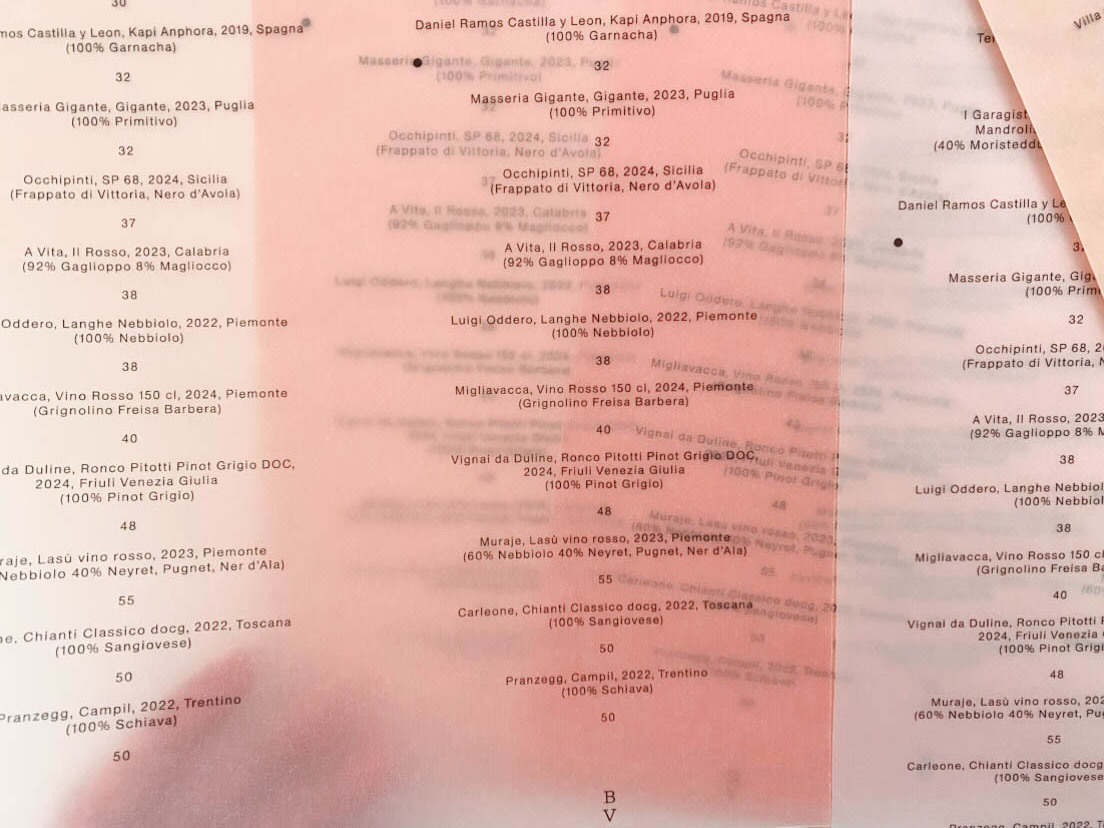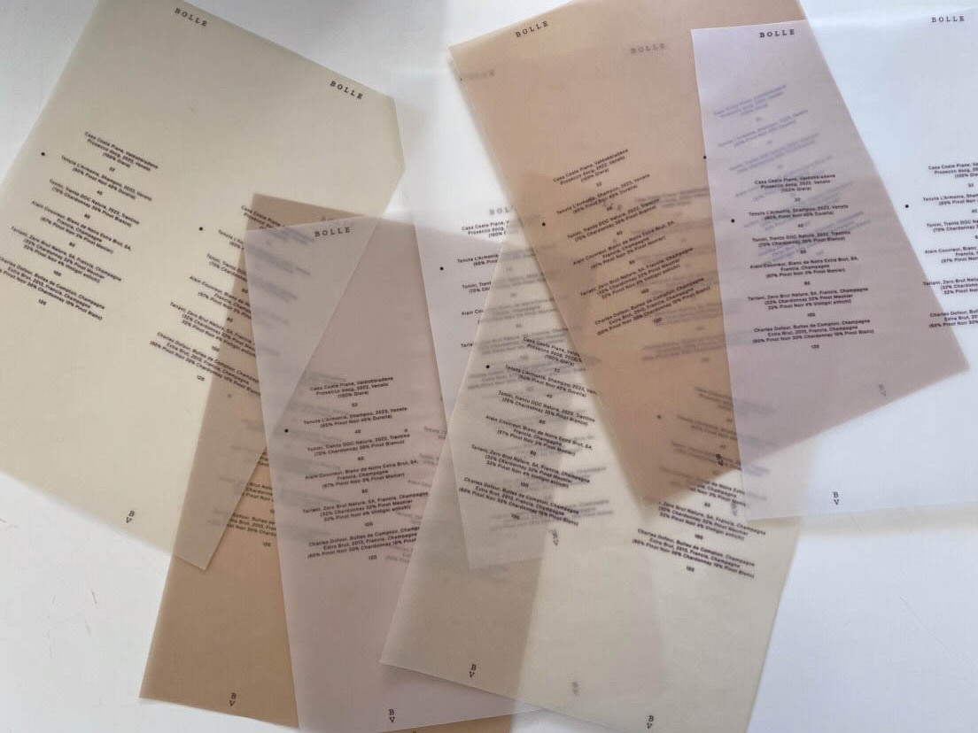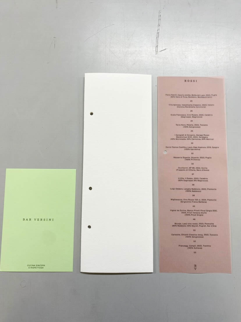 The project uses different kind of papers: colored and tracing papers to print the menus. The richness and diversity of the papers creates a subtle and warm identity that echoes the place created by Bar Versini in the Locanda La Concia.