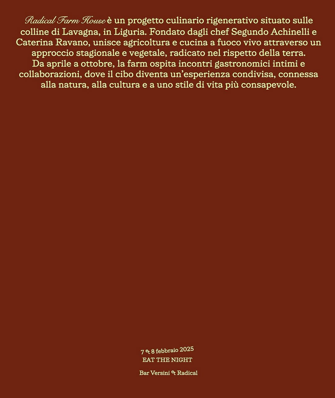 Bar Versini is a travelling culinary experimentation project, born from the passion of Stefano, Alessandra, and Rachele Versini. Their approach combines tradition and experimentation, with dishes created using seasonal and local products.