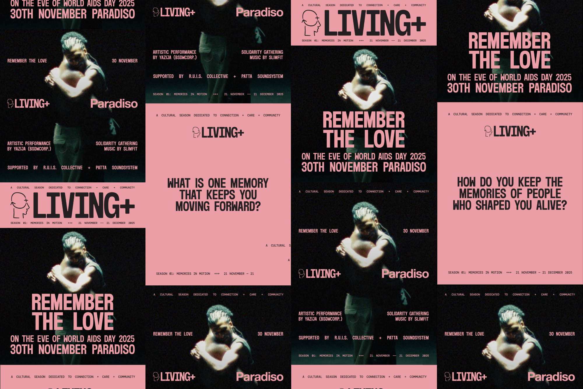 We designed the visual identity for Living+ and its inaugural season, Memories in Motion. Acknowledging that HIV/AIDS may not resonate immediately with many younger people today, we worked to reframe the conversation: moving from isolated or clinical topics to exploring deep connections in care, justice, visibility, intimacy, inequality and shared responsibility.