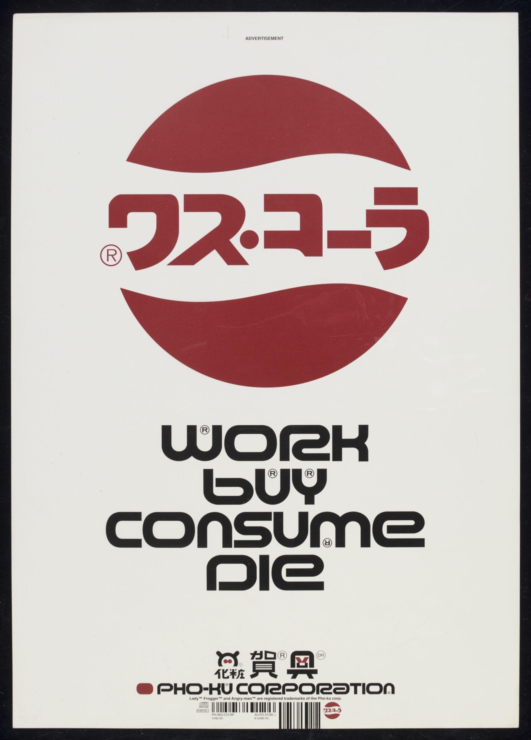 ‘Work Buy Consume Die’ is the slogan of the imaginary Pho Ku Corporation invented by The Designers Republic, a Sheffield based graphic design agency. Disenchanted with corporate driven consumerism in the 1990s, but acknowledging their role as a brand agency in the process, The Designers Republic devised an anti-corporate identity to counter the forces of global branding. The design is inspired by Japanese graphic design and also subverts the Pepsi Cola logo as a comment on the force of global branding.