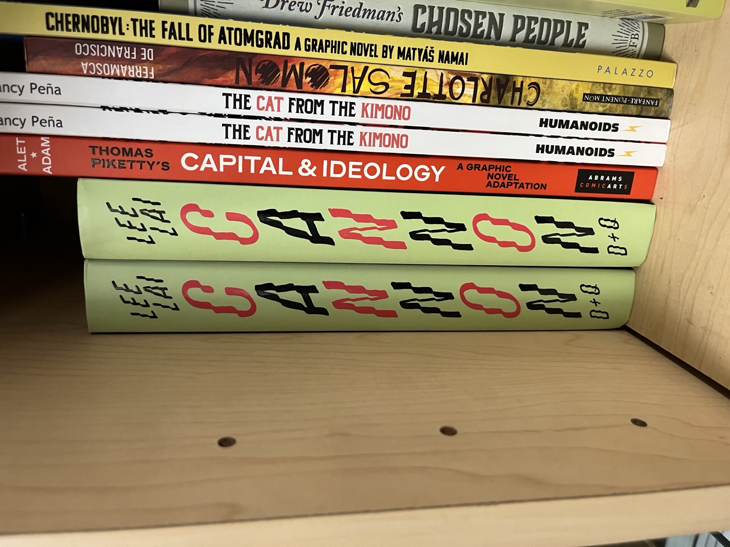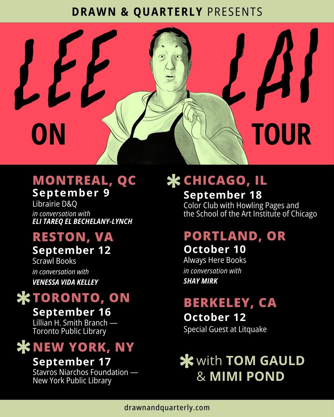Cannon is Lee Lai’s follow up to the Lamda Award winning graphic novel Stone Fruit. The title and author’s name on both the cover and the spine are typeset in Velzyland. On the cover, the wavy letterforms of Velzyland pair nicely with the rhythmic bird feather motif. And the angled baseline on the cover works especially well with Velzyland’s extreme slant of 25 degrees. On the spine, “CANNON” is stacked vertically alternating from red to black, further echoing Velzyland’s wavy rhythmic effect, and it’s sandwiched between the author’s name and the publisher name, D+Q, shorthand for Drawn & Quarterly. All of the type appears to be hand-rendered, as evidenced by the organic edge details which are not in the typeface, though the spacing is consistent with the typeface.