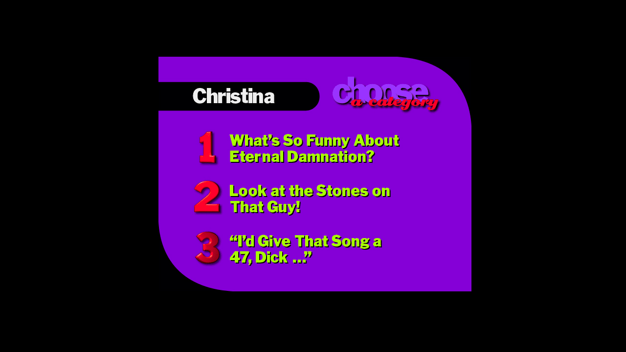The primary typeface still is Franklin Gothic – see the previous post about the YDKJ logo. Snell Roundhand Black is used for “schmivia!” on the CD-ROM label. In the game, Franklin Gothic is combined with Éclat to make the question segues.