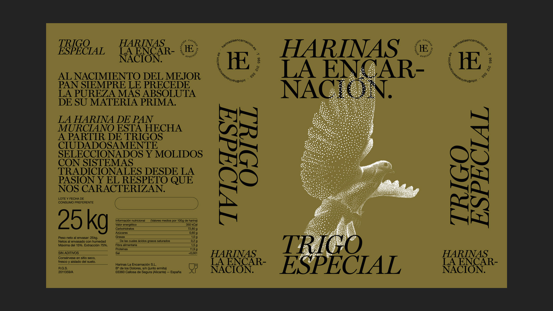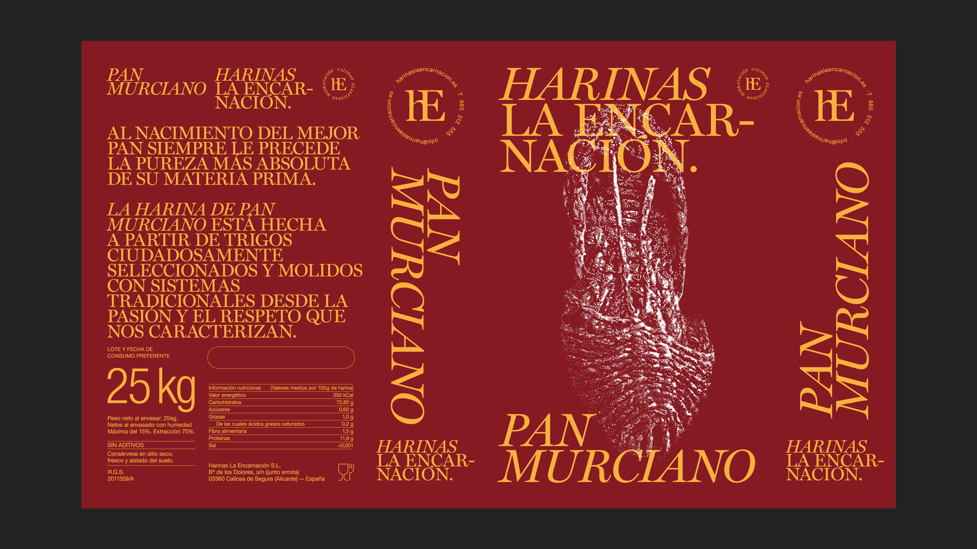 Murcia-based studio Rubio & del Amo designed the visual identity and packaging for Harinas La Encarnación, a Spanish flour producer known for its artisanal quality product. Using Miller Display from Carter & Cone, the design captures a level of elegance rarely seen in such a humble category. The design also includes Helvetica in use on the back for some content and nutritional details.