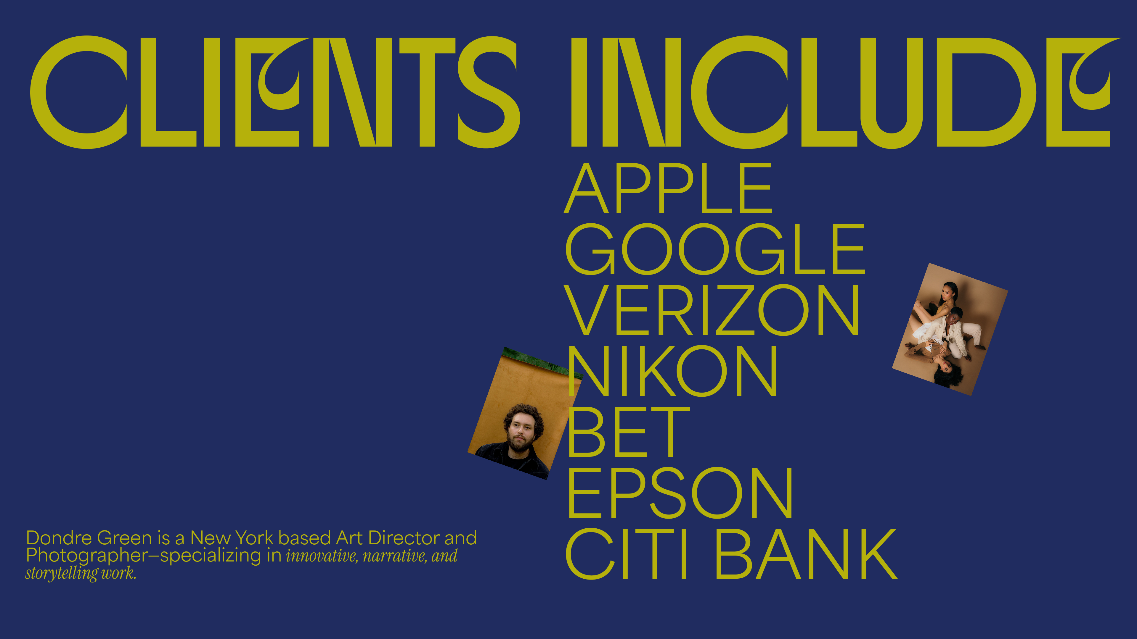 We created a distinctive identity for photographer and art director Dondre Green that uses a combination of typography, layout, and colour to present a contemporary and expressive look for his brand and website. Born and raised in the Bronx with roots in Jamaica, Dondre’s creative vision captures the essence of culture, identity, and artistry. His identity and website are designed to reflect his unique perspective and bold creativity.