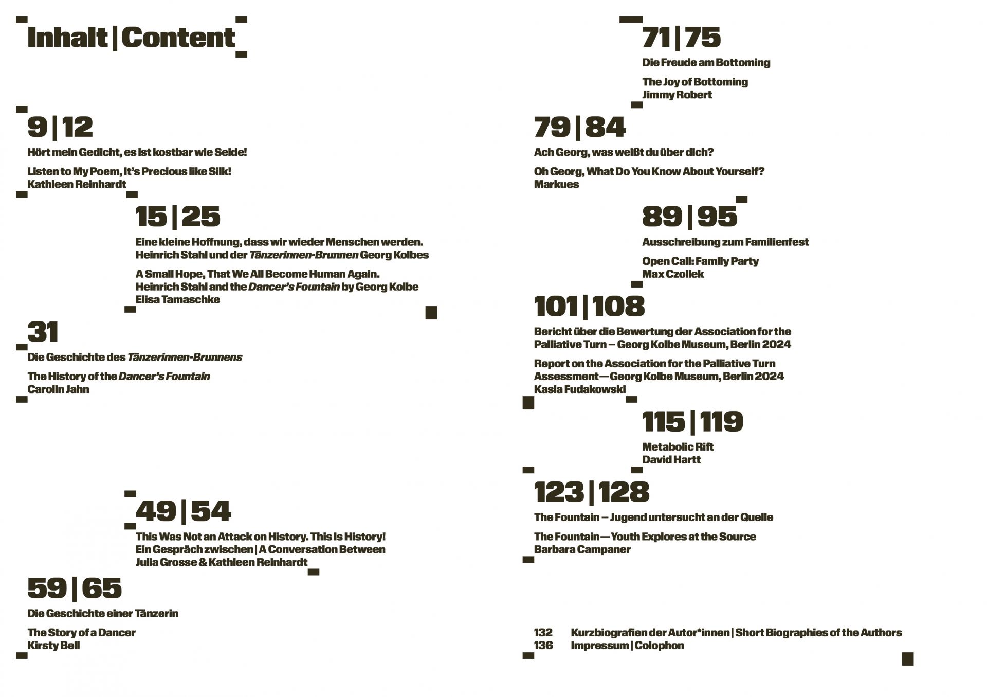 Der Brunnen / The Fountain is a monograph on Georg Kolbe’s Fountain of Dancers (1922), published by Distanz in the summer of 2025 for the seventy-fifth anniversary of the Georg Kolbe Museum in Berlin. The book traces its artistic, historical, and socio-political significance through essays, chronology, and contributions from writers and visual artists.