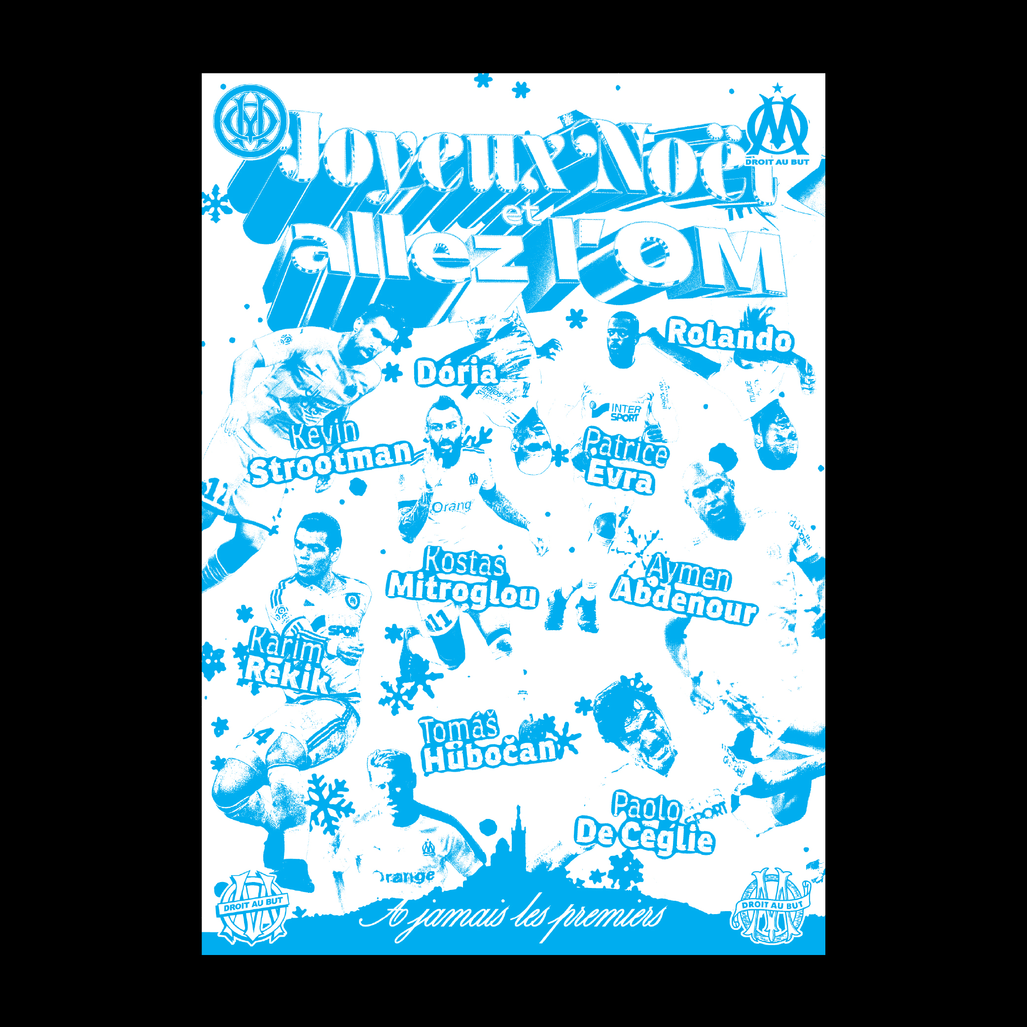 “Joyeux Noël et allez l’OM” (“Merry Christmas and go OM!”) is a monochrome cyan poster paying tribute to a selection of players who have passed through Olympique de Marseille over the years. Rather than ranking or judging them, the poster treats these figures as part of the club’s collective memory, players who, for better or worse, contributed to shaping its identity.