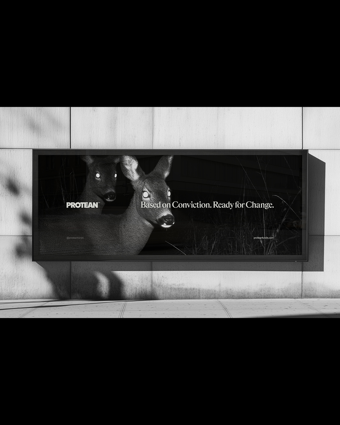 The typographic system is built around a deliberate tension between permanence and adaptability. TWK Burns anchors the identity with a sense of weight, discipline, and institutional memory, it feels carved rather than drawn, aligning with Protean’s emphasis on conviction and responsibility. Rhymes introduces a more expressive, high-contrast voice in headlines, allowing for nuance, emphasis, and moments of controlled instability. Ritual (with Ritual Mono) functions as the connective tissue, a contemporary sans that keeps the system operational, readable, and grounded in the present. Together, the typefaces mirror Protean’s philosophy: decisions rooted in strong belief, but always open to revision as conditions change.