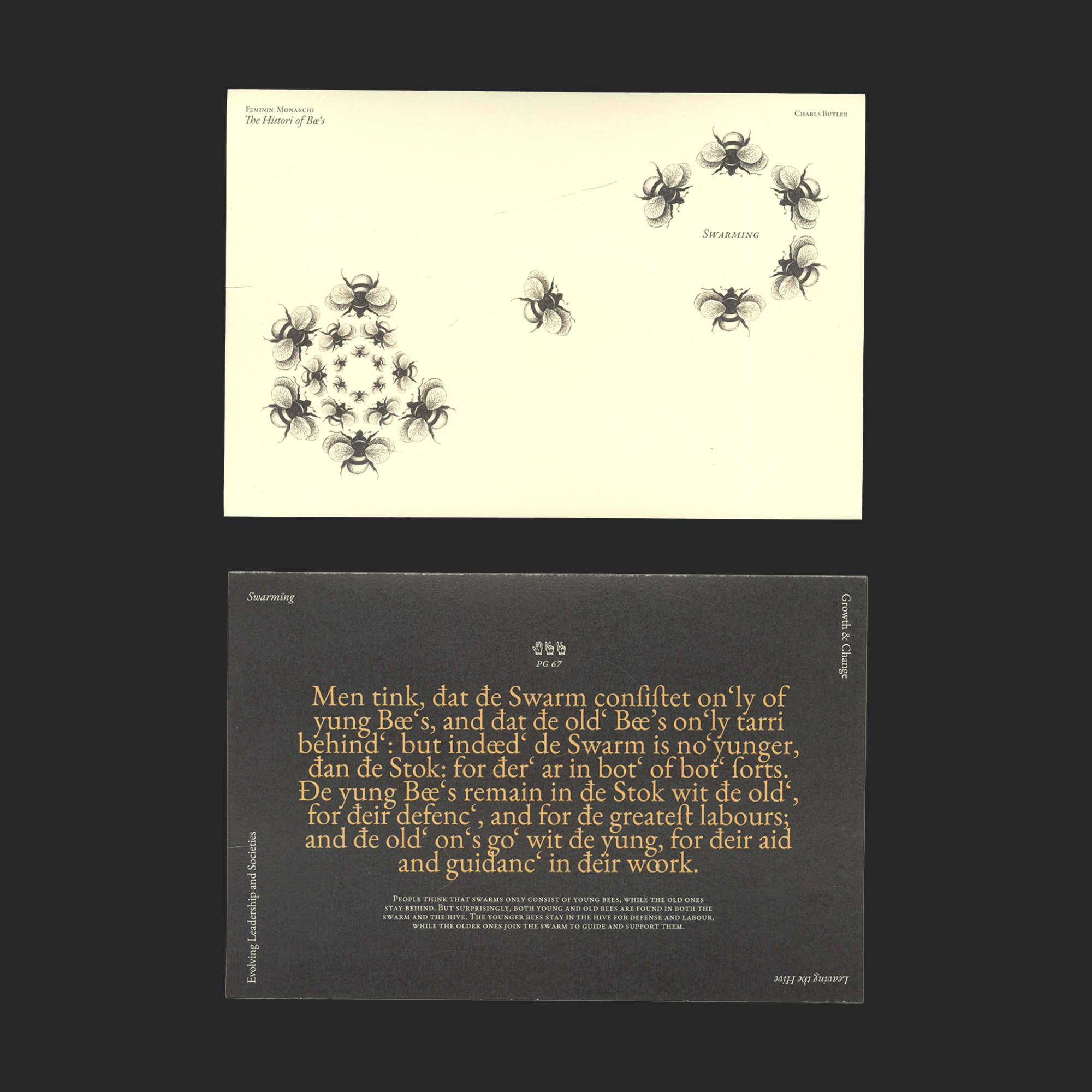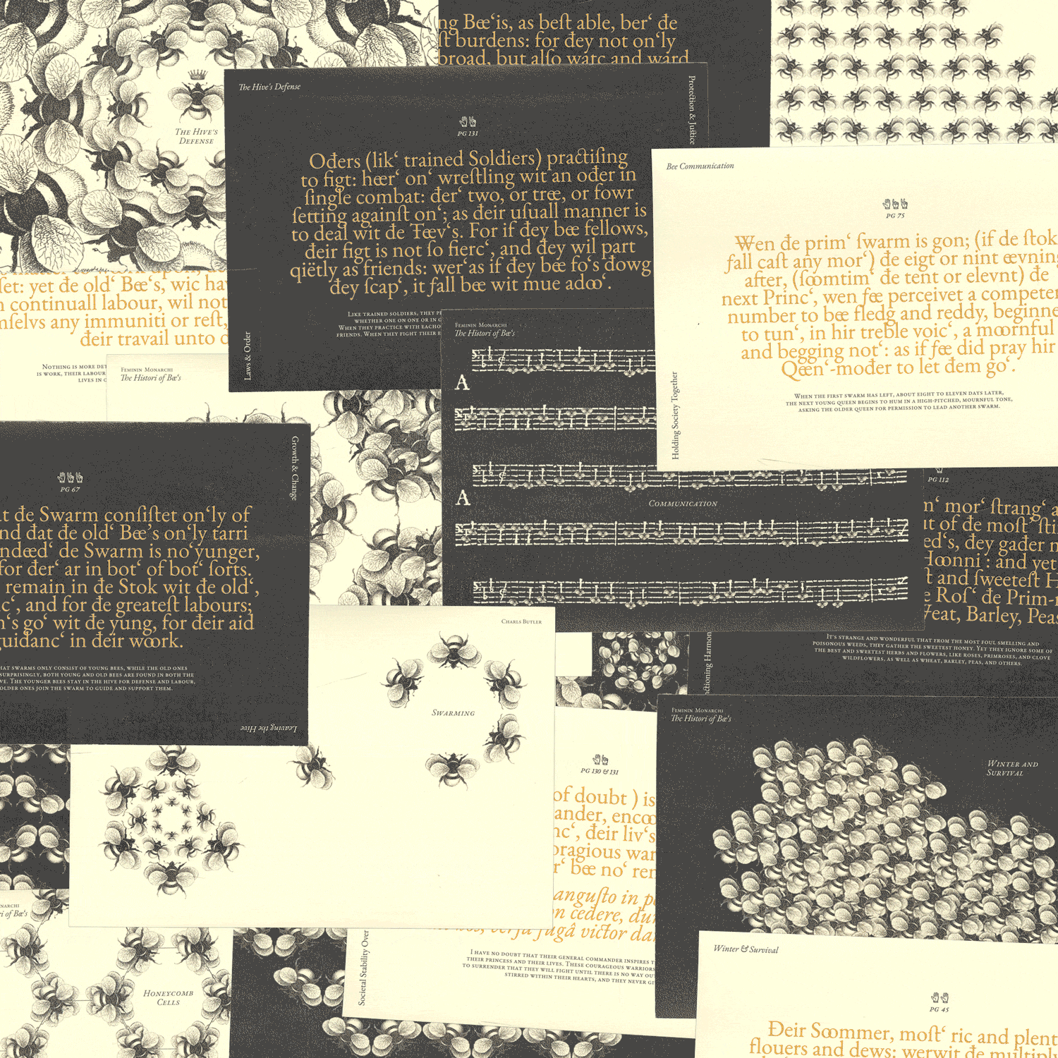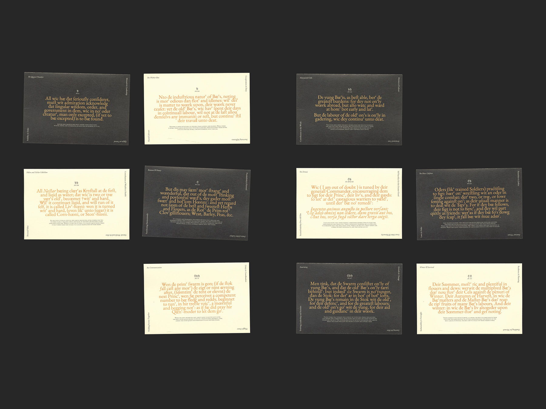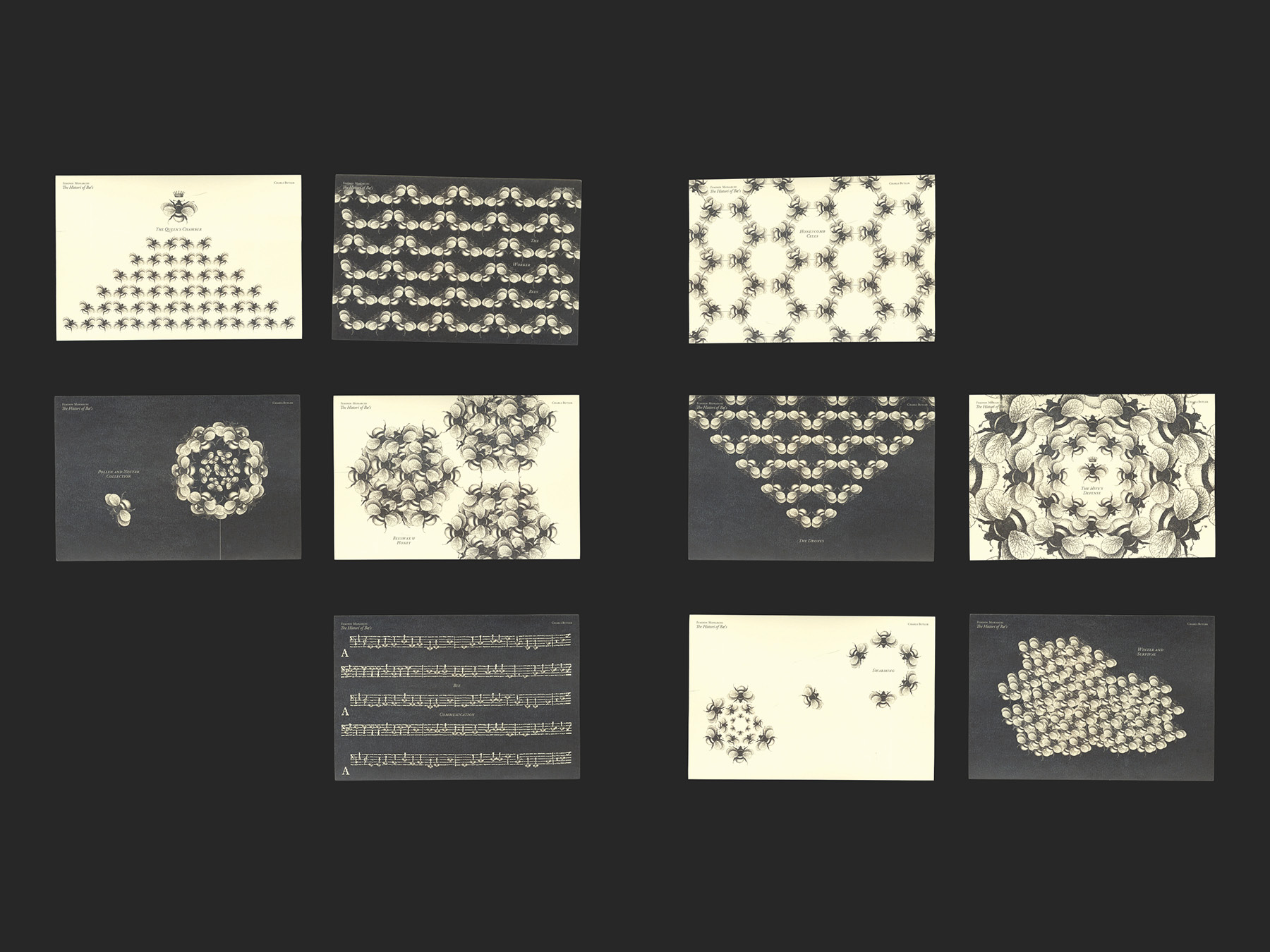 Made as a student project at RISD, this series of ten plates creates a taxonomy that compares the parts of the beehive to societal structures and an anthropology to how communities of bees and people behave. Each plate shows an illustration as a visual representation of the idea, as well as a quote from the book that discusses that specific plates themes.