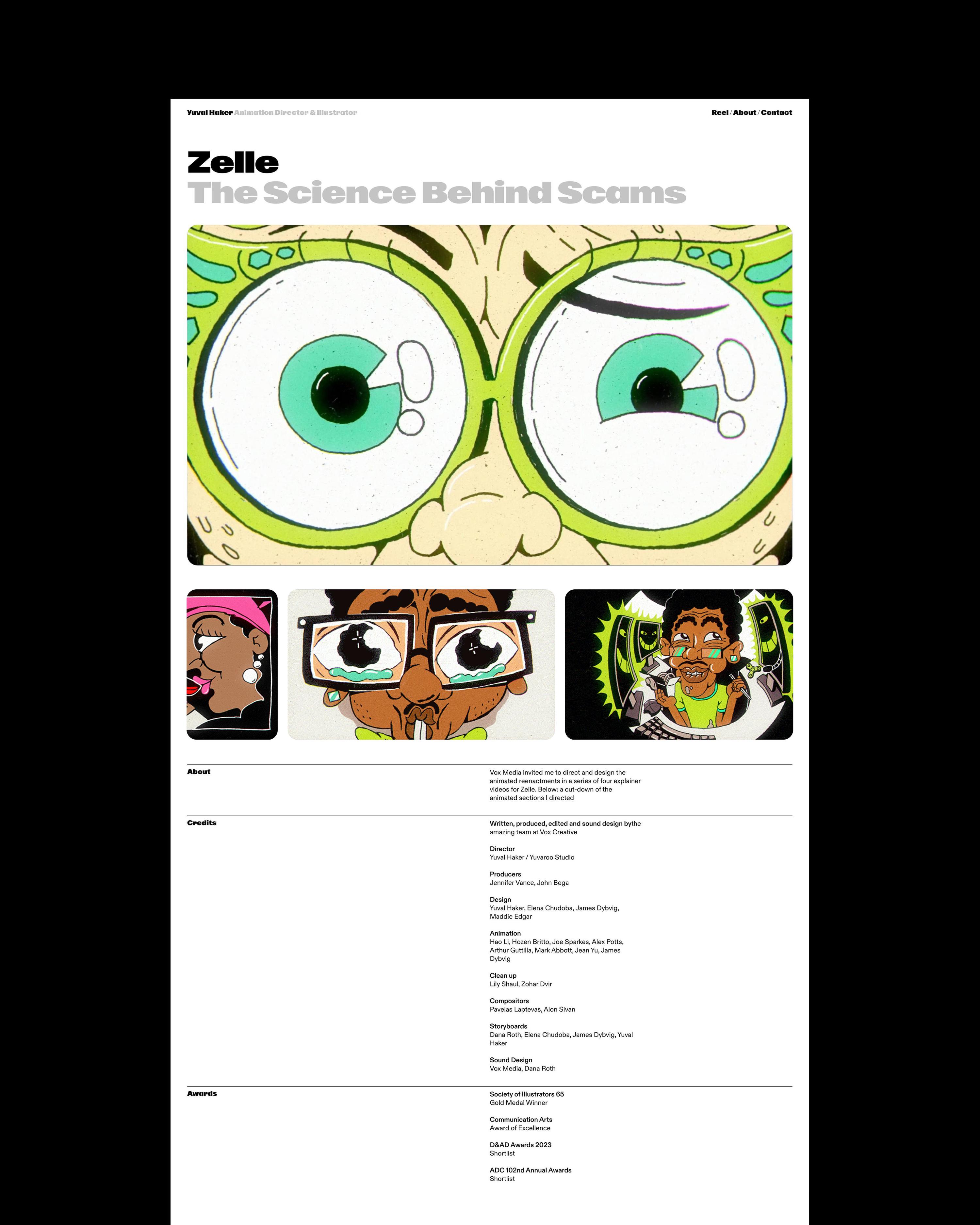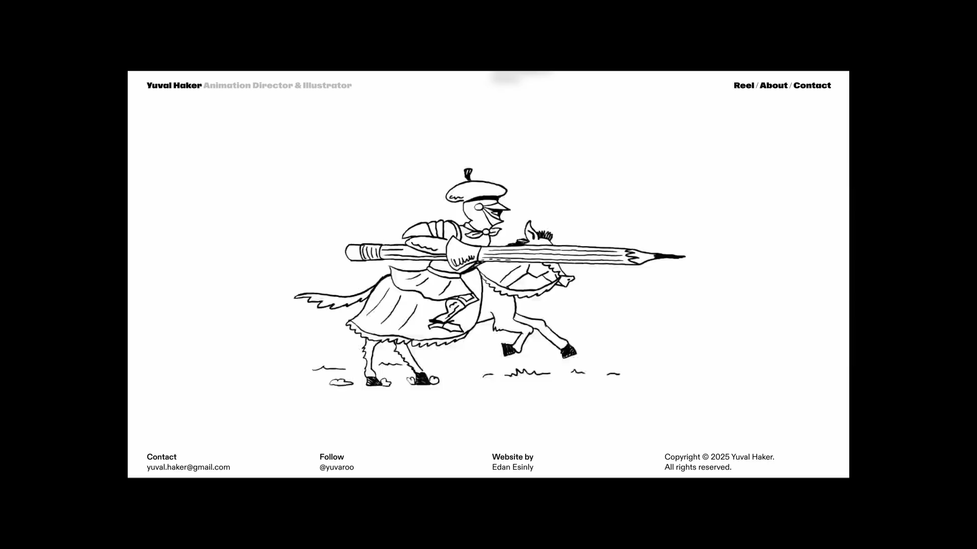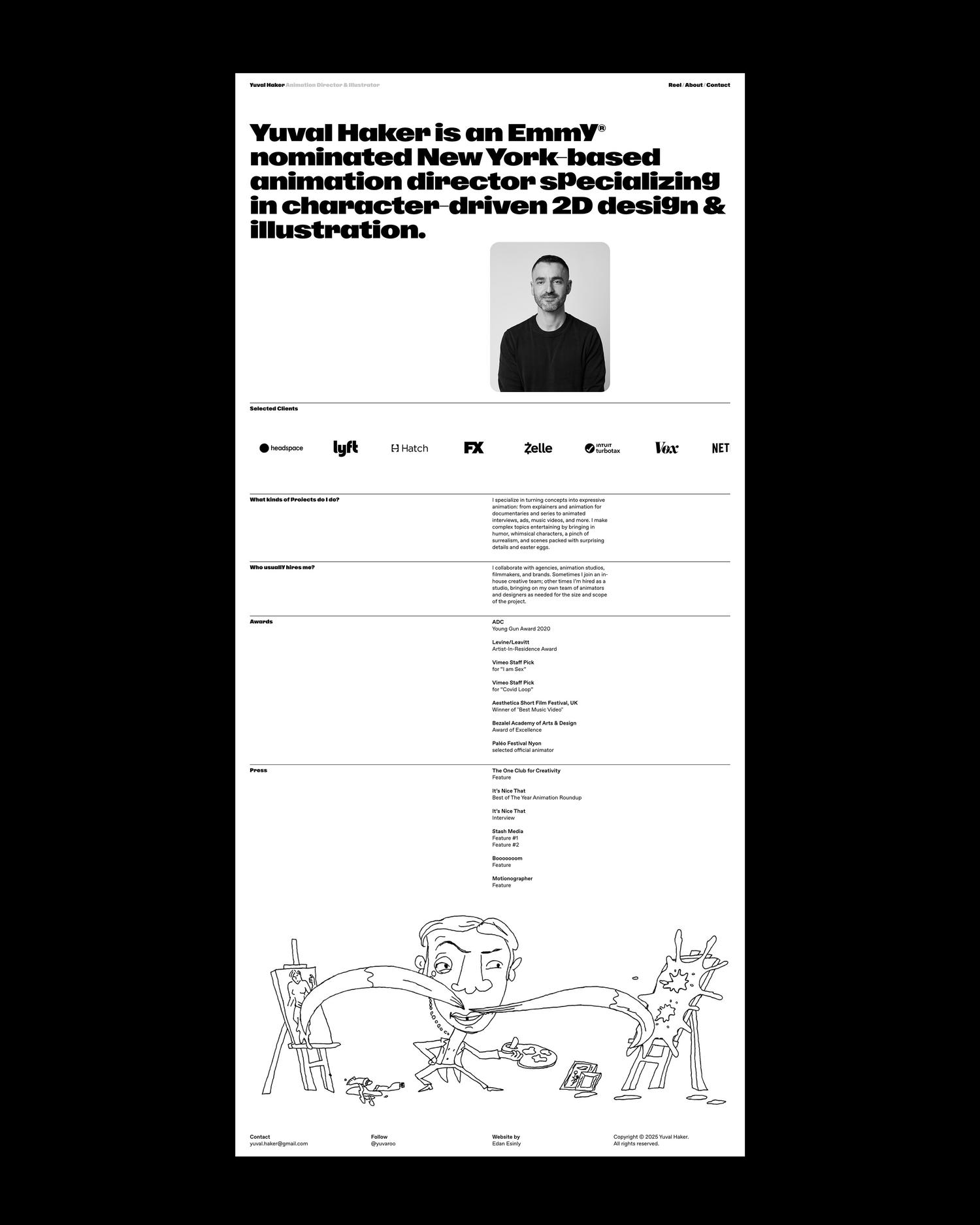Custom footer animations—small vignettes about the creative process—were drawn by Yuval specifically for the site, creating moments of surprise and delight with every page refresh.