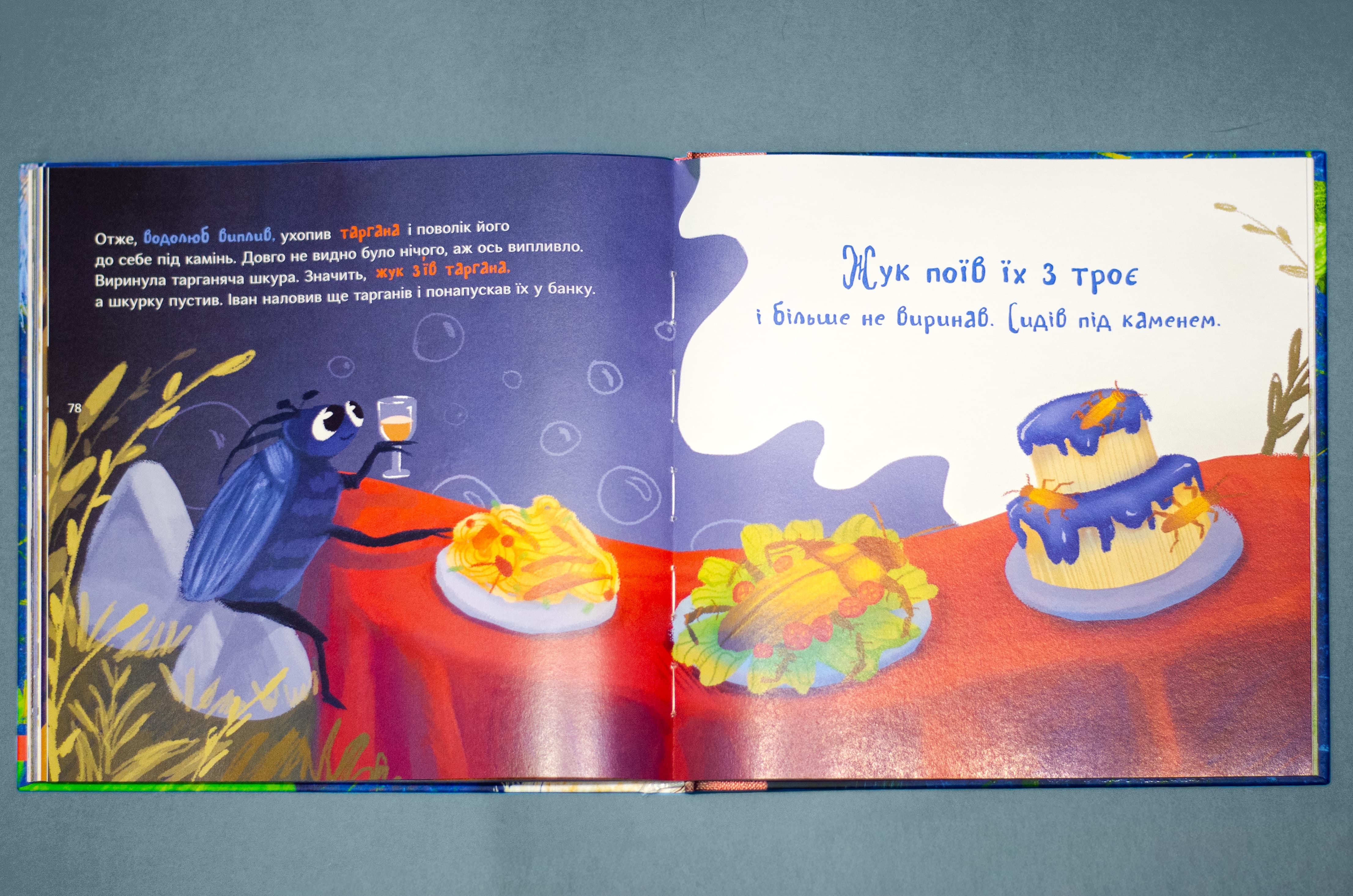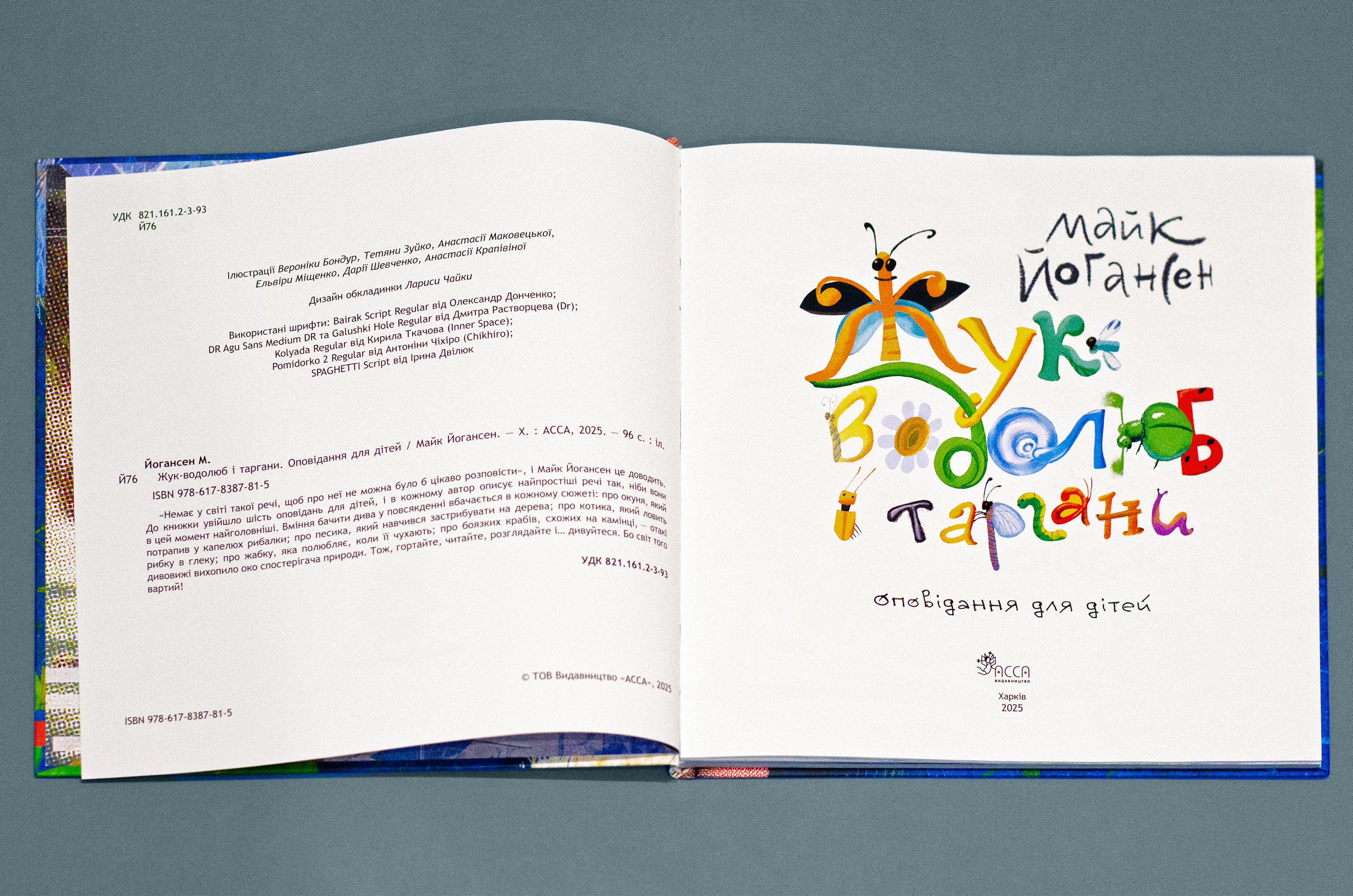 Zhuk Vodoljub i Tarhany (“The Diving Beetle and the Cockroaches”) is a Ukrainian children’s book published by ACCA, with stories by Ukranian poet, writer and linguist Maik Yohansen (Майк Йогансен, 1895–1937). The book features a lively and varied typographic approach that combines several contemporary Ukrainian typefaces, supporting the playful narrative while maintaining clarity for young readers.
