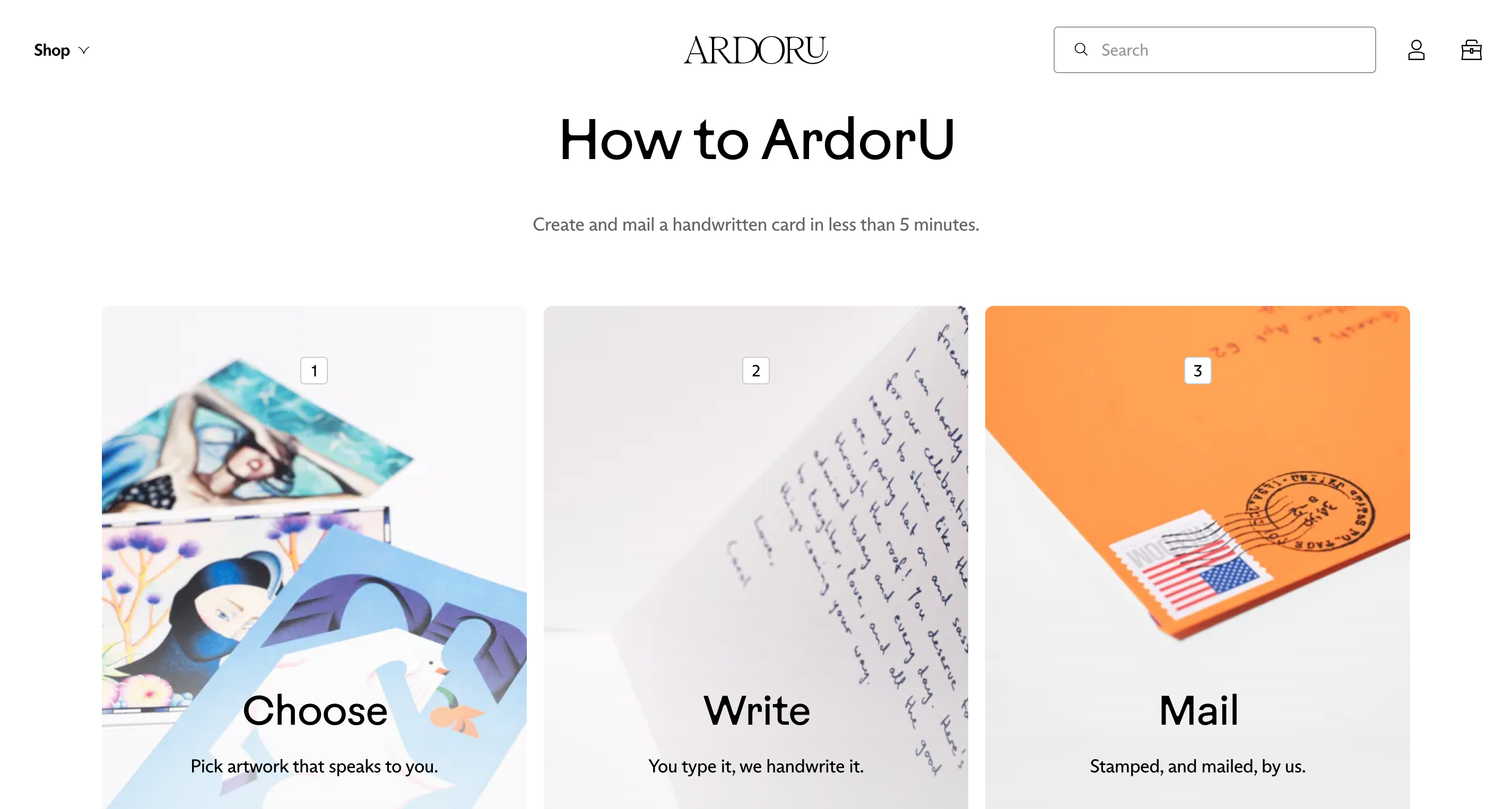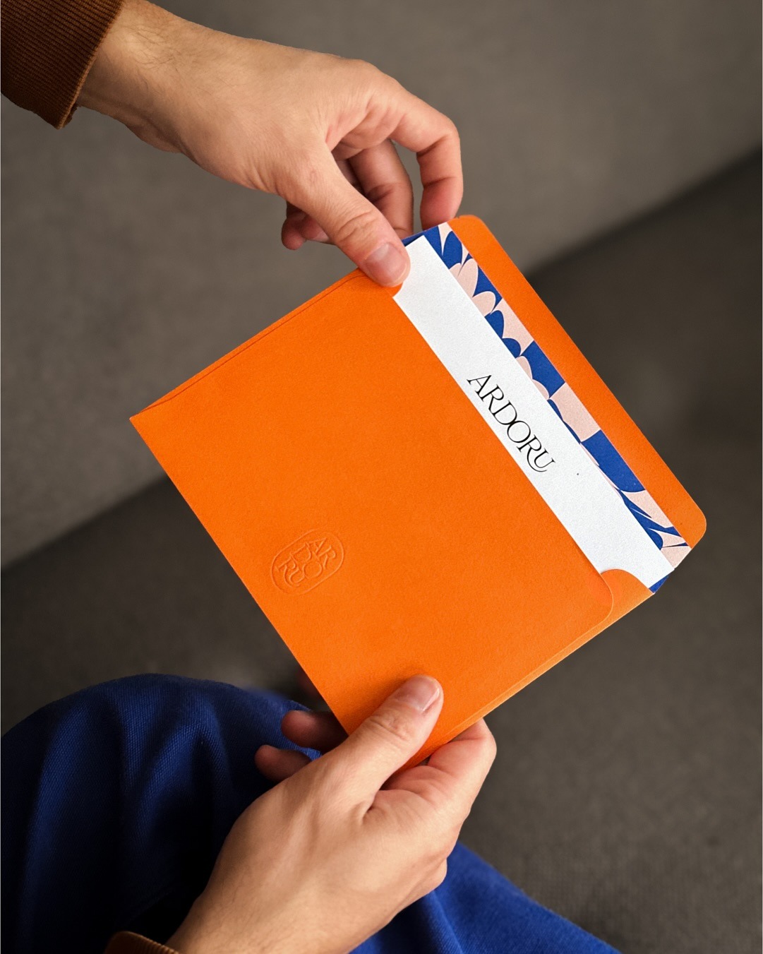 ArdorU offers a service for sending greeting cards with “your words, handwritten and mailed in minutes.” The brand is defined by poised, elegant serifs, refined ligatures, and a tactile signet, paired with a precise and unforgettable orange. The bright envelope ensures instant brand recognition the moment it arrives.