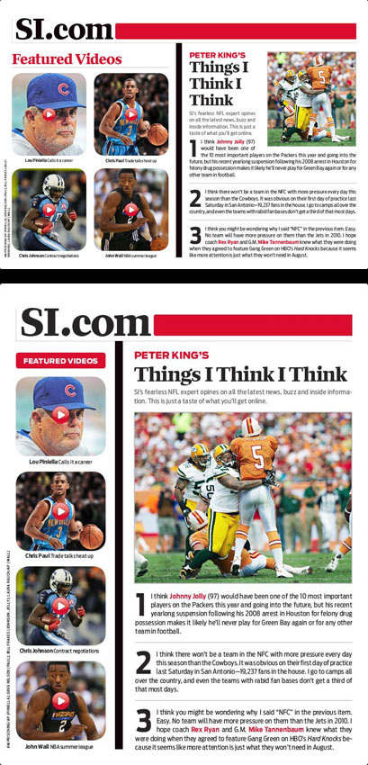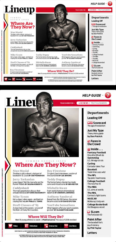 Sports Illustrated – 2010 inside pages Contributed by Font Bureau on Feb 14th, 2012. Artwork published in 2010. License: All Rights Reserved. Antenna and Quiosco dominate the covers and inside pages of Sports Illustrated. Farnham and Receiver appear as well. Both horizontal and vertical formats are shown as seen on the iPad. License: All Rights Reserved. License: All Rights Reserved. License: All Rights Reserved. License: All Rights Reserved. License: All Rights Reserved. License: All Rights Reserved. License: All Rights Reserved. Typefaces More about QuioscoGet QuioscoMore about AntennaGet AntennaMore about Antenna SerifGet Antenna SerifMore about FarnhamGet Farnham Formats Magazines/Periodicals (1816) Mobile/Tablet (993) Topics Sports (764) Tagged withSports Illustrated (3)baseball (18)basketball (68)sports (176)boxing (16)American football (24)type series: sans+serif (371)type series (618)pre-release uses (688) Artwork location United States (9773) In Sets2+ typefaces by 1 designer (Florian Hardwig) (1086) Post a comment Name Email – will not be published Website Your response Submit Comment More Quiosco in use The Hollywood Reporter2008James ReymanReyman StudioContributed by Font Bureau Typeknitting websitec. 2022Rüdiger SchlömerContributed by Rüdiger Schlömer Wisconsin State Journal2009Contributed by Font Bureau Sponsor More in Sports I Am Third by Gale Sayers with Al Silverman (Bantam)1972Photo(s) by Bart Solenthaler on Flickr. tweenerTennismagazin Nr. 1c. 2022Simon WaltererContributed by David Einwaller The New Black West by Gabriela Hasbun2022Allison WeinerChronicle BooksContributed by Nikolas Wrobel La Gazzetta dello Sport (c. 2013–)c. 2013Cases i AssociatsPablo RuizContributed by TypeTogether More in Magazines/Periodicals brand eins magazinec. 1999Mike MeiréMeiré & MeiréContributed by Shiva Nallaperumal Staff Pick Lürzer’s Archive magazine redesign2022SixContributed by harrison marshall BLAST: Review of the Great English Vortex No. 1, by Wyndham Lewis (ed.)1914William Henry LeveridgeWyndham LewisContributed by Florian Hardwig Staff Pick Boat Magazine, Issue 2 “Detroit”2012Luke TongeContributed by Stephen Coles Staff Pick More Fonts In Use Kvilda Memorial2008Contributed by Briefcase Type Foundry Staff Pick Certain Realities exhibition poster2019Mark Gowing StudioContributed by Mark Gowing Staff Pick Georg Hartmann anniversary publication1947Gudrun Zapf von HesseContributed by Ferdinand Ulrich Staff Pick The Catalyst Killing and other books by Hans Olav Lahlumc. 2017James AnnalContributed by Erica Jung Staff Pick