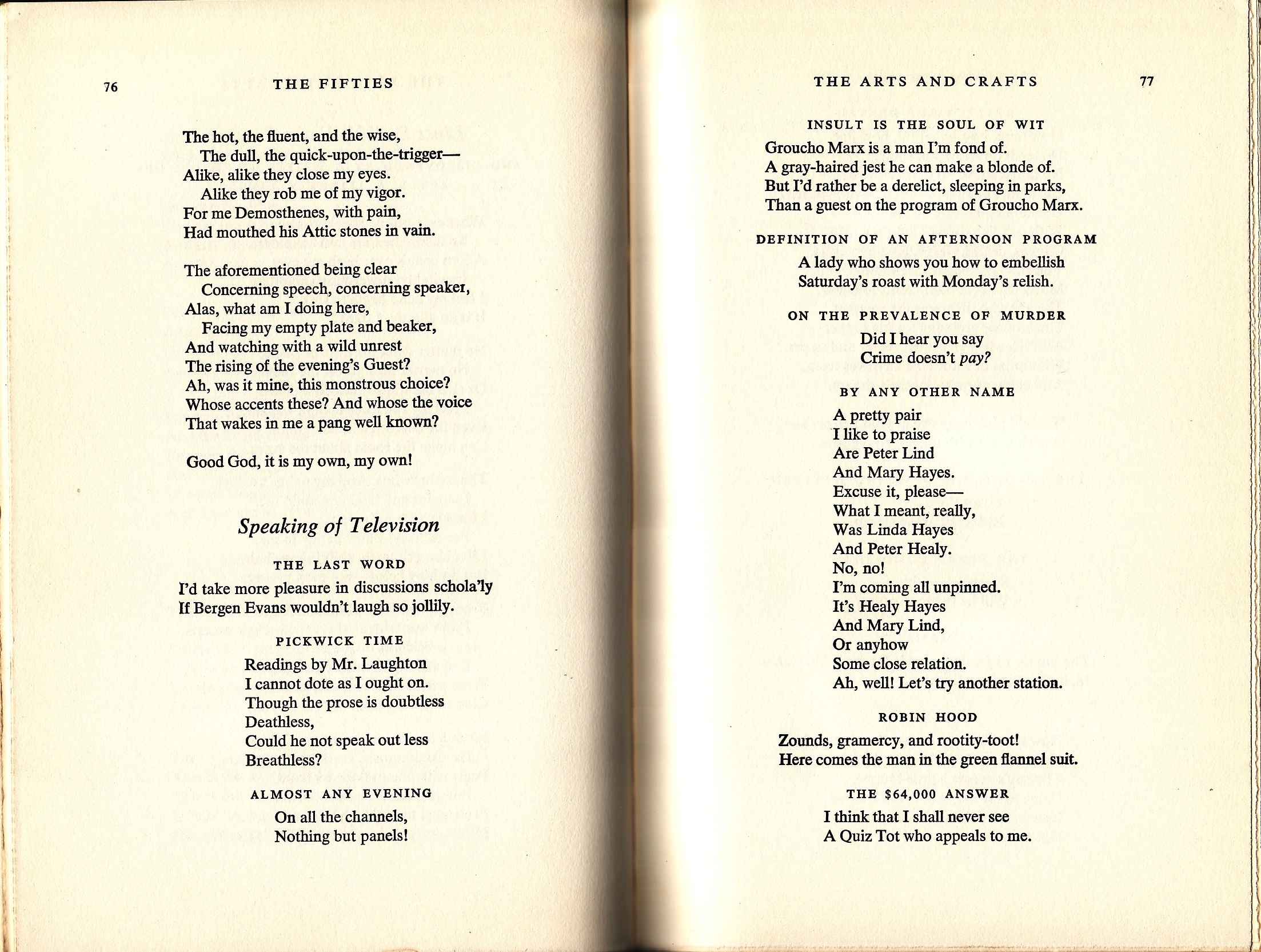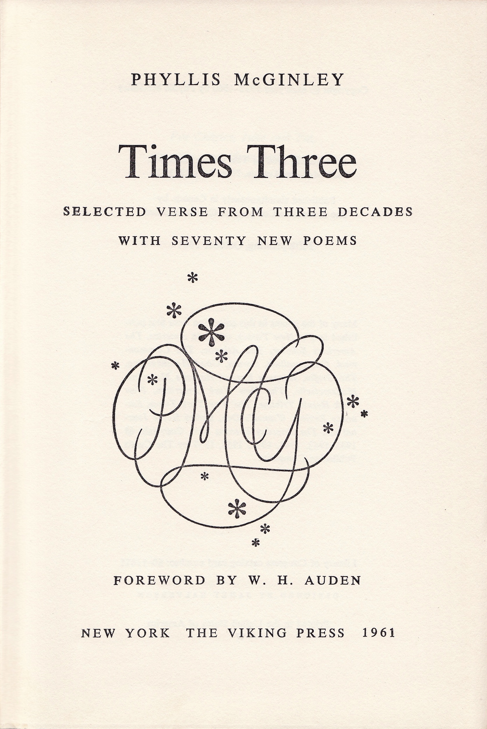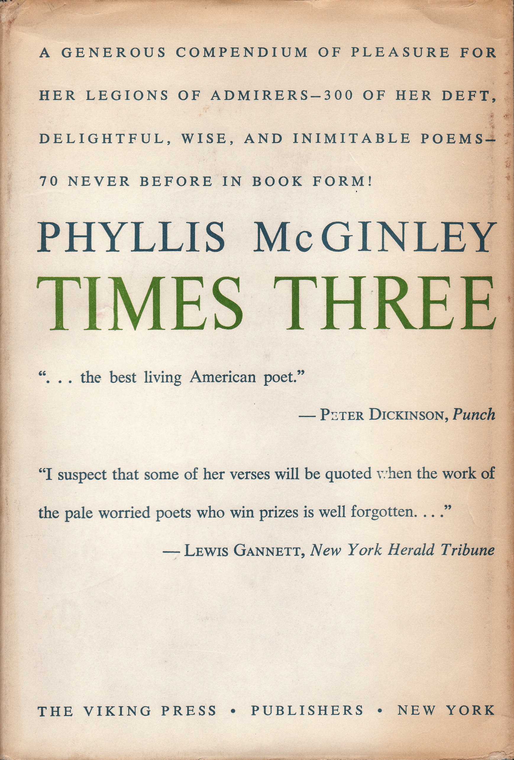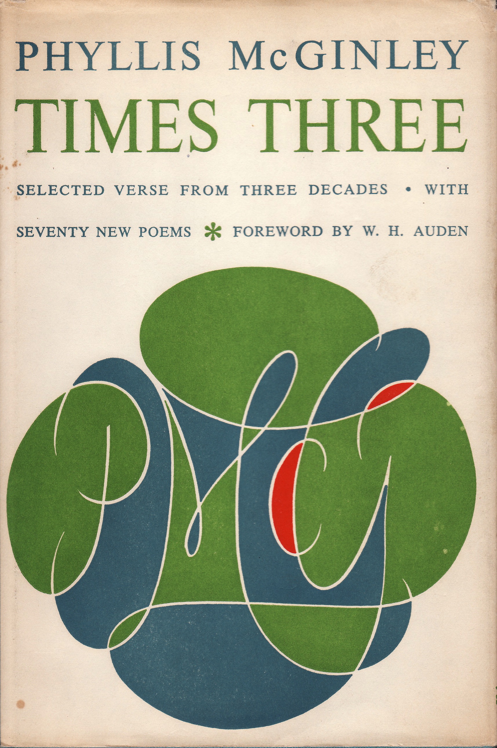 Phyllis McGinley, 1905–1978, was a writer of light verse that extolled the happiness of family life in the American suburbs, completely without irony. Even though the great WH Auden (1907–1973) wrote an appreciative foreword for this prizewinning book, McGinley’s work is ignored today. My mom loved her poems, though, and often read them to us at dinner. I bought this copy because the cover had made such a strong impression on me.