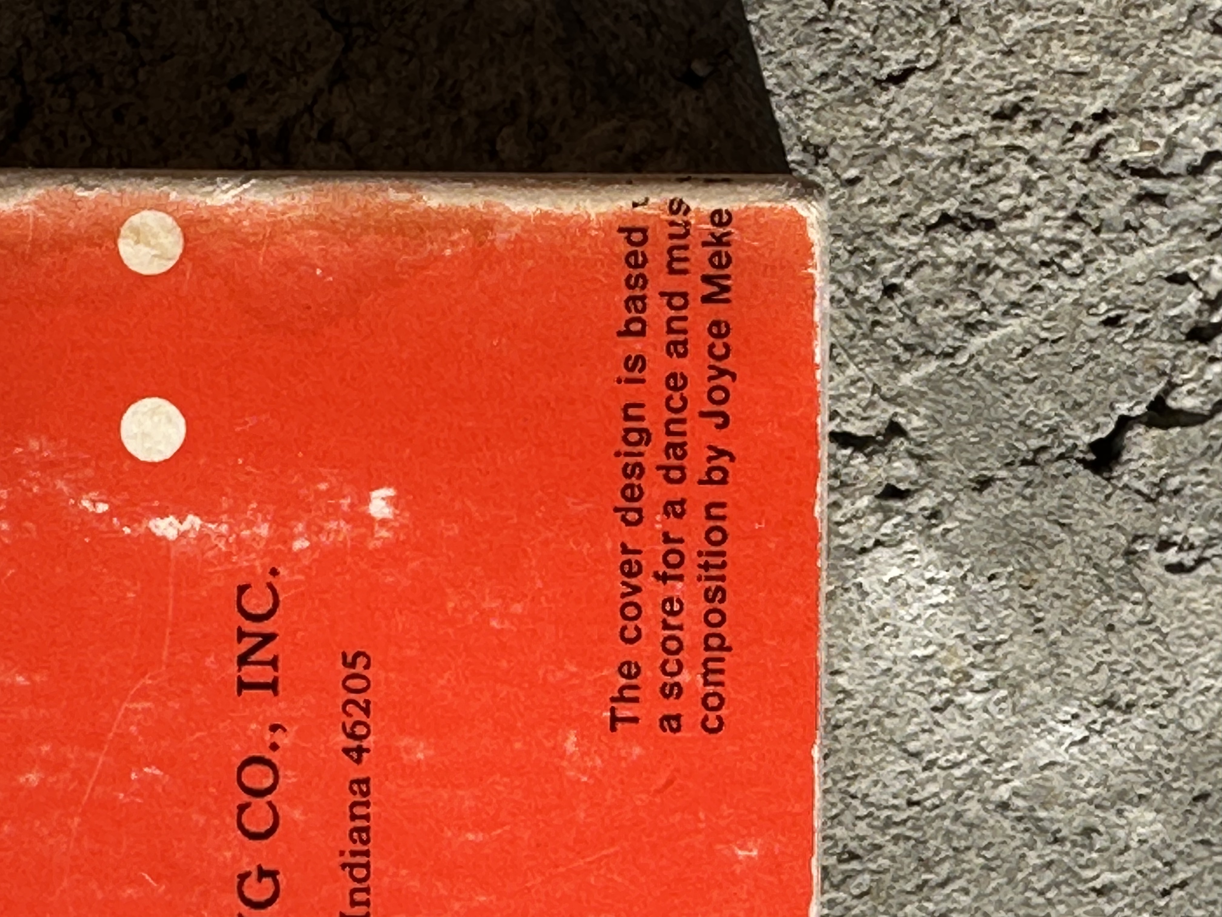 The cover design on this 1976 paperback by Bobbs-Merill is uncredited, but does say on the back cover, only partially visible on this well-worn copy: “The cover design is based on a score for a dance and musical composition by Joyce Mekeel.” I believe it matches the original hardcover design from 1968.