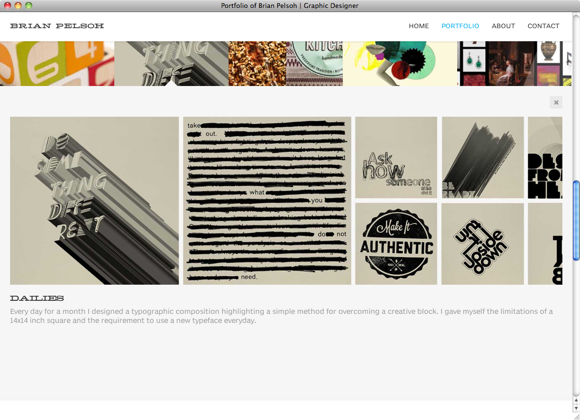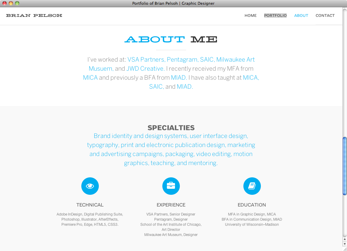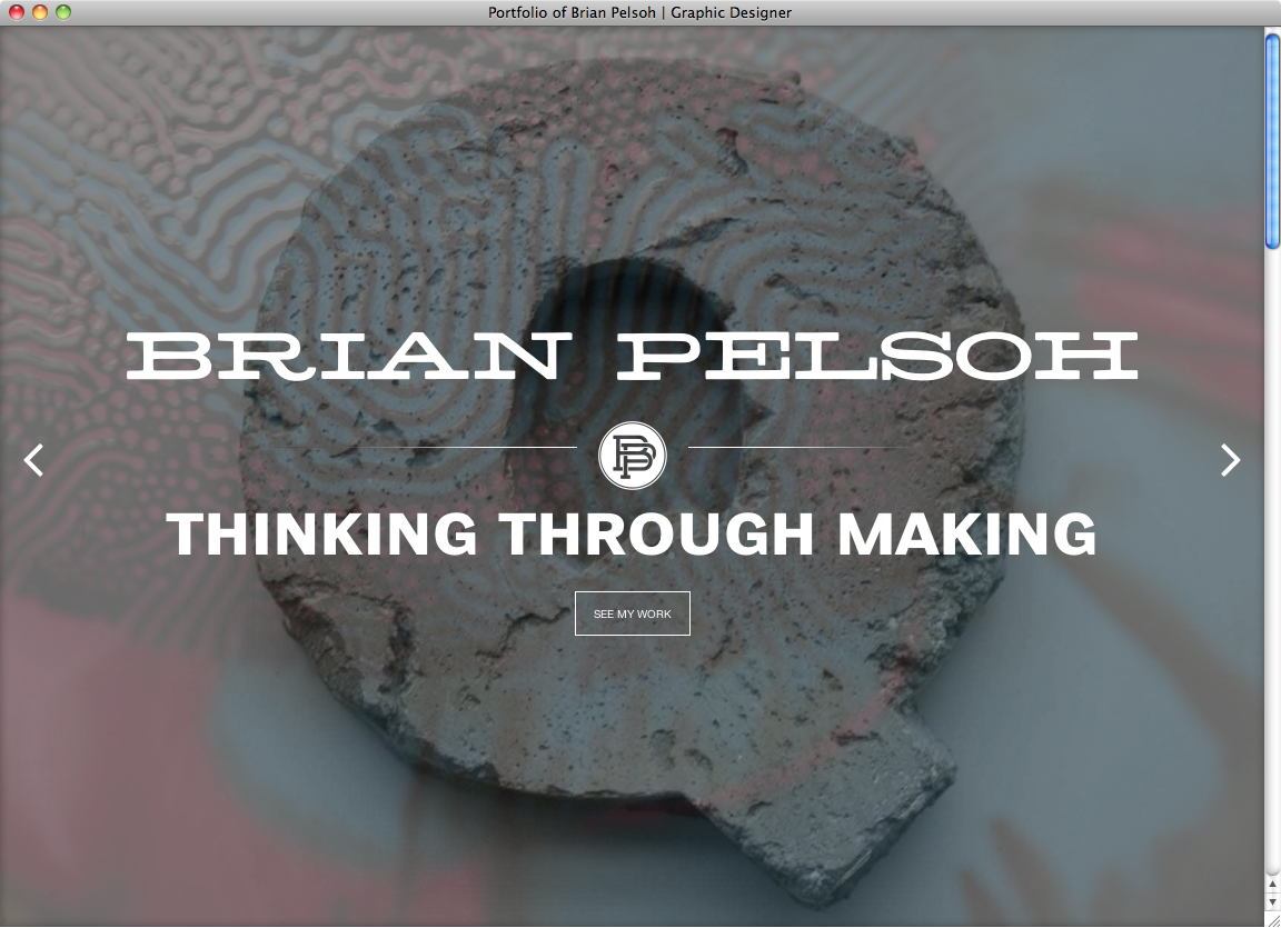 Brian Pelsoh website Contributed by Webtype on Sep 3rd, 2014. Artwork published in circa 2013. Source: www.pelsoh.com License: All Rights Reserved. Graphic designer Brian Pelsoh created his own portfolio website with a clear and airy style using MCM Hellenic Wide for Headlines, Benton Sans RE for section heads, subheadings and description text and Benton Sans Light for short text passages. Source: www.pelsoh.com License: All Rights Reserved. Source: www.pelsoh.com License: All Rights Reserved. Source: www.pelsoh.com License: All Rights Reserved. Typefaces More about Benton SansGet Benton SansMore about Benton Sans REGet Benton Sans REMore about MCM Hellenic Wide Formats Web (5571) Topics Graphic Design (2992) Designers/Agencies Brian Pelsoh (1) Tagged withportfolios (760)single page websites (193)parallax scrolling (28) Artwork location United States (9848) Chicago (265) In SetsWebtype (Webtype) (241) Post a comment Name Email – will not be published Website Your response Submit Comment More Benton Sans in use Más Por Más2012Contributed by Webtype Ally Bank2009BBH New YorkLaura BollermanContributed by Stephen Coles Realosophy website2011Elsted CommunicationContributed by Webtype Staff Pick Sponsor More in Graphic Design Embléma feketén-fehéren 2.02021Anna FarkasAnagraphicContributed by Anna Farkas Fontspring.com2014FontspringContributed by Jos Buivenga Superfamous website2015Folkert GorterContributed by Shiva Nallaperumal MDes School of Art, University of Arkansas2022Jacobs & Co.Anna JacobsMolly LebermannContributed by Anna Jacobs More in Web ContraClassics2012NordaakerRobin MientjesContributed by Robin Mientjes Staff Pick Rodebjer S/S 20222021Public ImageContributed by Formagari Staff Pick Booster Conference 2013 Designmanual2013Elisabeth IrgensContributed by Letters from Sweden TIM online textbook2018Lisa StaudingerContributed by Lisa Staudinger More Fonts In Use Pelo magazine logo and covers (1970–2001)c. 1970Juan Bernardo ArruabarrenaJuan Carlos PiñaContributed by Felix Nic Staff Pick I Hit You with a Flower, Stedelijk Museum Schiedam2024Stefaniia BodniaCéline HurkaContributed by Stefaniia Bodnia Staff Pick At Olimpio’s grandmother – Ombre Lunghe album art2020Michele GalluzzoContributed by Michele Galluzzo Staff Pick A Glimpse Inside the Mind of Charles Swan III airbrush poster series2013P+AContributed by Stephen Coles Staff Pick