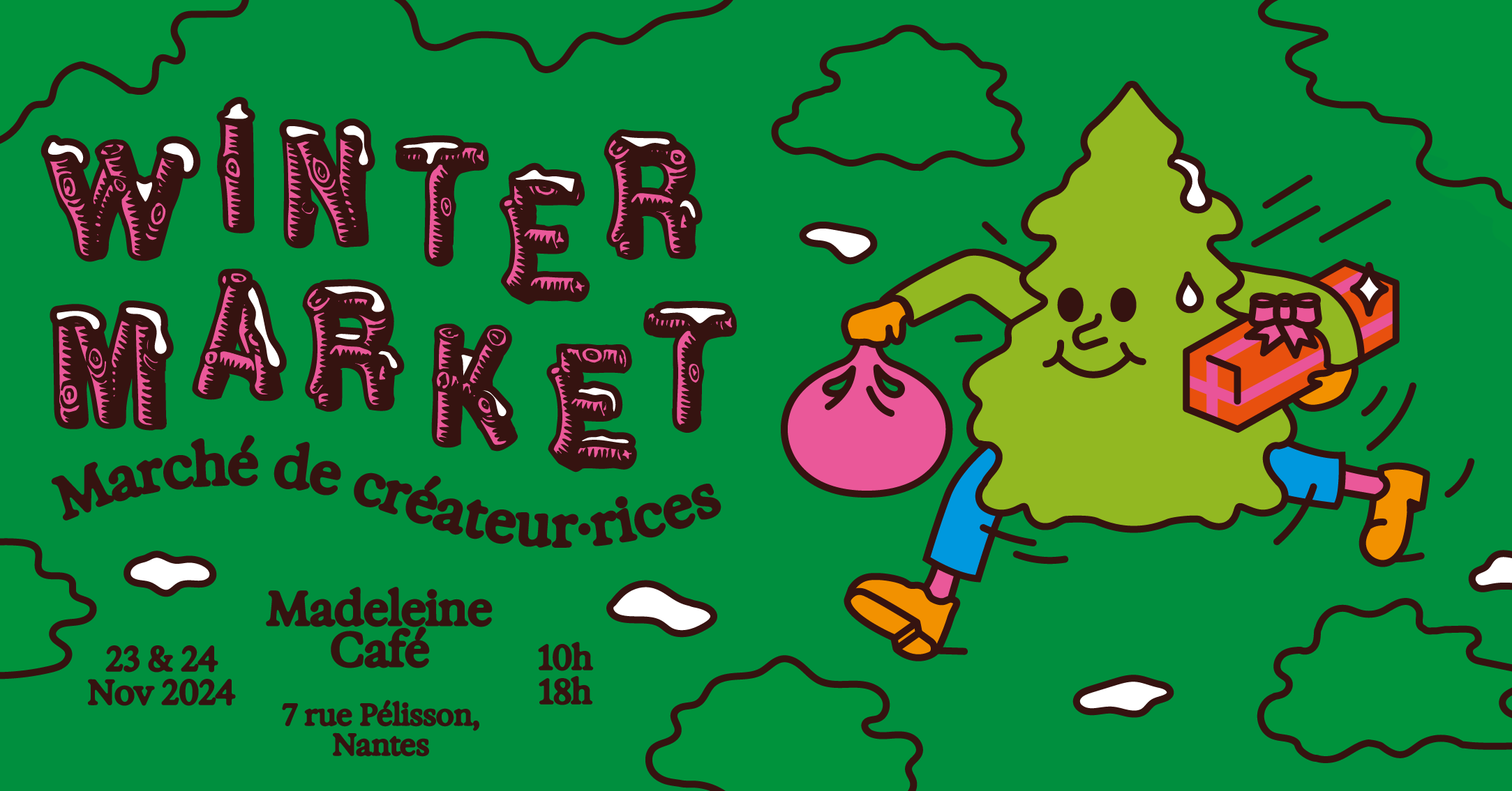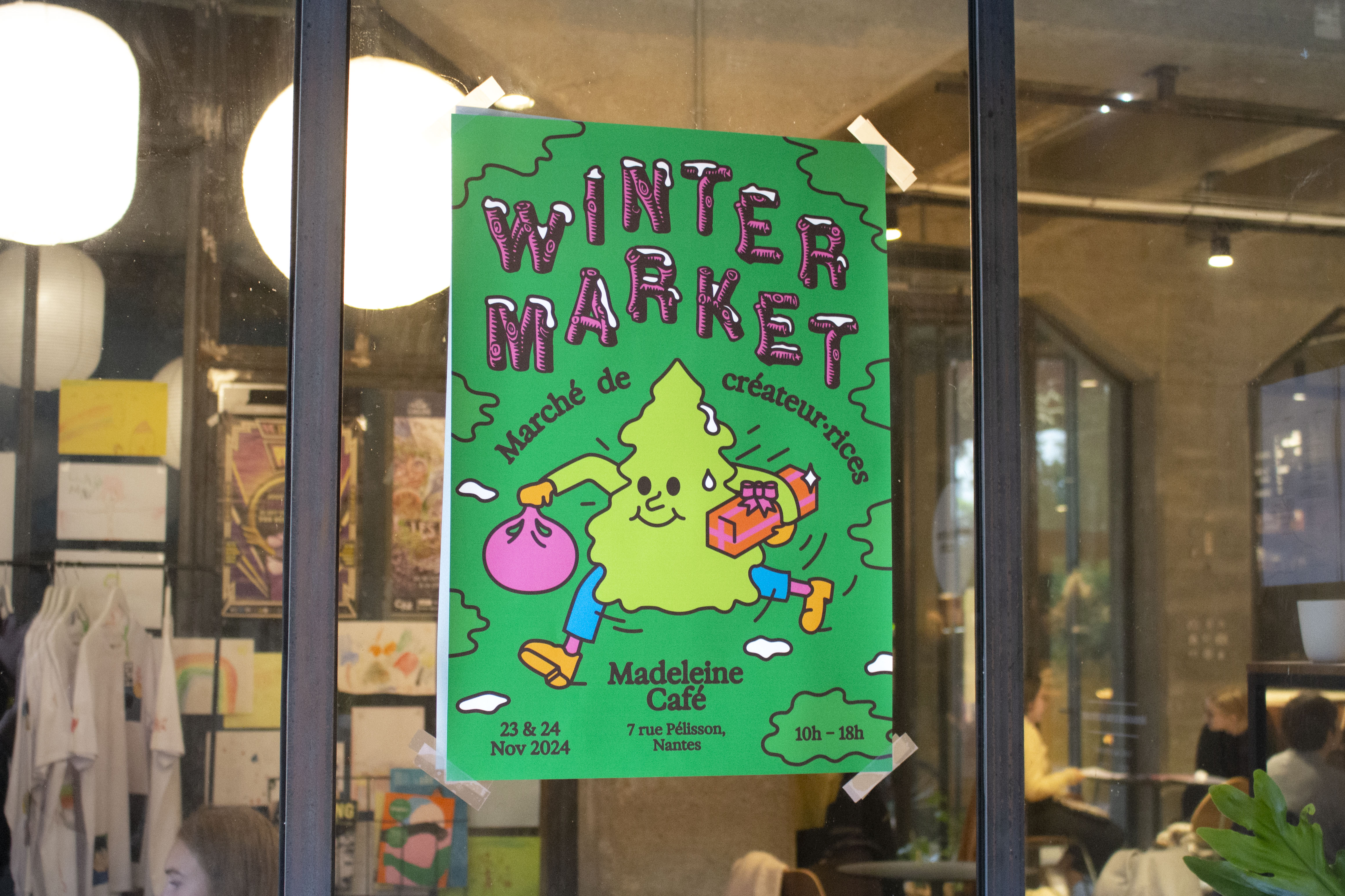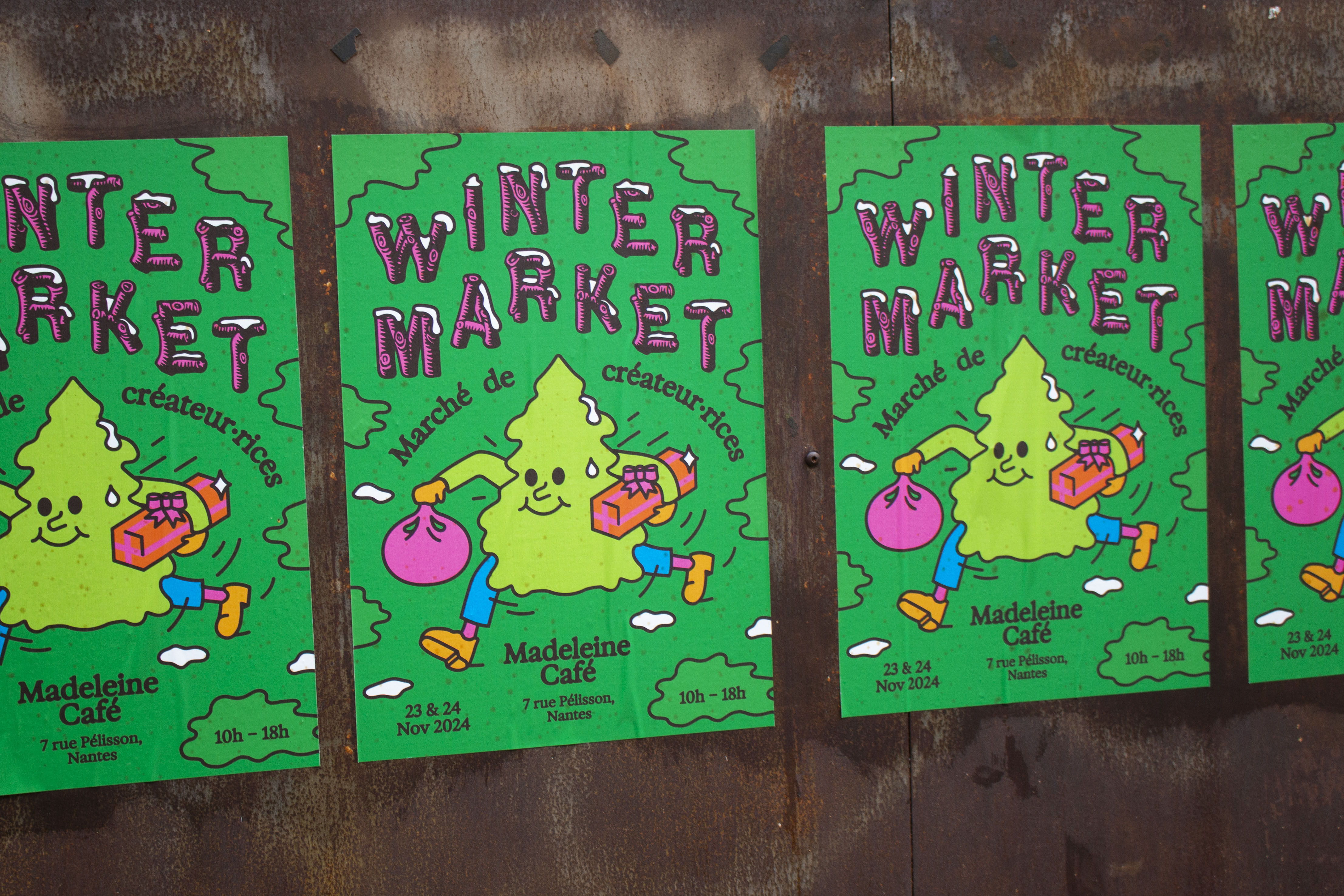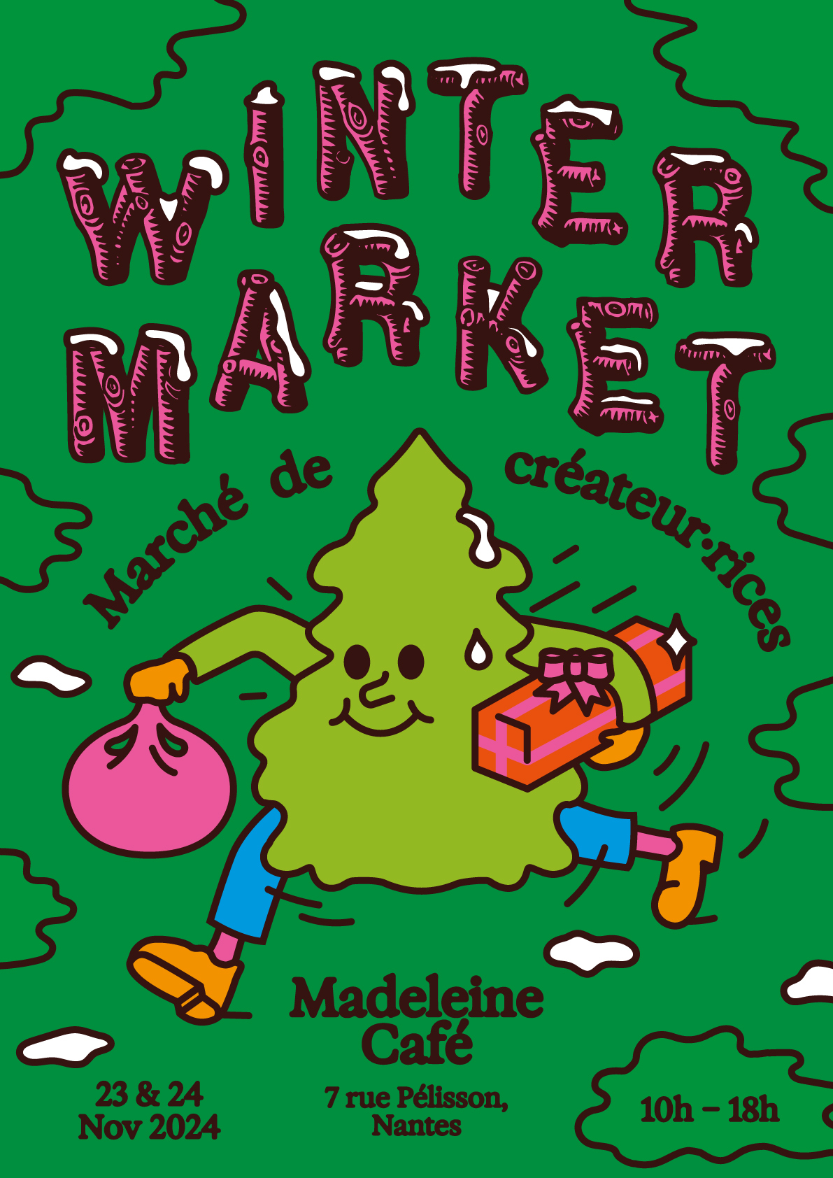 Here is a poster I did for a Christmas market gathering local designers that took place in a little coffee shop in Nantes in November 2024. I used Pinewood, a freebie digital interpretation of Rustic No. 2, both for the title and as an illustrative element, adding snow on top to make it fit to the rest of the composition. I paired it with Exposure, chosen for the warm feeling of its blurry outlines.