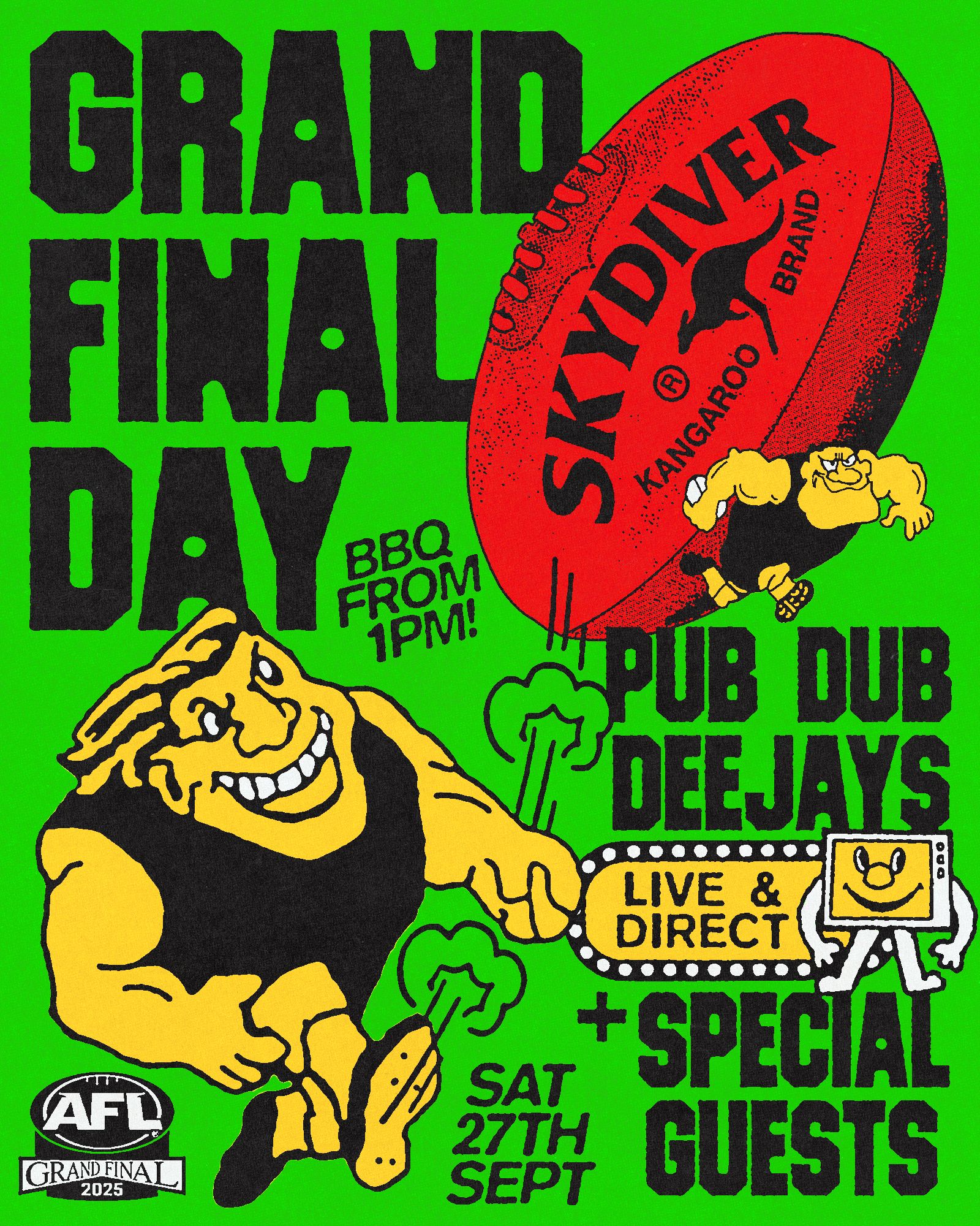 Poster for a Grand Final Day event at Skydiver, a record shop and bar in Collingwood, Melbourne. The poster marks the AFL Grand Final, an annual daytime Saturday fixture in September. The typography is set in Device TM (distressed), whose bold forms suit both sporting and club-oriented contexts. The secondary typeface is FF Blur.