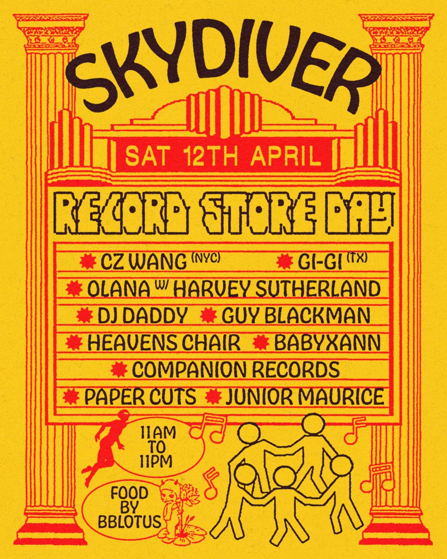 Promotional artwork for a Record Store Day event at Skydiver, a record shop and bar in Collingwood, Melbourne, featuring DJ sets throughout the day. The typography utilizes all-caps Hobeaux for most text, with Basic TM for “Record Store Day” and Offset TM for the date.
