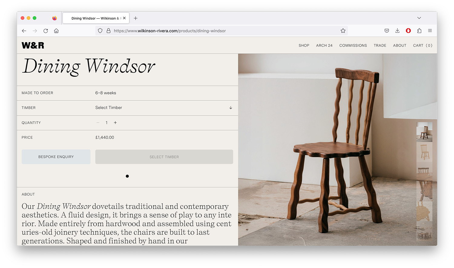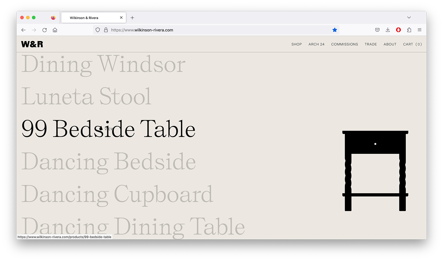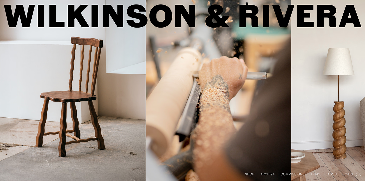 Wilkinson & Rivera is a London-based duo, formed by Grant Wilkinson and Teresa Rivera in 2020. Their collaboration extends to fine art, design, and furniture making. They strive to build long lasting pieces with a high level of craftmanship. The communication matters, designed by Thoughtful Standard, are set in Self Modern and Messina Sans, along with a logotype that’s either custom drawn or in an unidentified typeface.
