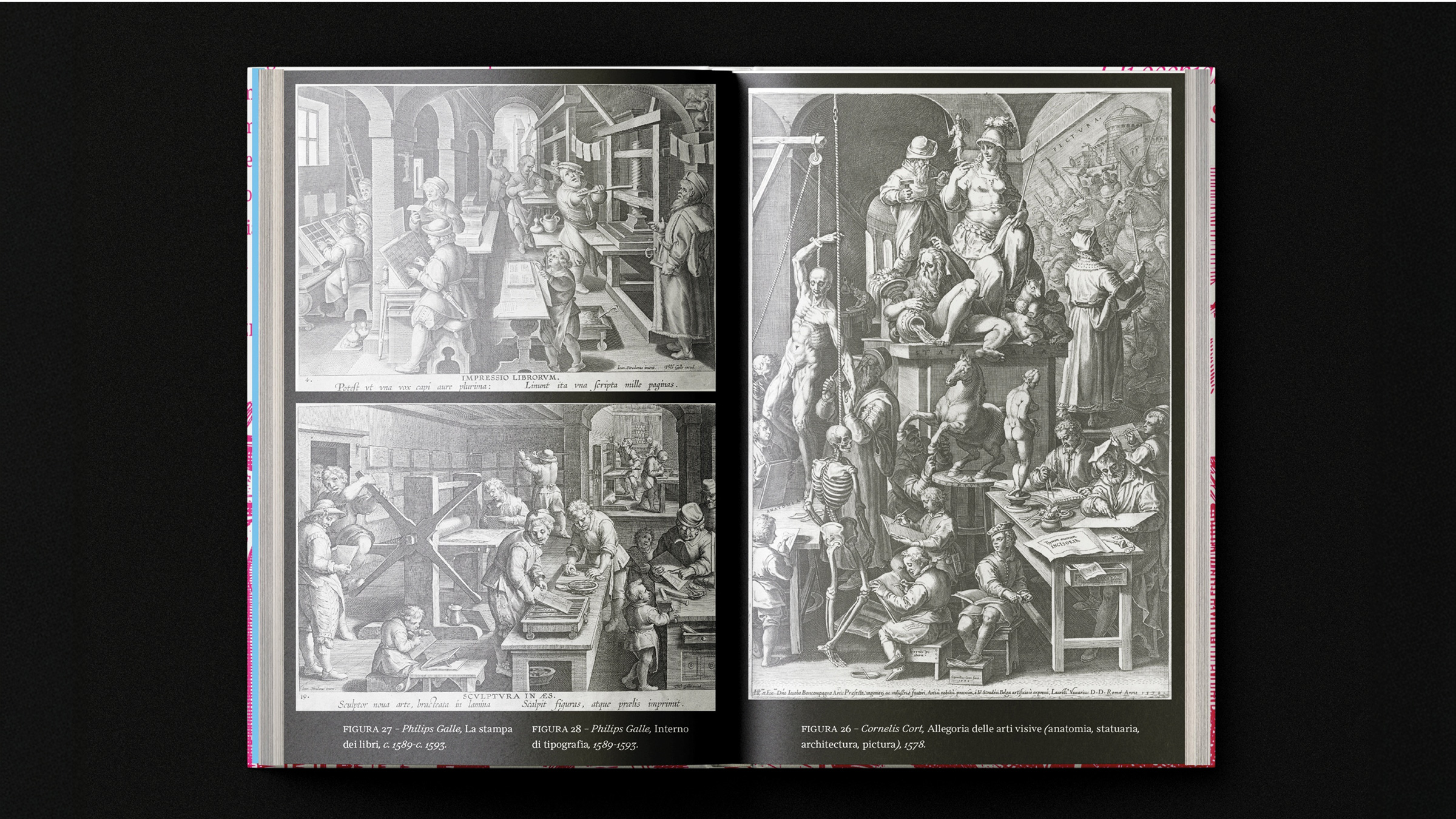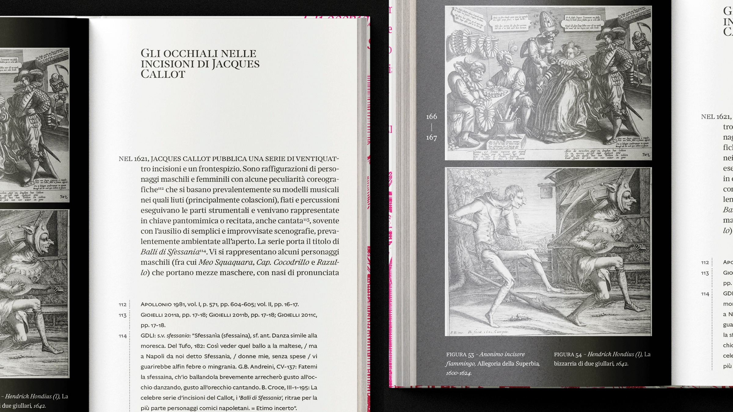 The graphic design focuses on a typographic composition rich in detail and peculiarities, enhanced by the characteristics of the Sorella font – designed by Luis Castellón and published by CAST – which recalls the writing of the 18th-century calligrapher Angela Baroni. Scotus Sans, designed by Giulio Galli, Riccardo Olocco and Luciano Perondi, is used for footnotes and a few other minor details.