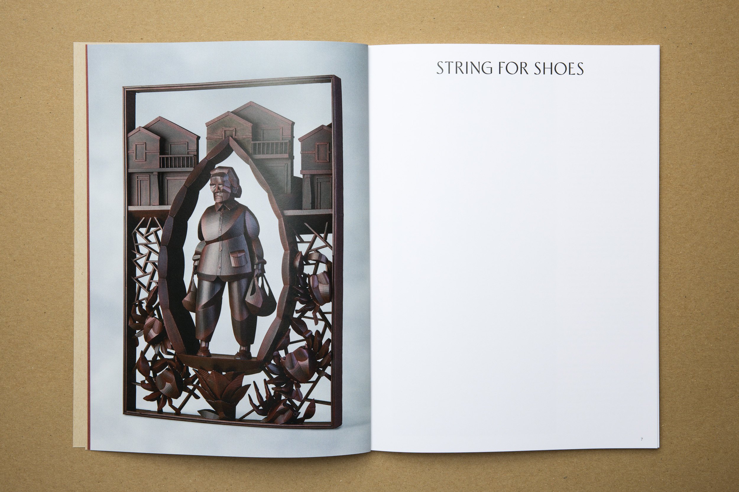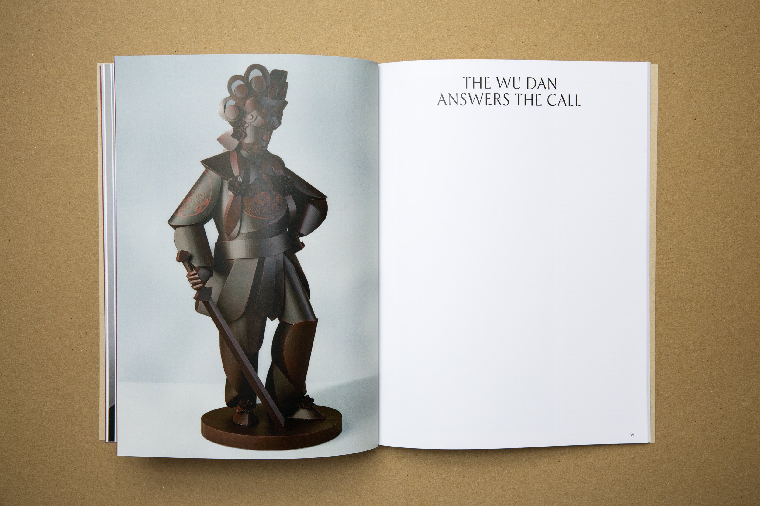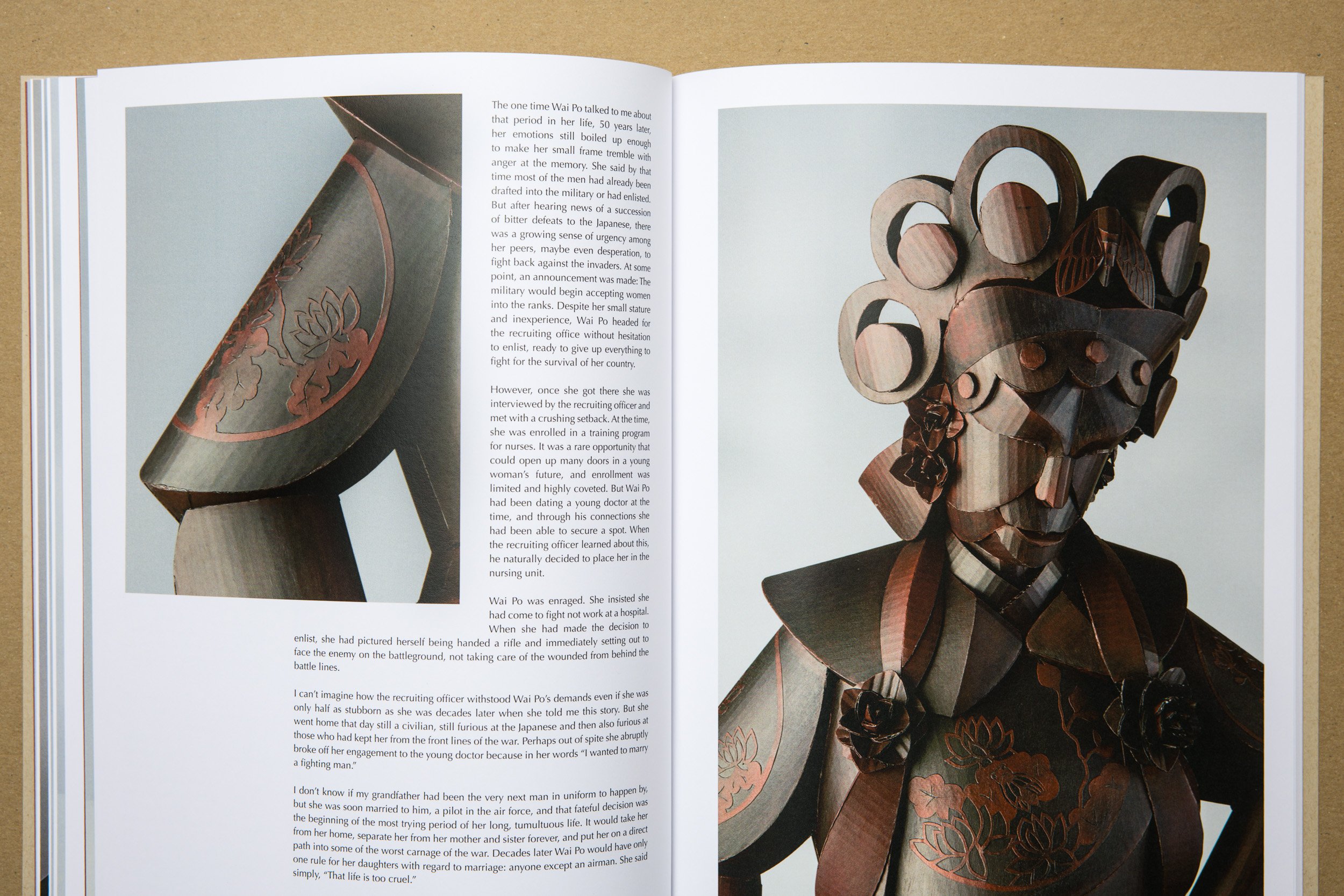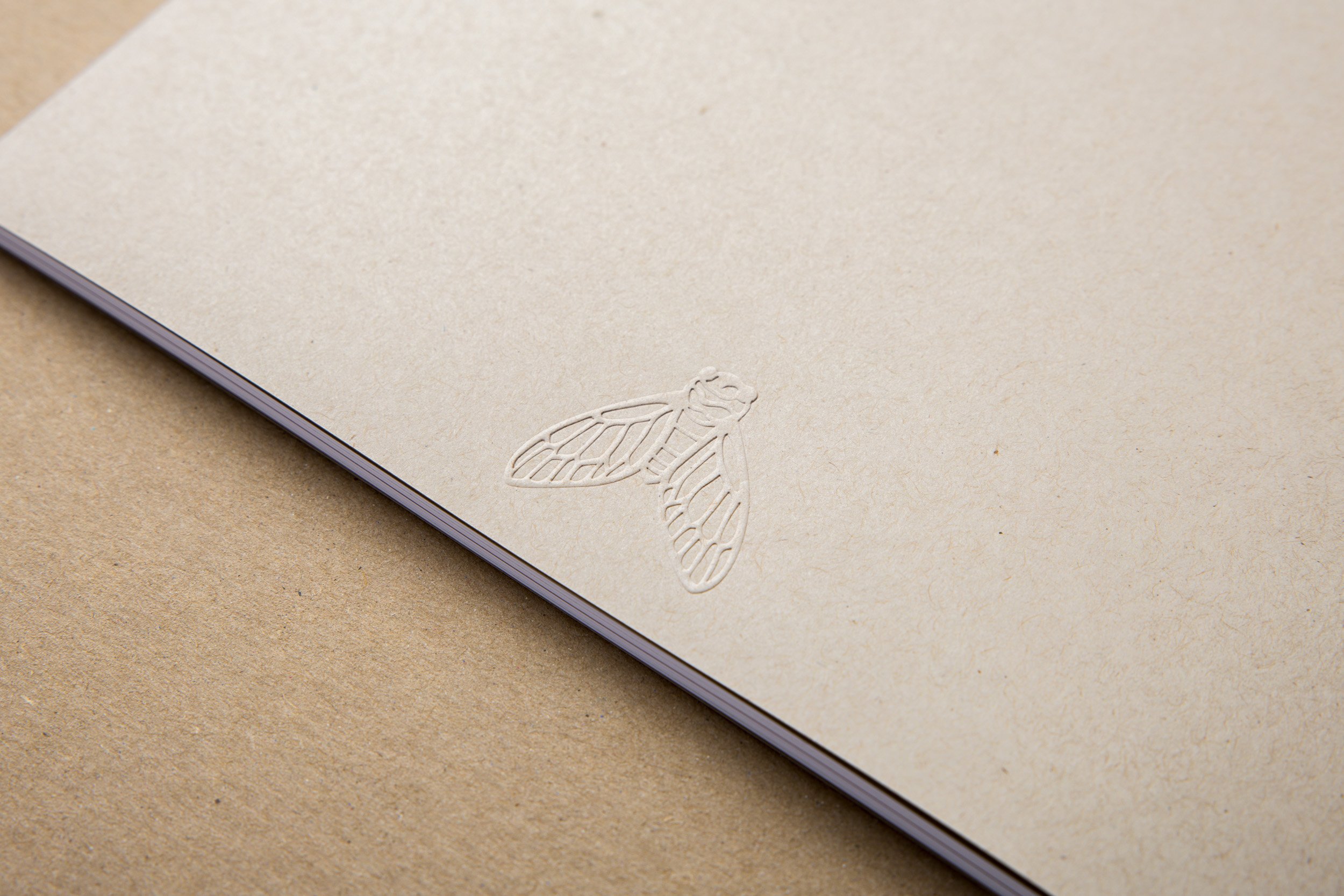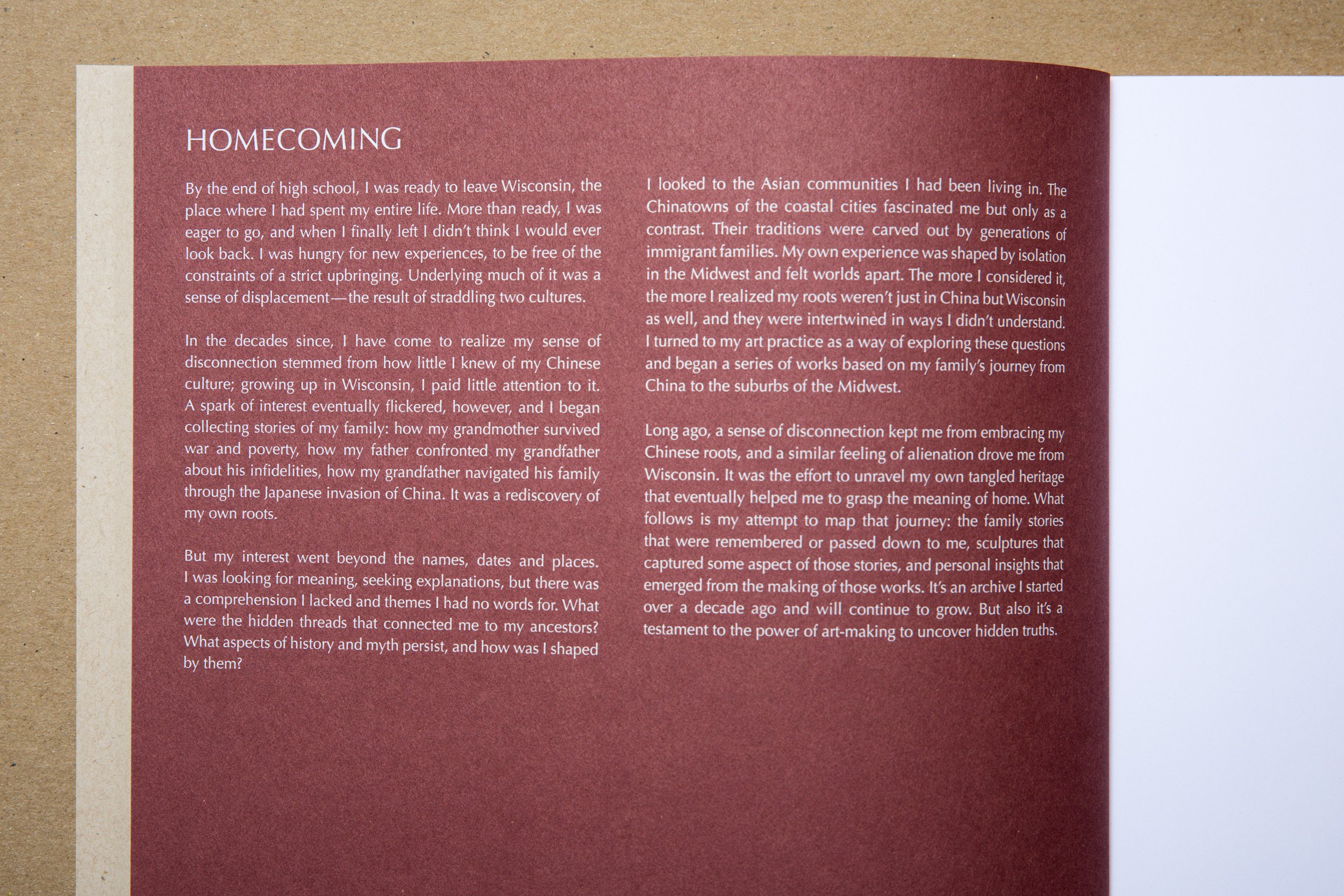 The book takes its cues from Warren’s process. The cover features a view of the sculpture The Road Leads Home printed on a natural paper similar to cardboard. Two essays about Warren’s background and artistic process are produced in white ink on dark red paper to separate them out from the art-specific essays. Details of sculptures interact with the text, which is framed with generous margins for readability. The back cover features an embossed cicada — a recurring element in Warren’s work.
