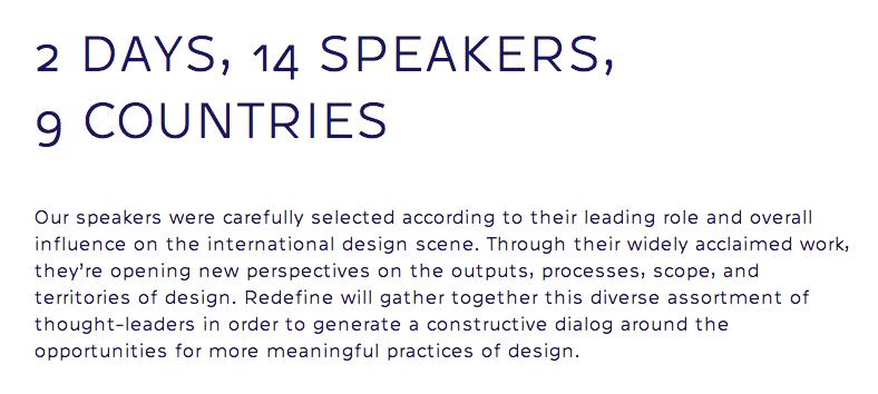 Redefine is a design conference which takes place in Budapest in early October 2014. The website uses the yet unreleased Westeinde by Adam Katyi (Hungarumlaut). This typeface started life as Adam’s Type and Media graduation project at the Royal Academy of Art in The Hague. Westeinde is special in that it is one of the very few sans serifs that come in optical sizes. For the Redefine Conference website, Viktor Suszter chose Westeinde Caption in two weights, paired with Teimer Semibold.