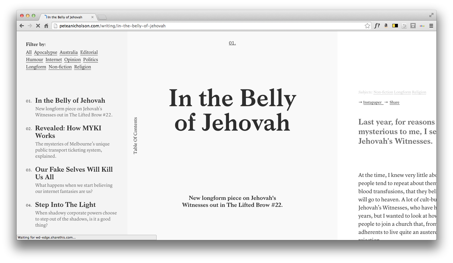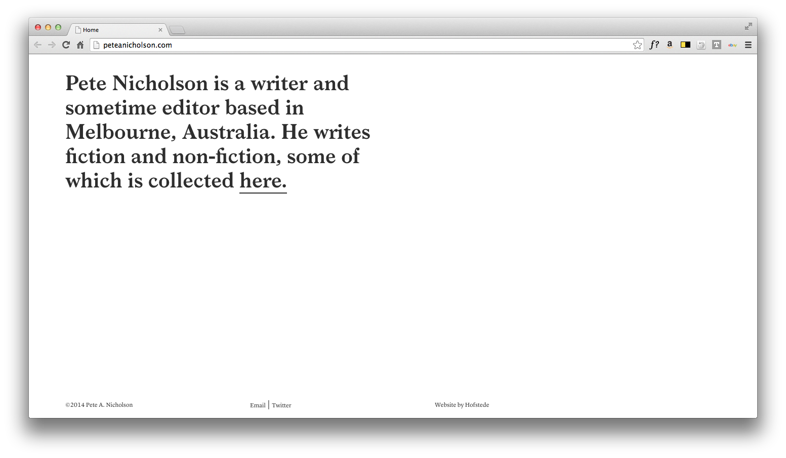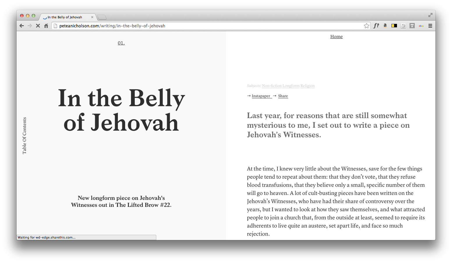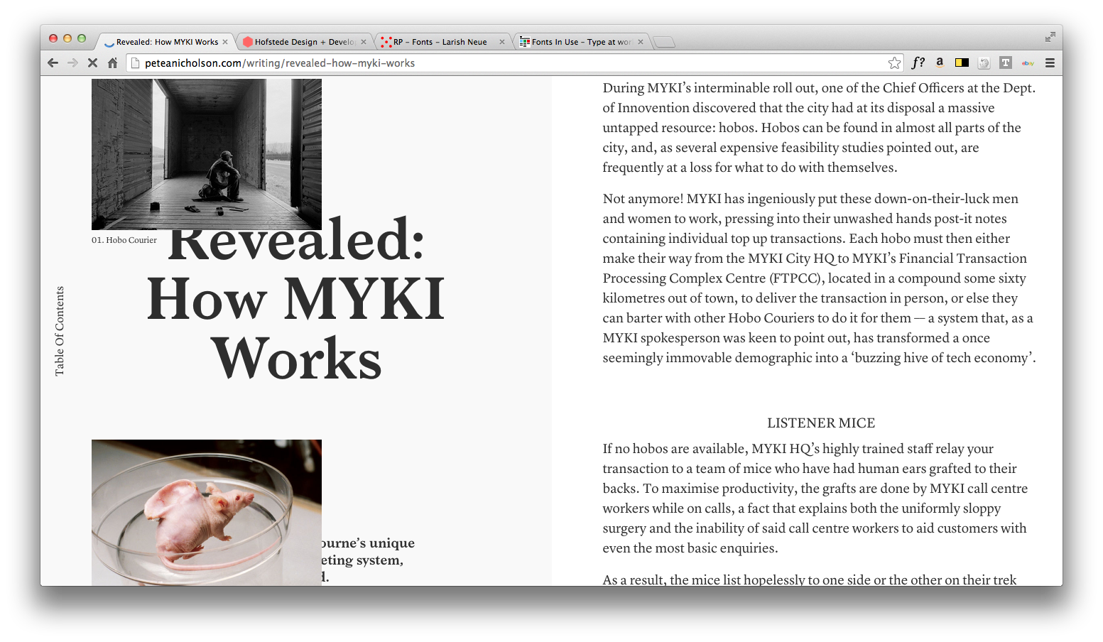Hofstede’s intuitive website design for writer Pete Nicholson aims to interpret the experience of reading a book on the web without adhering to obvious visual cues. The design also uses carefully considered typography, by using Radim Peško’s idiyosyncratic Larish Neue for header text and Commercial Type’s workhorse Lyon for body text.