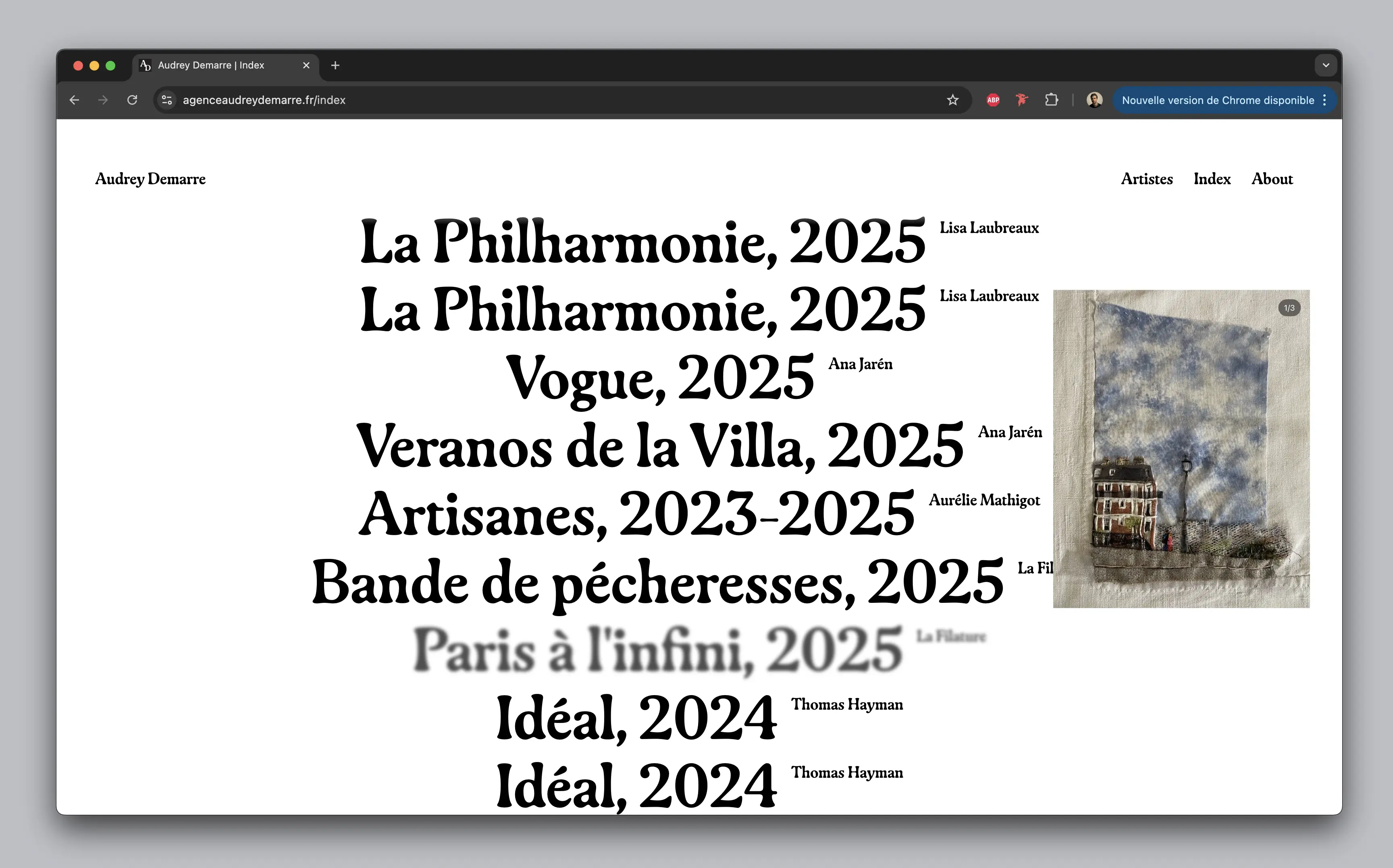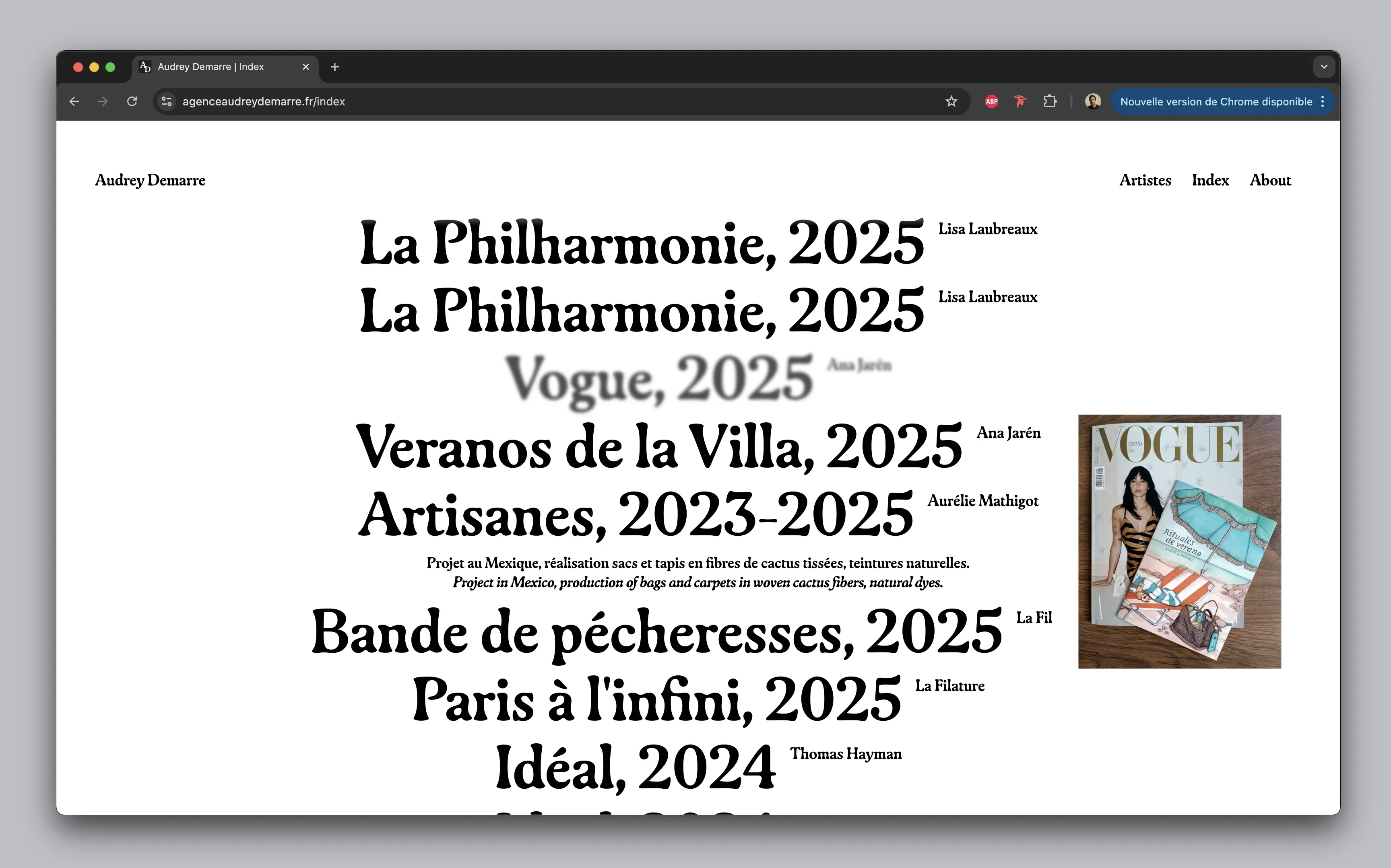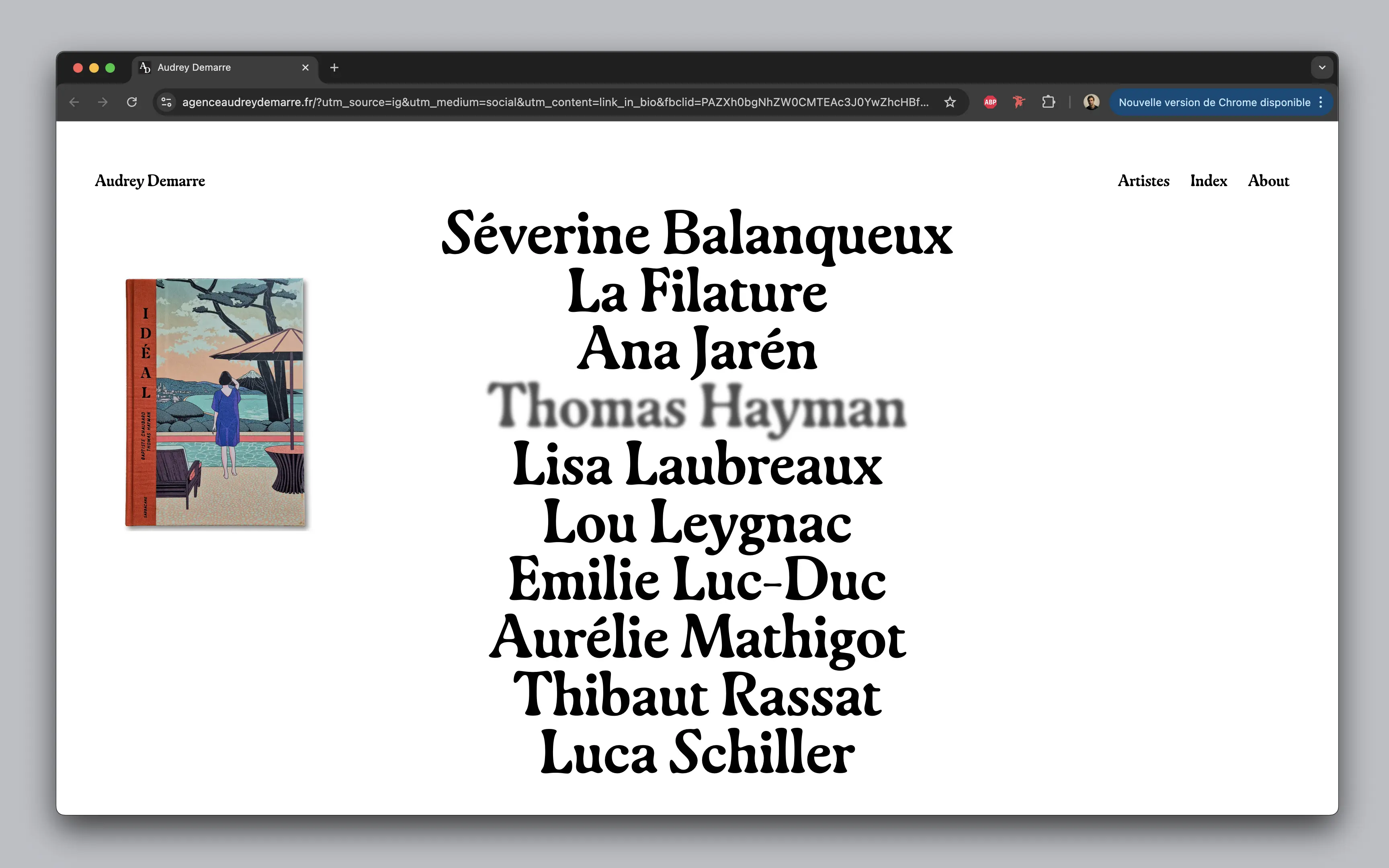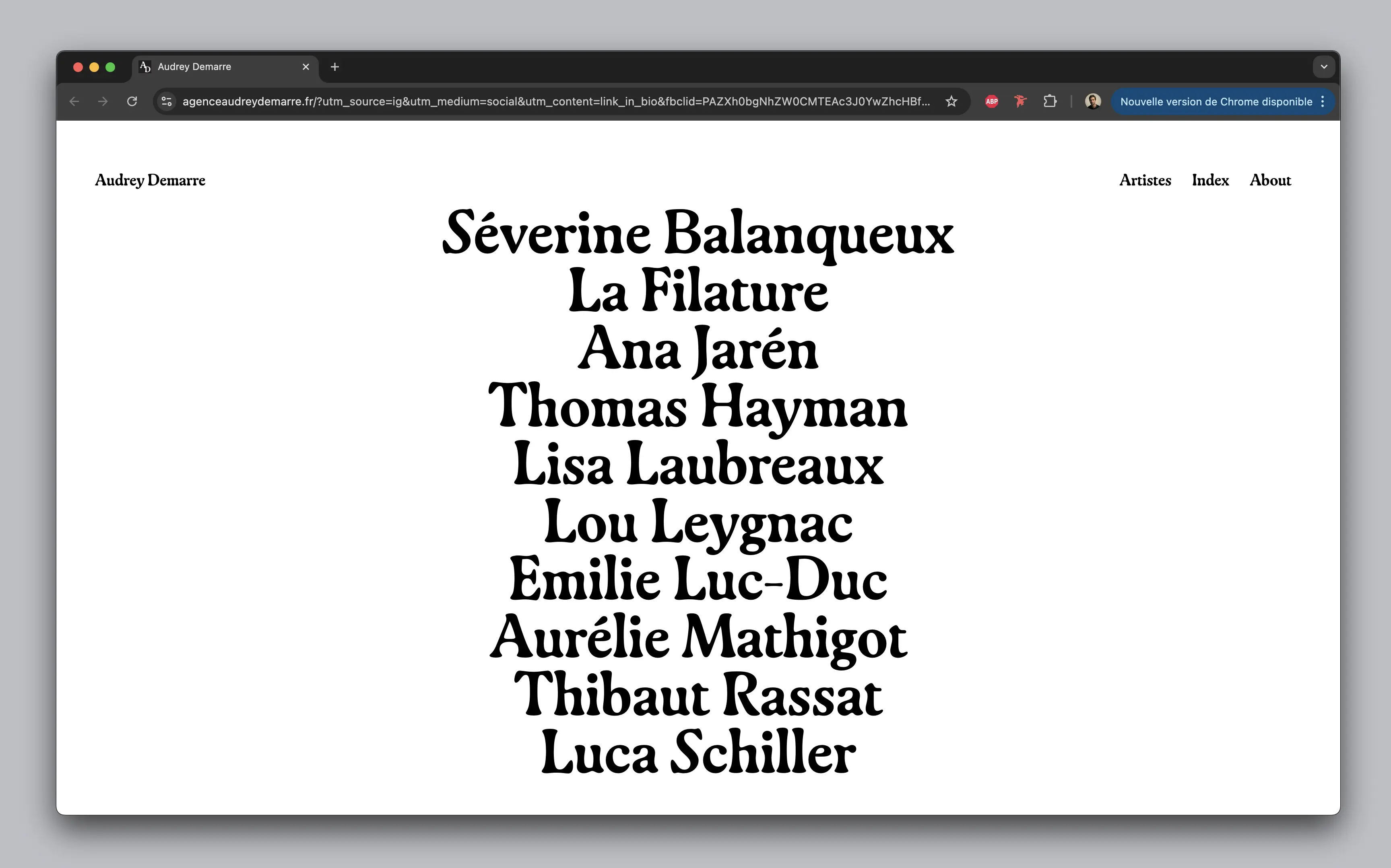 Agence Audrey Demarre Contributed by WrittenShape Type Foundry on Feb 10th, 2026. Artwork published in circa January 2026. Source: agenceaudreydemarre.fr Audrey Demarre. License: All Rights Reserved. Gaya in use for the visual identity and website of the artist agent Audrey Demarre. The identity is based on a unique typeface, conceived as a link between different artistic worlds. Design by Maison Solide with Lisa Manus. Code by Élie Quintard. Source: agenceaudreydemarre.fr Audrey Demarre. License: All Rights Reserved. Source: agenceaudreydemarre.fr Audrey Demarre. License: All Rights Reserved. Source: agenceaudreydemarre.fr Audrey Demarre. License: All Rights Reserved. Source: agenceaudreydemarre.fr Audrey Demarre. License: All Rights Reserved. Source: agenceaudreydemarre.fr Audrey Demarre. License: All Rights Reserved. Source: agenceaudreydemarre.fr Audrey Demarre. License: All Rights Reserved. Typefaces More about GayaGet Gaya Formats Web (5722) Branding/Identity (8626) Topics Services (1581) Art (4790) Designers/Agencies Maison Solide (14) Lisa Manus (1) Tagged withtalent agencies (17)identities (2437)websites (3661)one typeface family (1709)italics (743)menus (UI) (586)center-aligned text (1964)hover effects (45)blur effects (138)lists (310)multilingual (2712)French (language) (2605)English (language) (2520) Artwork location France (2916) Paris (1362) In Sets Post a comment Name Email – will not be published Website Your response Submit Comment More Gaya in use Ckottwitz Design websitec. 2025Colleen KottwitzContributed by WrittenShape Type Foundry Superior Merchandise Company2021Superior Merchandise CompanyFelicity JonesContributed by WrittenShape Type Foundry Mulsori2024Frame BuildersContributed by WrittenShape Type Foundry Sponsor More in Services Alphabet Type logo and website (2015)2015Stephan MüllerPhillip AcsanyContributed by Stephen Coles Making Wavesc. 2014Making WavesContributed by Webtype Viatel2018GrandsonKillian WalshJake HeaveyContributed by Killian Walsh Gifyyy2016unknownContributed by XYZ Type More in Web Triënnale Brugge website2023GlueContributed by Production Type Studio Forma 962018Uniforma StudioContributed by Swiss Typefaces Alivac. 2024KINDContributed by Emil Olsen Venables Bell & Partners website2013Venables Bell & PartnersContributed by Webtype More Fonts In Use Maser Crisis Murals2010MaserContributed by Underware Staff Pick Natalie Wildgoose – Come Into the Garden EP cover and gig posters2025OutlierContributed by Oliver Deans Staff Pick Oh! Calcutta! paperback1969Stephanie TevonianContributed by henry cruickshank Staff Pick Bickel–Dafi exhibition poster2025Dafi KühneContributed by Dafi Kühne Staff Pick