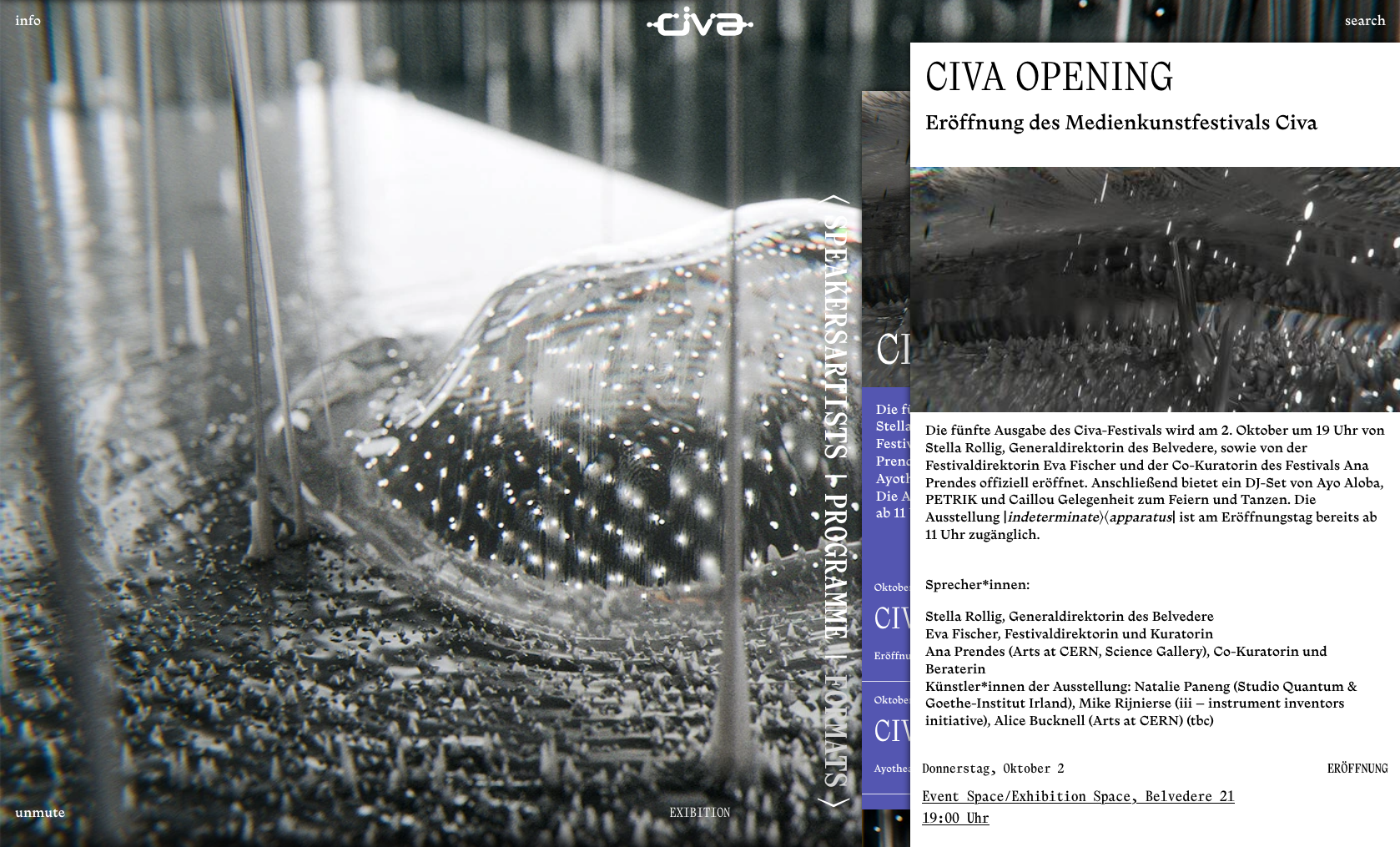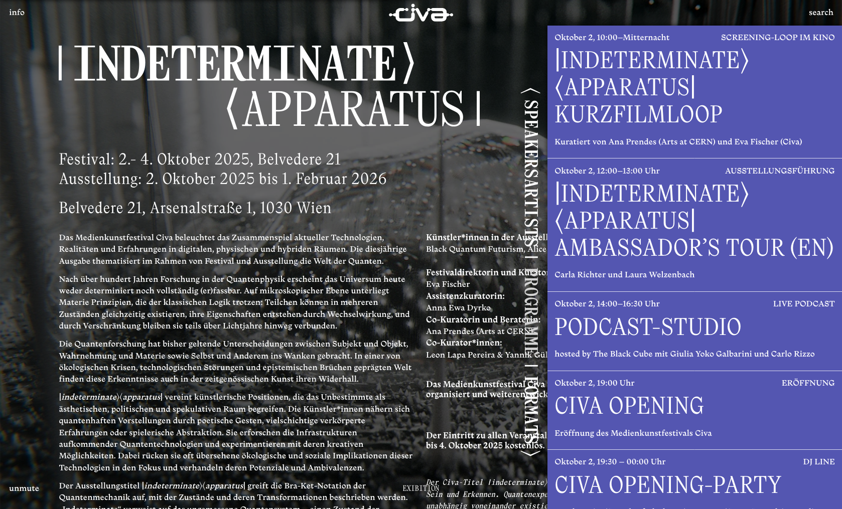 The Civa media art festival highlights the interplay between contemporary technologies, realities, and experiences across digital, physical, and hybrid spaces. This year’s festival and exhibition, |indeterminate⟩⟨apparatus|, focuses on the realm of quantum physics. […] The artists engage with quantum concepts through poetic gestures, multi-layered embodied experiences, and playful abstraction. The festival is hosted by Belvedere 21.