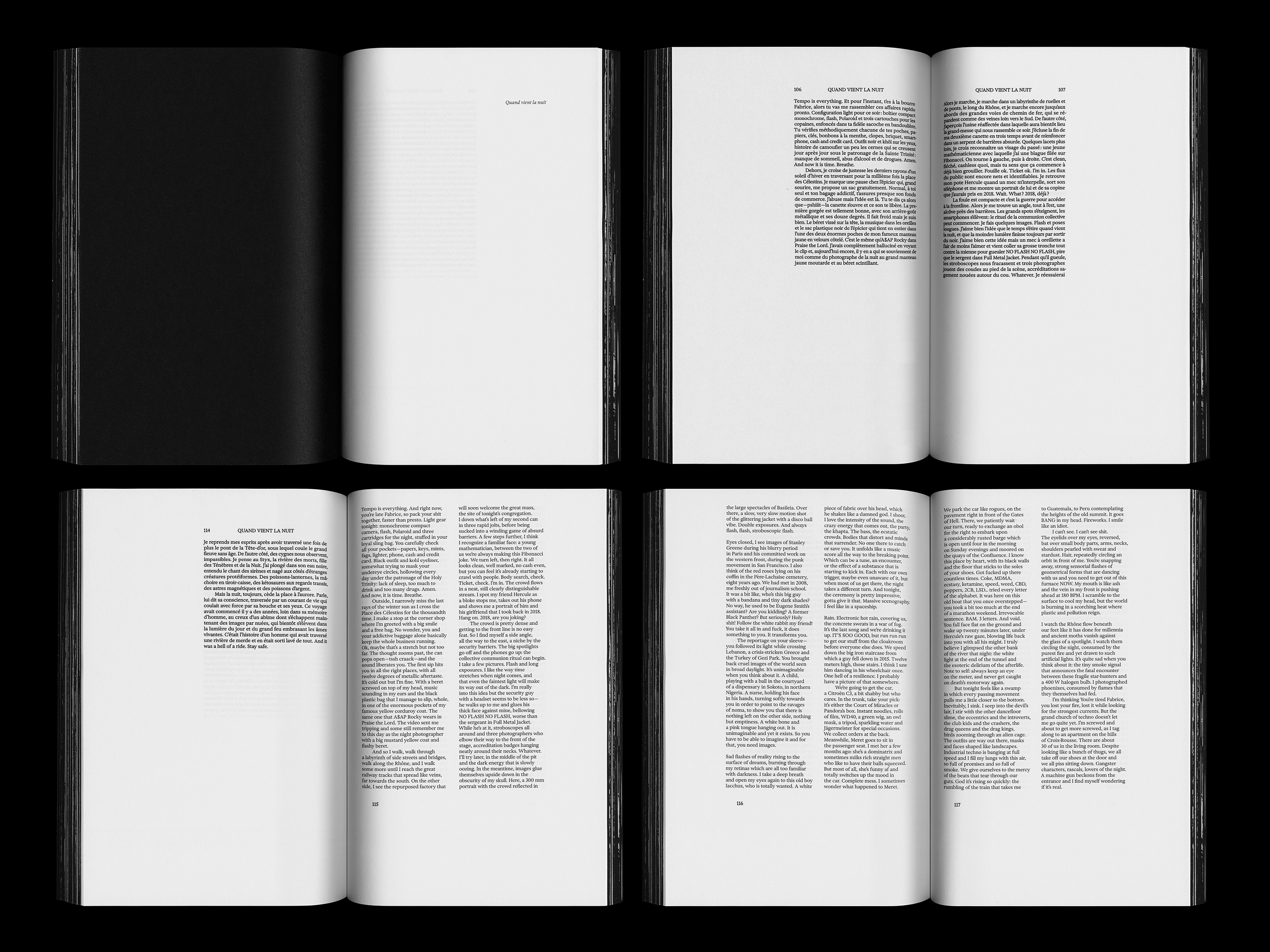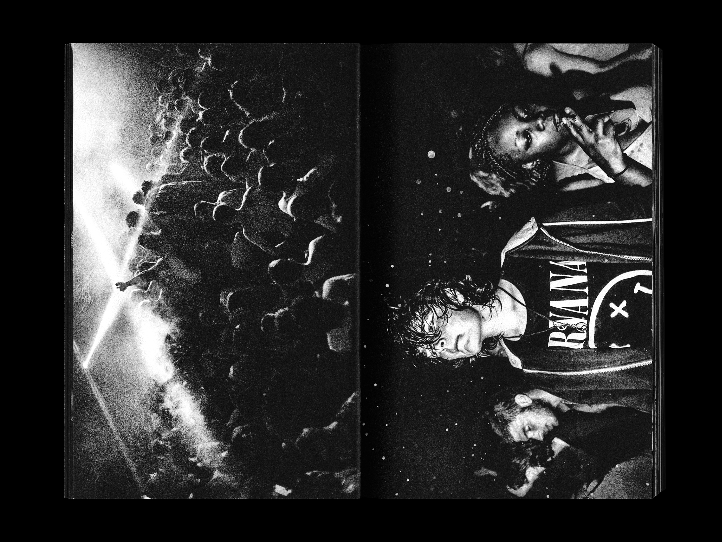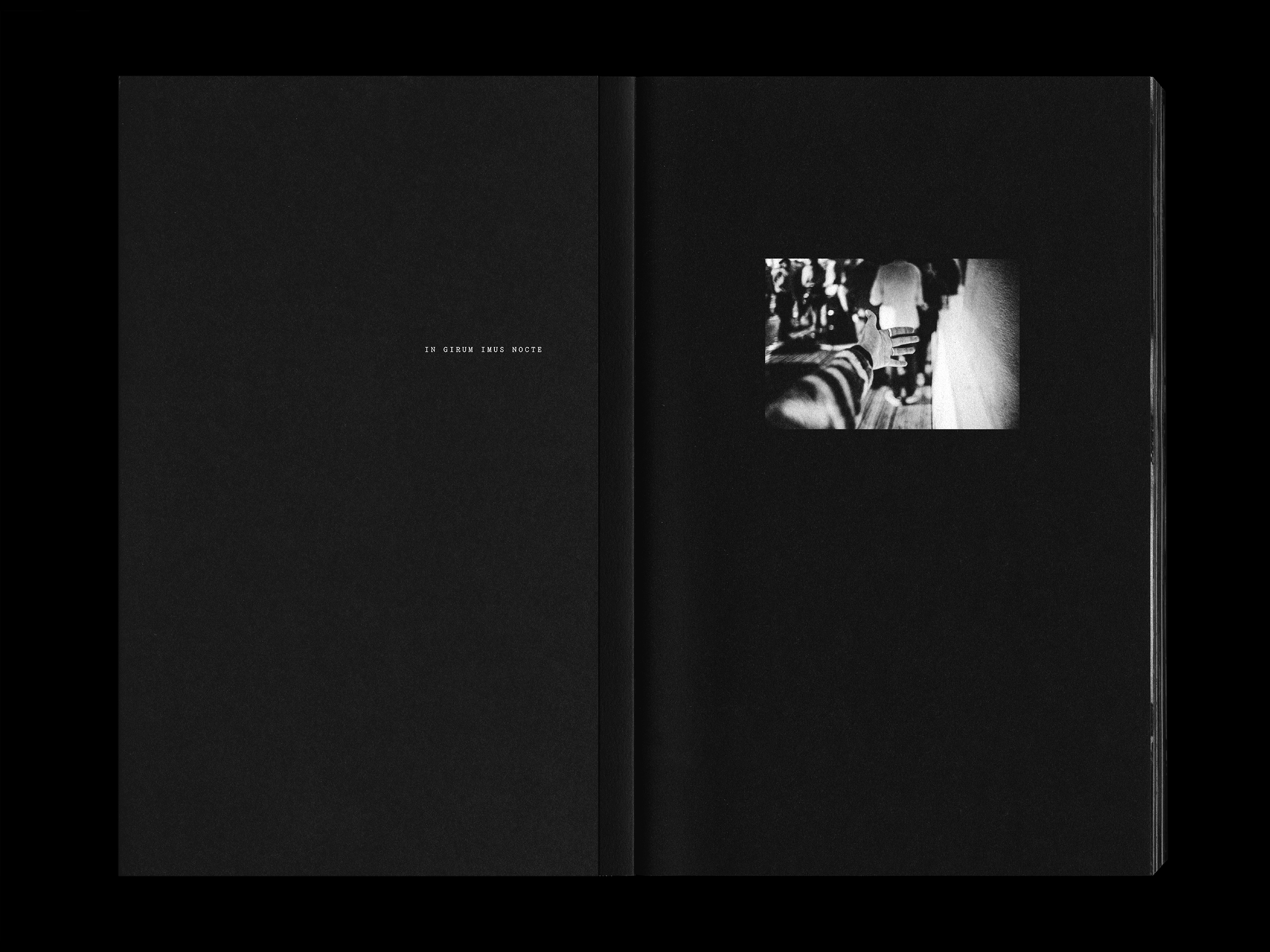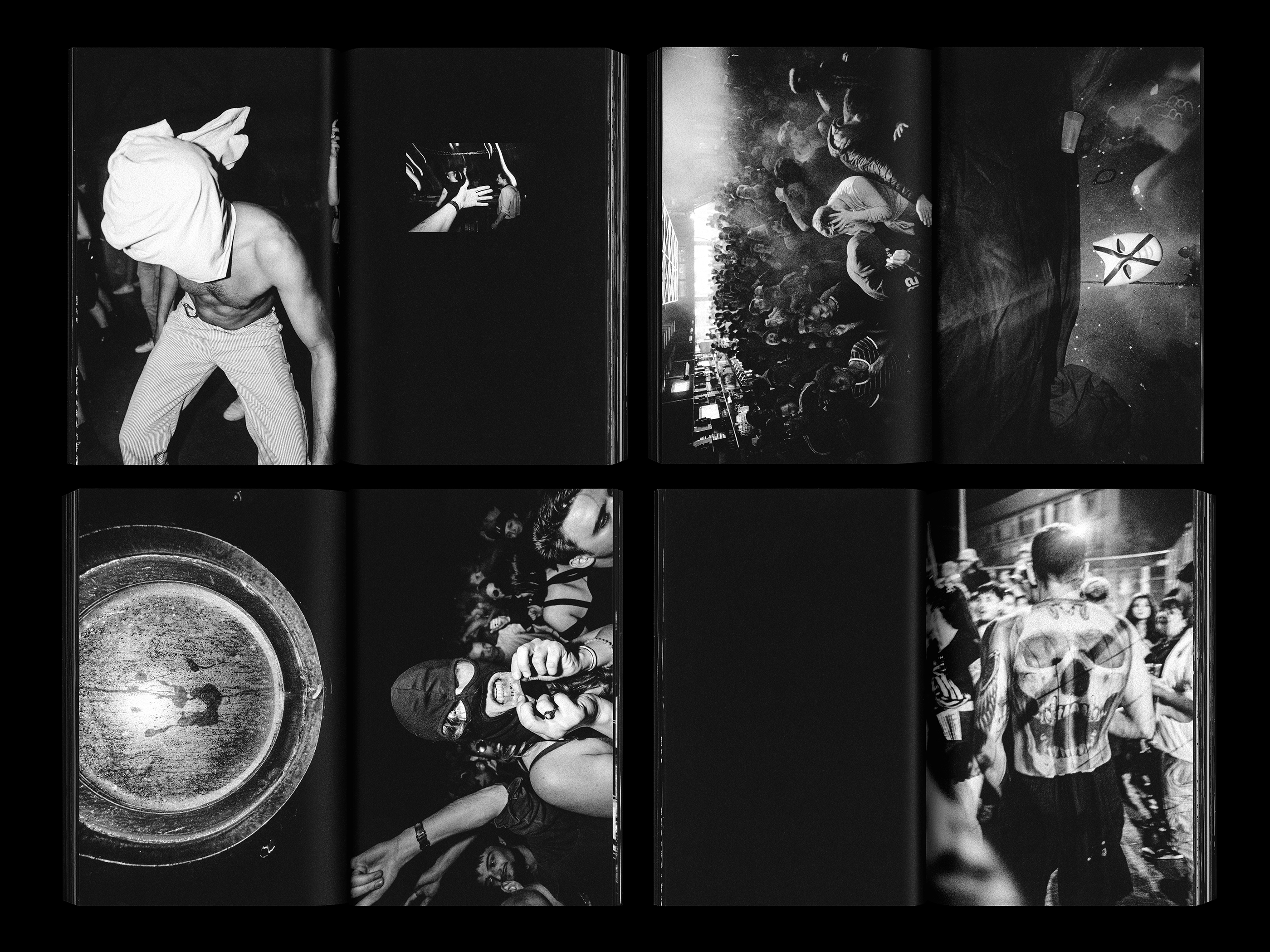 The interior of the book is dense, combining a large number of photographs with black pages that immerse the reader in the darkness and agitation of the nightlife scene. The photographic sequence is interrupted by a long central text (the only white pages in the book) set in Exposure by Federico Parra Barrios (205TF) in a sober and classic layout, designed to contrast with the visual tension and rhythm of the photographic sections.