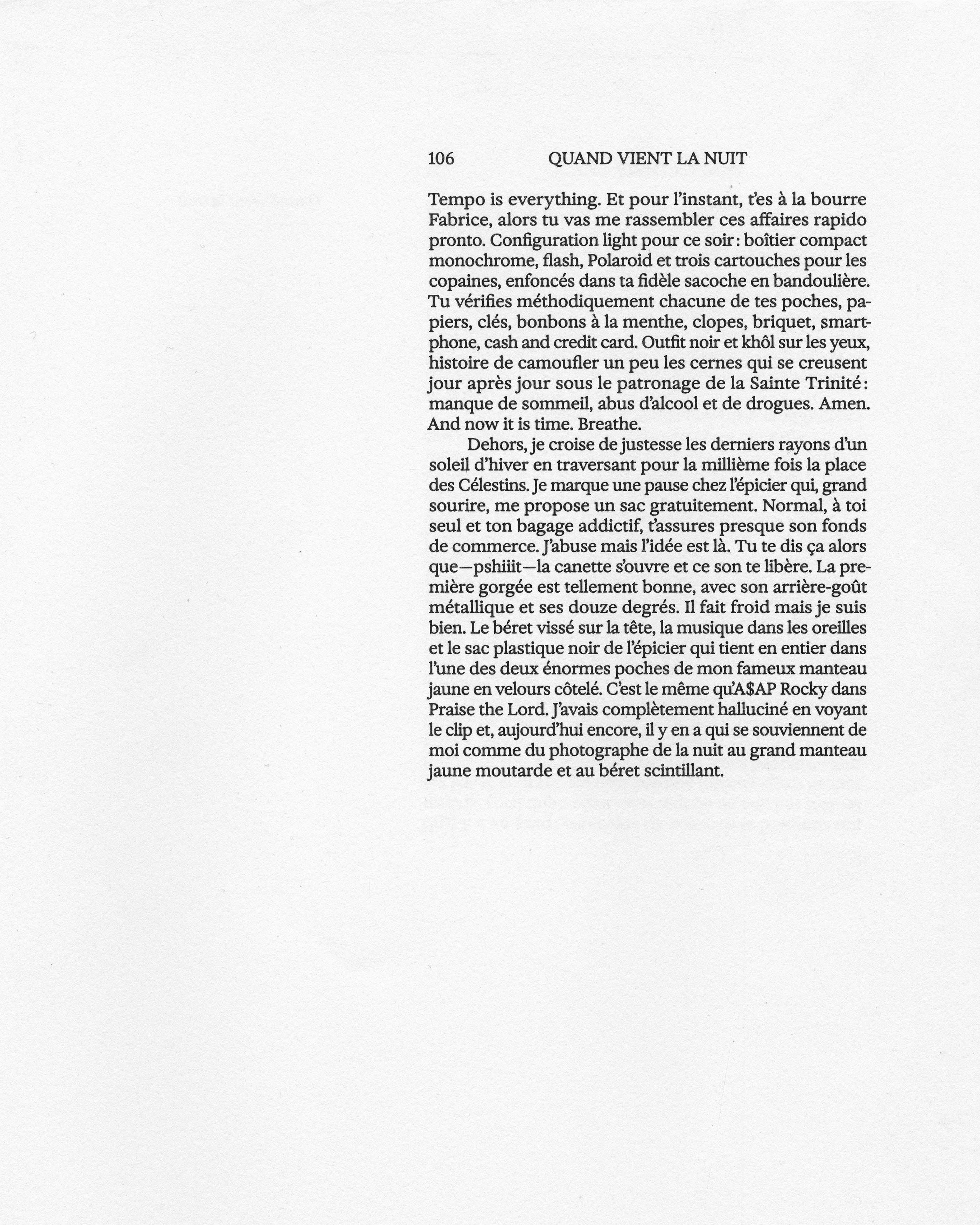 The story of this book begins where daylight ends: when night falls. It is the story of a headlong flight, far from the diurnal world and its harsh, singular, zenithal light. For as dusk descends, light sources multiply; celestial bodies and artificial glows transfigure space and time. Then he dives into these troubled waters, drawn in by the dark energy that runs through and transforms him. He does not know it yet, but he has embarked upon a journey that will last seven years. A voyage to the end of the night, no doubt, intense and initiatory, during which he will search for love in all the noises of the world, hunting for fragments of the real in the realm of dreams and masks. But the night, full of promise, always yields to dawn. And in the end, it is photography itself, the art of writing with light, that will allow him to emerge from the dark.