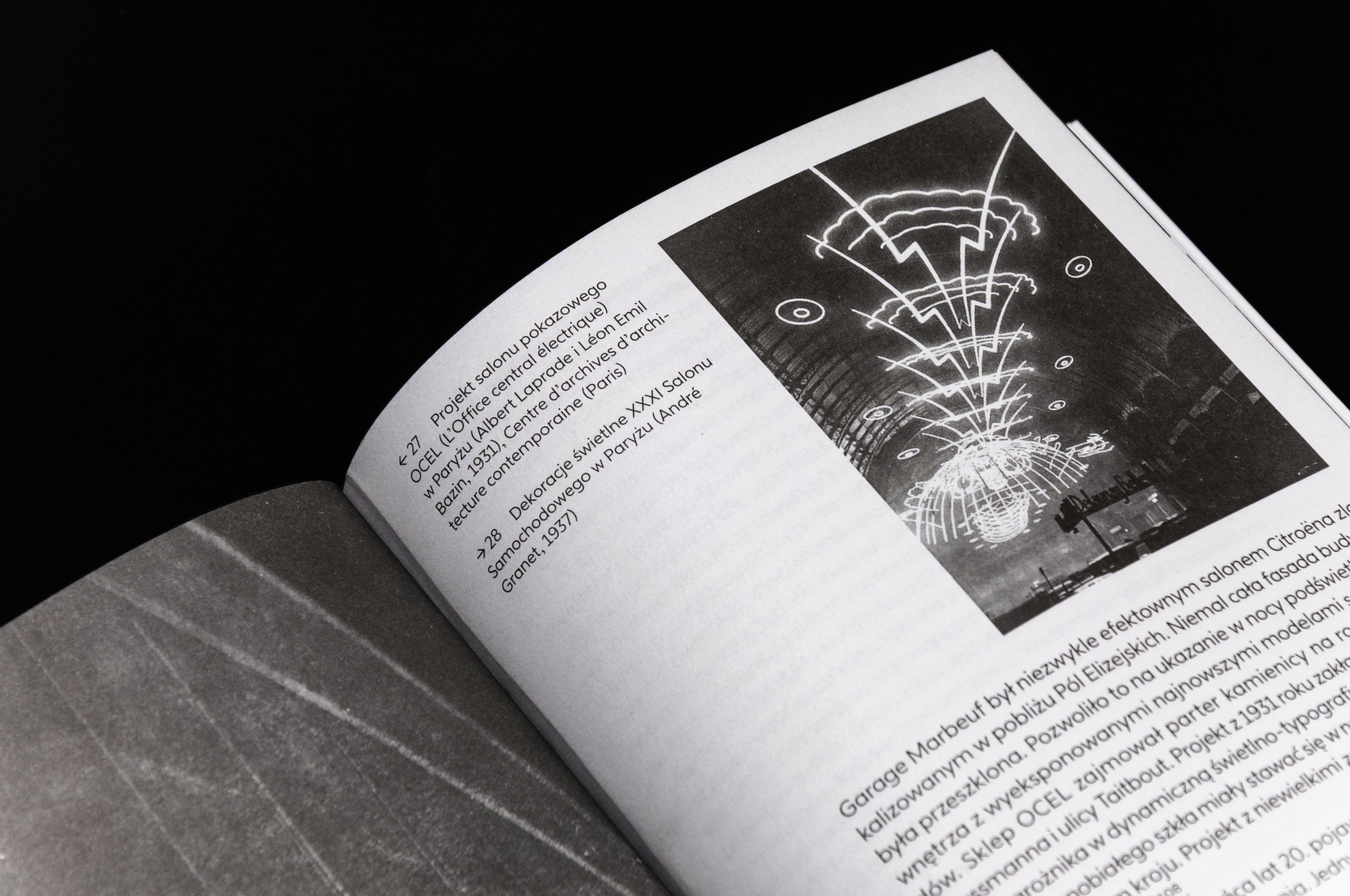 The the goal of Kuba Maria Mazurkiewicz was to design a publication in harmony with the featured iconography. The monochromatic archival visuals determined the black-and-white, minimalist character of the book, while the yellow, appearing only on the cover, references the glow of the illuminated glass façades and building interiors.