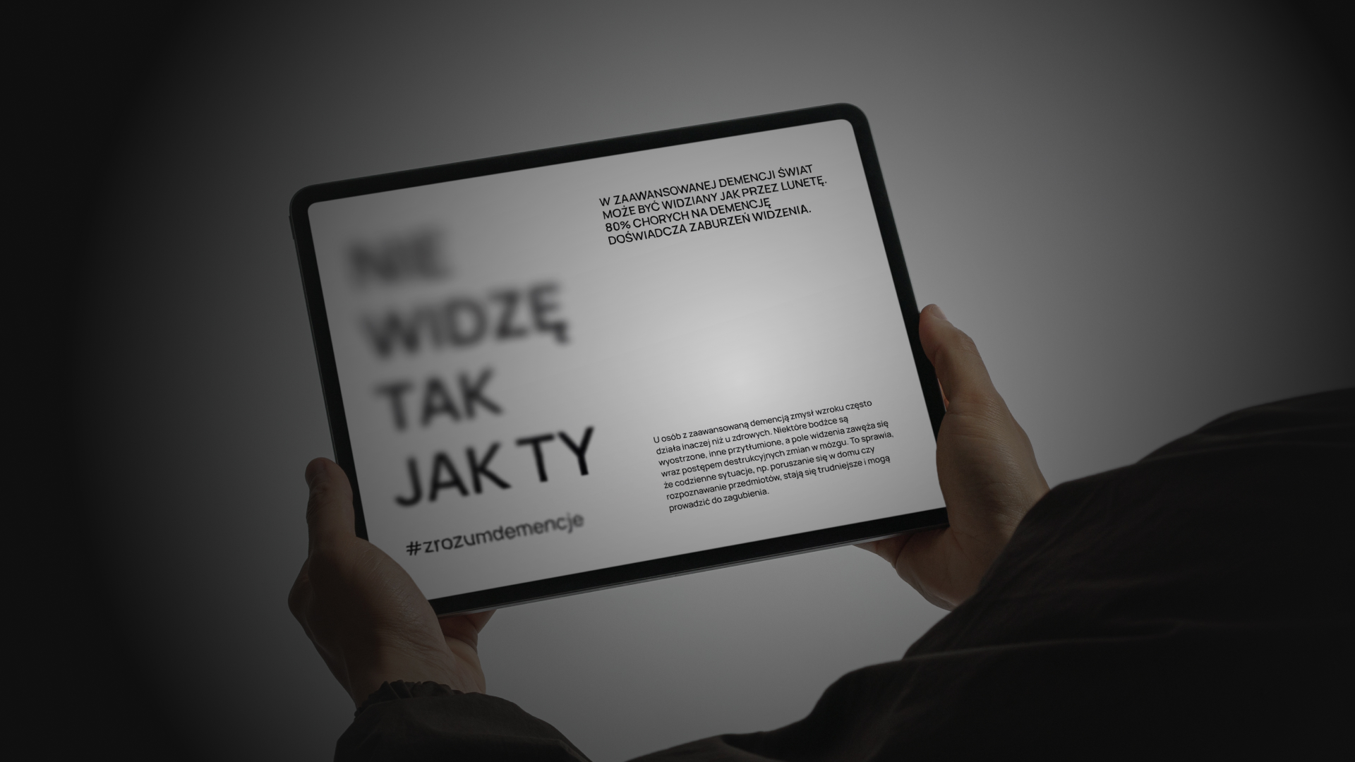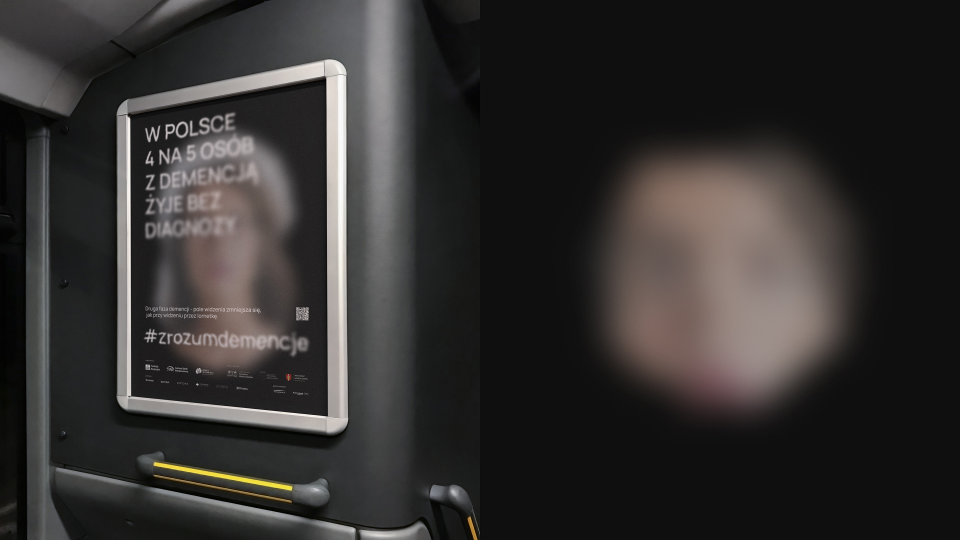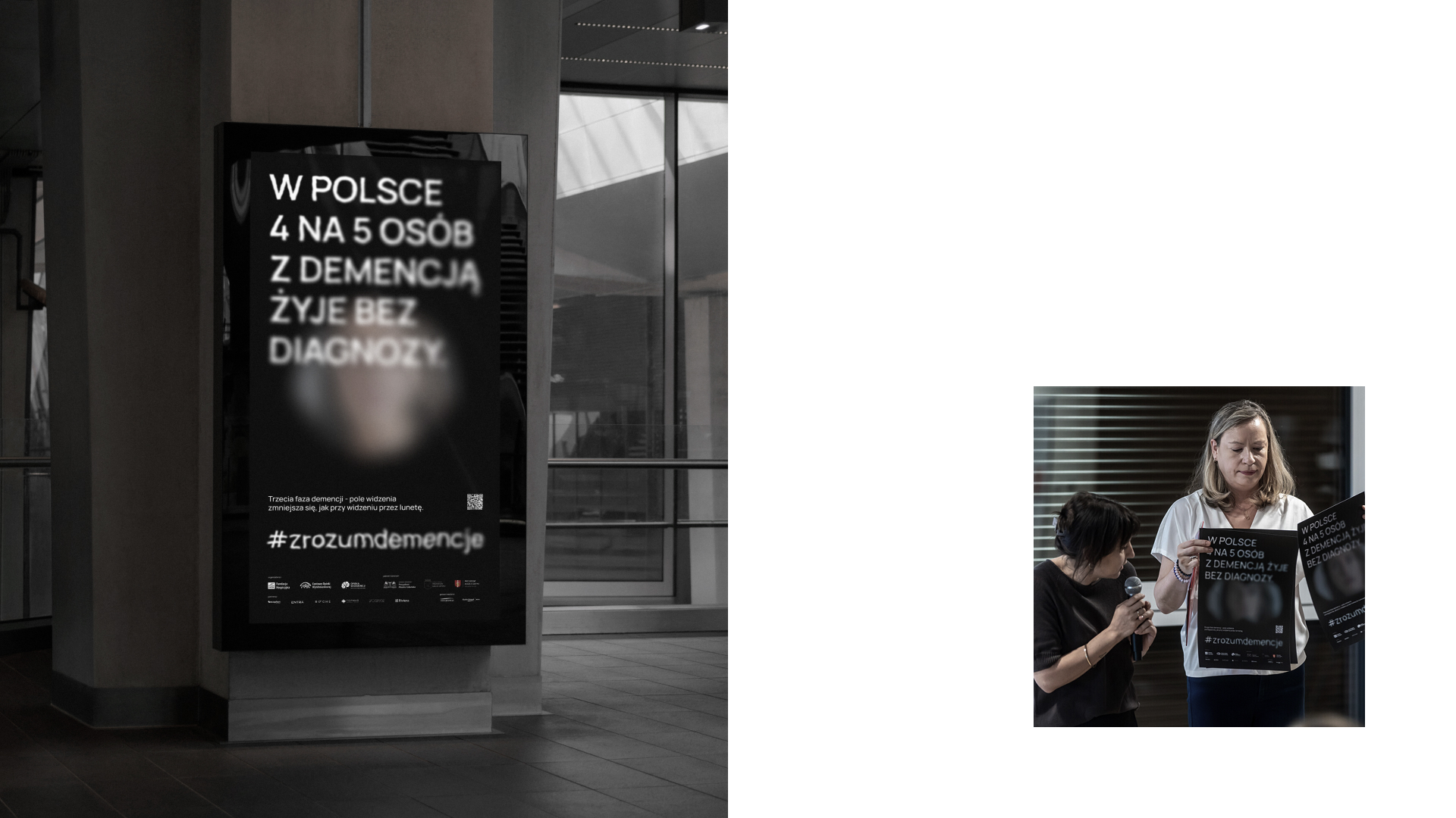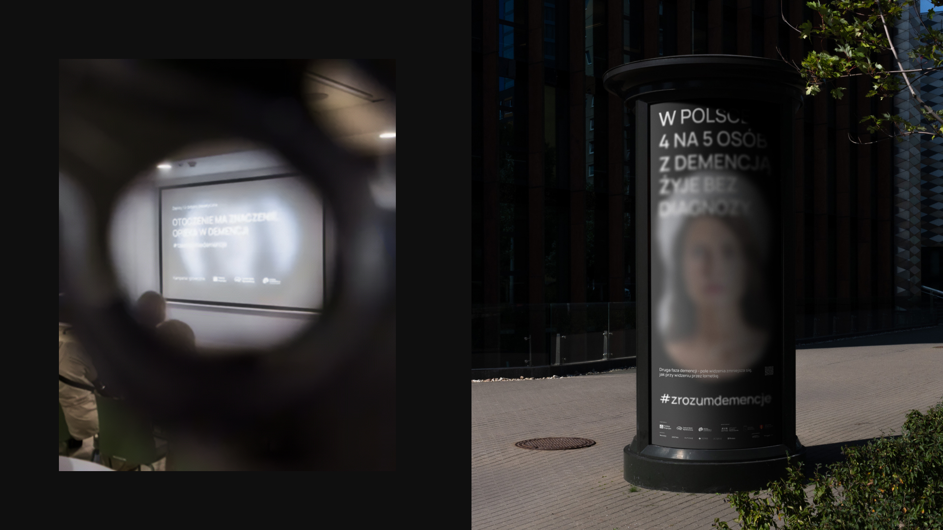 During the design process, attention was paid to the elements prepared by the organizers, introducing participants to the experiences of people with dementia. Therefore, the visual key focuses on the phases of the visual field, which changes from vision similar to that seen through a diving mask to that seen through a telescope. This presentation of the problem, reinforced by large typography, was intended to intrigue people who might see these materials in public spaces, for example, as posters on advertising poles or as animations on public transport screens.