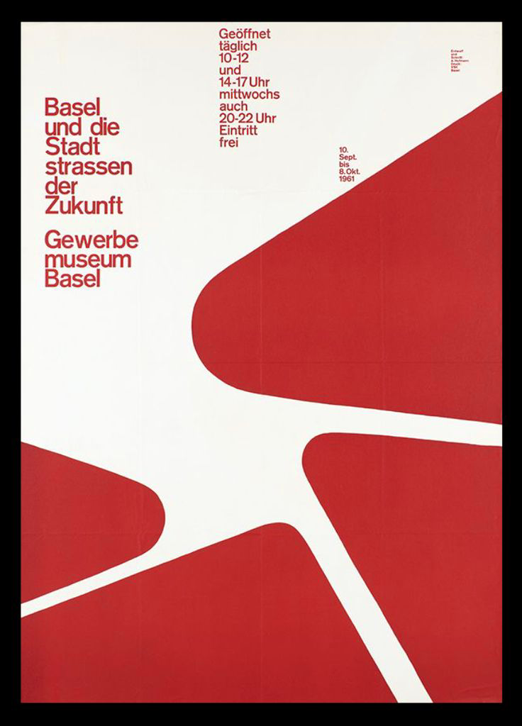 Armin Hofmann designed this 127×90 cm poster for a 1961 exhibition at Gewerbemuseum Basel entitled Basel und die Stadtstrassen der Zukunft (“Basel and the urban roads of the future”).